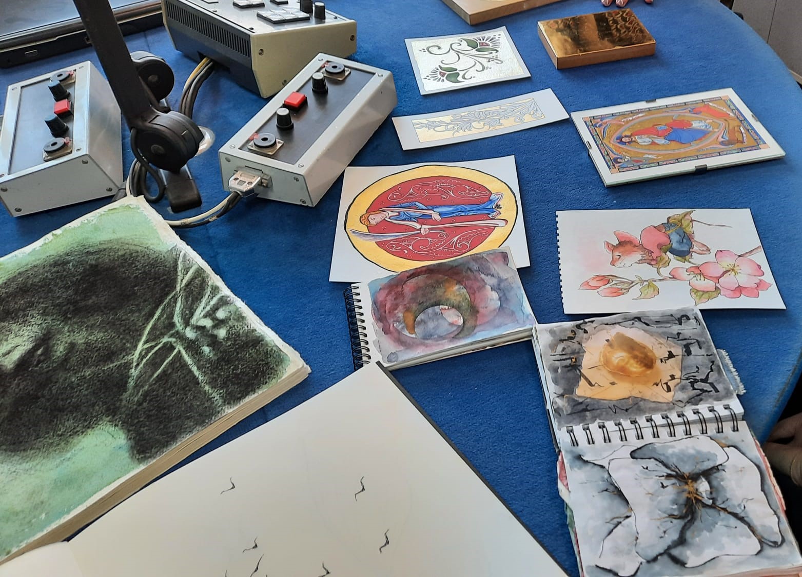 Mihaela Calotă: Eu am avut lucrarea de licență pe foiță de aur, s-a învârtit în jurul obsesiei mele pentru foița de aur. La un moment dat ajunsesem să afirm că atunci când nu știu ce să fac pun niște foițe de aur și cumva pot să merg mai departe. Se lucrează foarte greu, pentru că foița este foarte fină, foarte subțire. Are nevoie de un anumit suport care se prepară într-un anume fel. Îmi prepar singură acest suport. Pregătirea lui necesită o zi întragă, de dimineața până seara. Nu poți grăbi procesul pentru că atunci se crapă și atunci nu am realizat nimic. Este nevoie de un anumit spațiu, de un anumit mediu. Să fie cald și umed, de exemplu, pentru a obține un efect cât mai aproape de oglindă.
