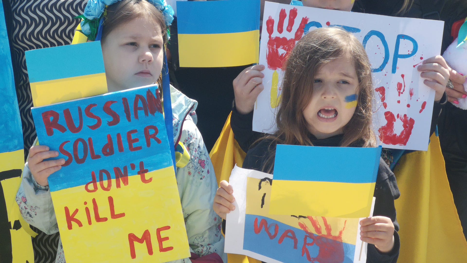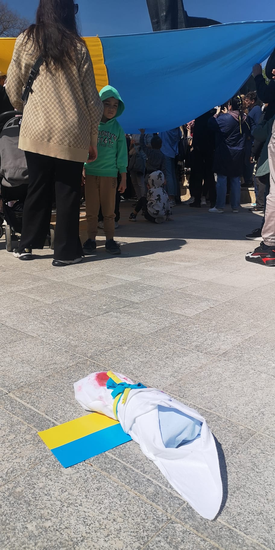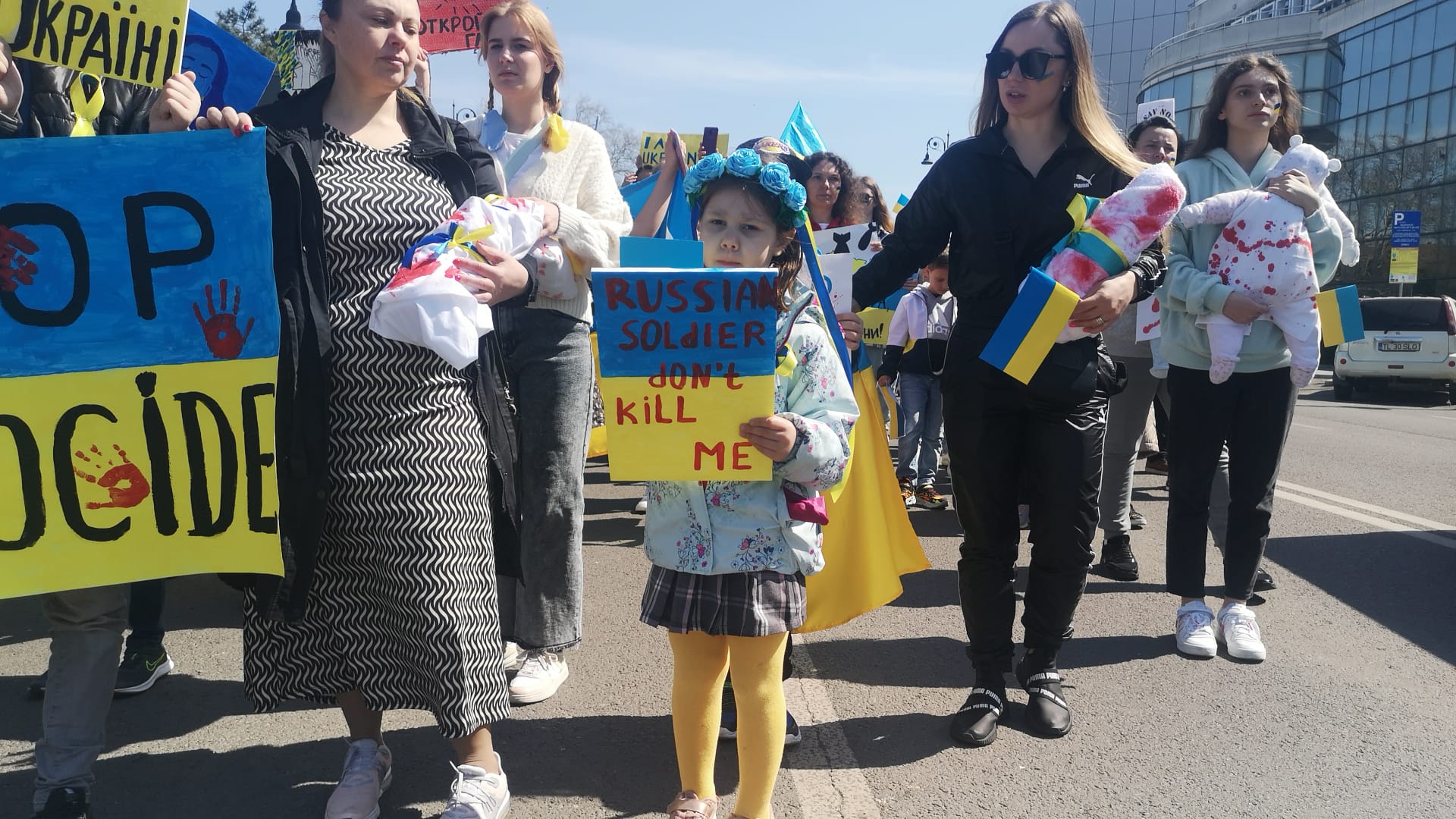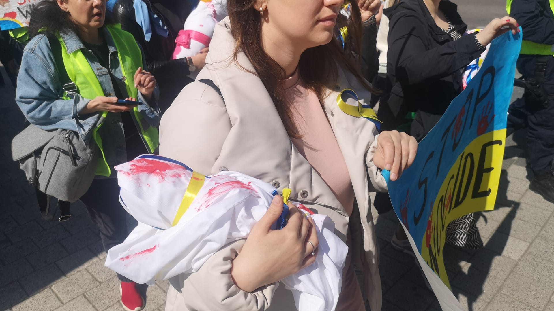 Unele femei poartă păpuși înfășate în scutece care par murdare de sânge, o trimitere la atrocitățile comise de armata rusă.