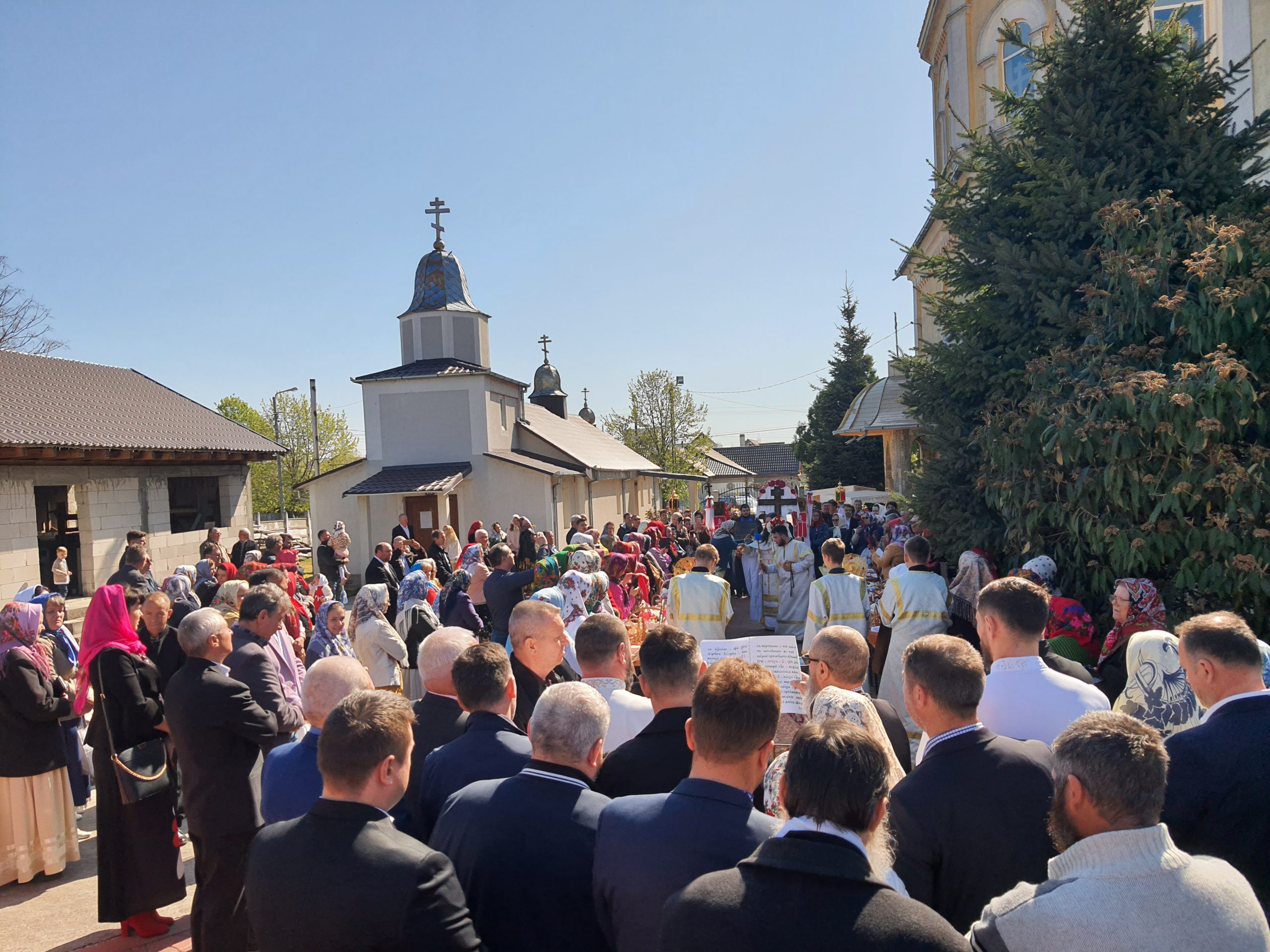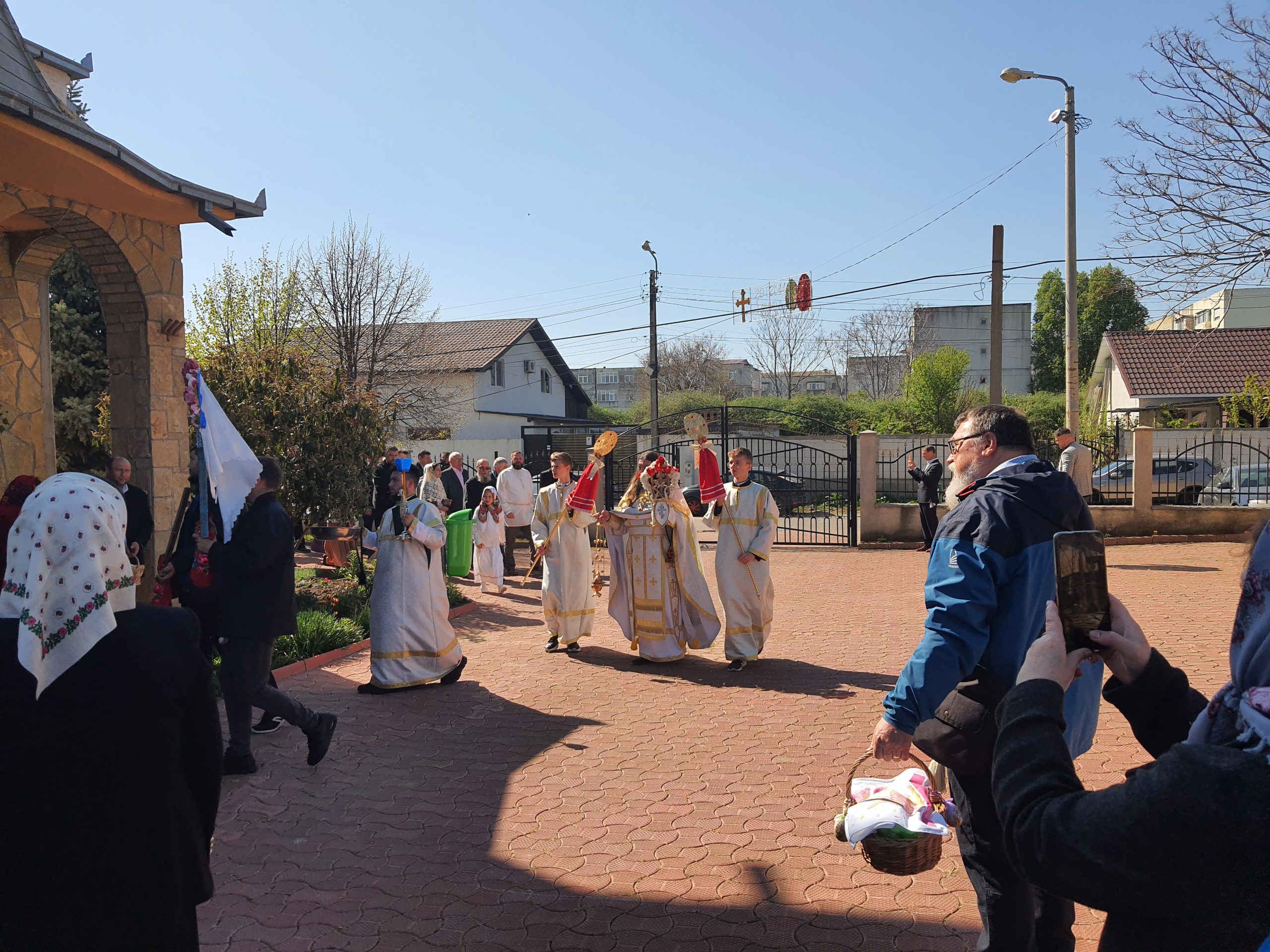 Momentul religios s-a încheiat cu sfințirea bucatelor. cozonac și ouă roșii.