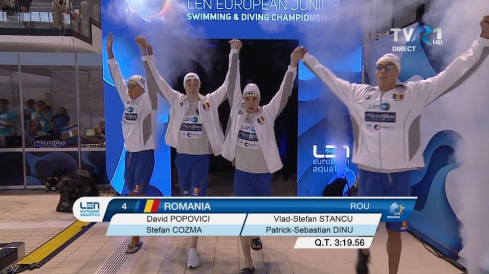 Performanță extraordinară pentru România la Campionatele Europene de natație pentru juniori de la Otopeni. Echipa formată din David Popovici, Vlad Stancu, Ștefan Cozma și Patrick Sebastian Dinu a câștigat aurul la 4x100m, după o cursă incredibilă.