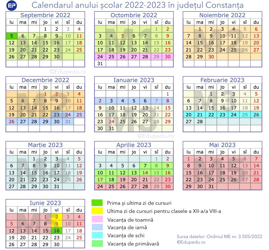 Pentru a putea fi la îndemână, Edupedu.ro a pus într-o formă simplă calendarul anului şcolar 2022-2023. Iată cum a fost structurat acesta pentru judeţele Constanţa şi Tulcea: