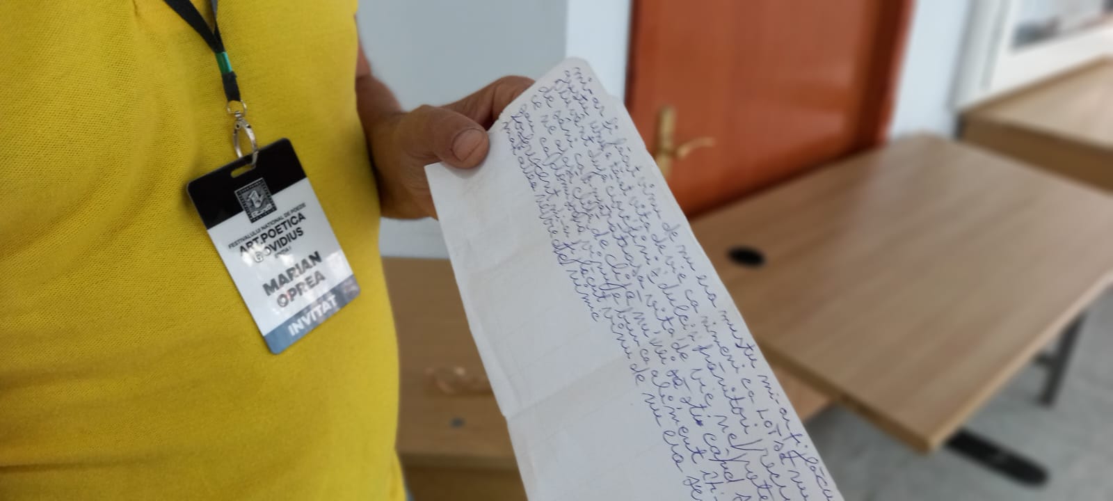 „Mi-ar fi plăcut vinul, de nu era mustul /Mi-ar fi plăcut asceza, de nu era gustul / Omul a tăiat vița de vie ca nimeni, ca lot să nu mai fie…“ – pe o bucățică de hârtie, scrijelite cu pixul, stau versurile poetului timișorean Marian Oprea, unul dintre invitații primei ediții a Festivalului de poezie Ovidius de la Constanța, eveniment organizat de reprezentanții Bibliotecii Județene „I.N. Roman“.