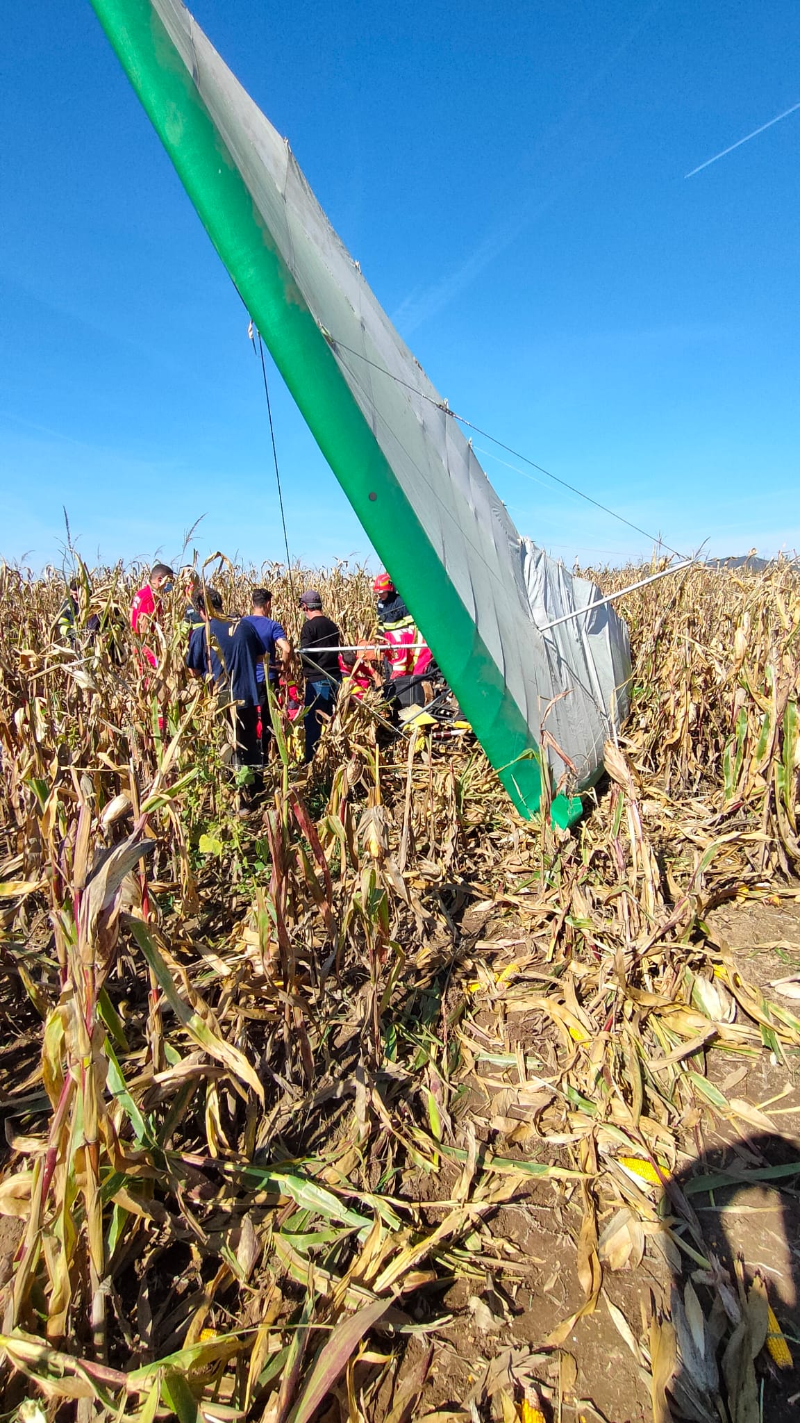 Doi bărbaţi sunt transportaţi la Unitatea de Primiri Urgenţe a Spitalului Clinic Judeţean de Urgenţă din Sibiu, cu mai multe răni, după ce au căzut cu motodeltaplanul într-un lan de porumb la marginea comunei Şelimbăr, a anunţat purtătorul de cuvânt al Inspectoratului pentru Situaţii de Urgenţă (ISU) Sibiu, Andreea Ştefan.