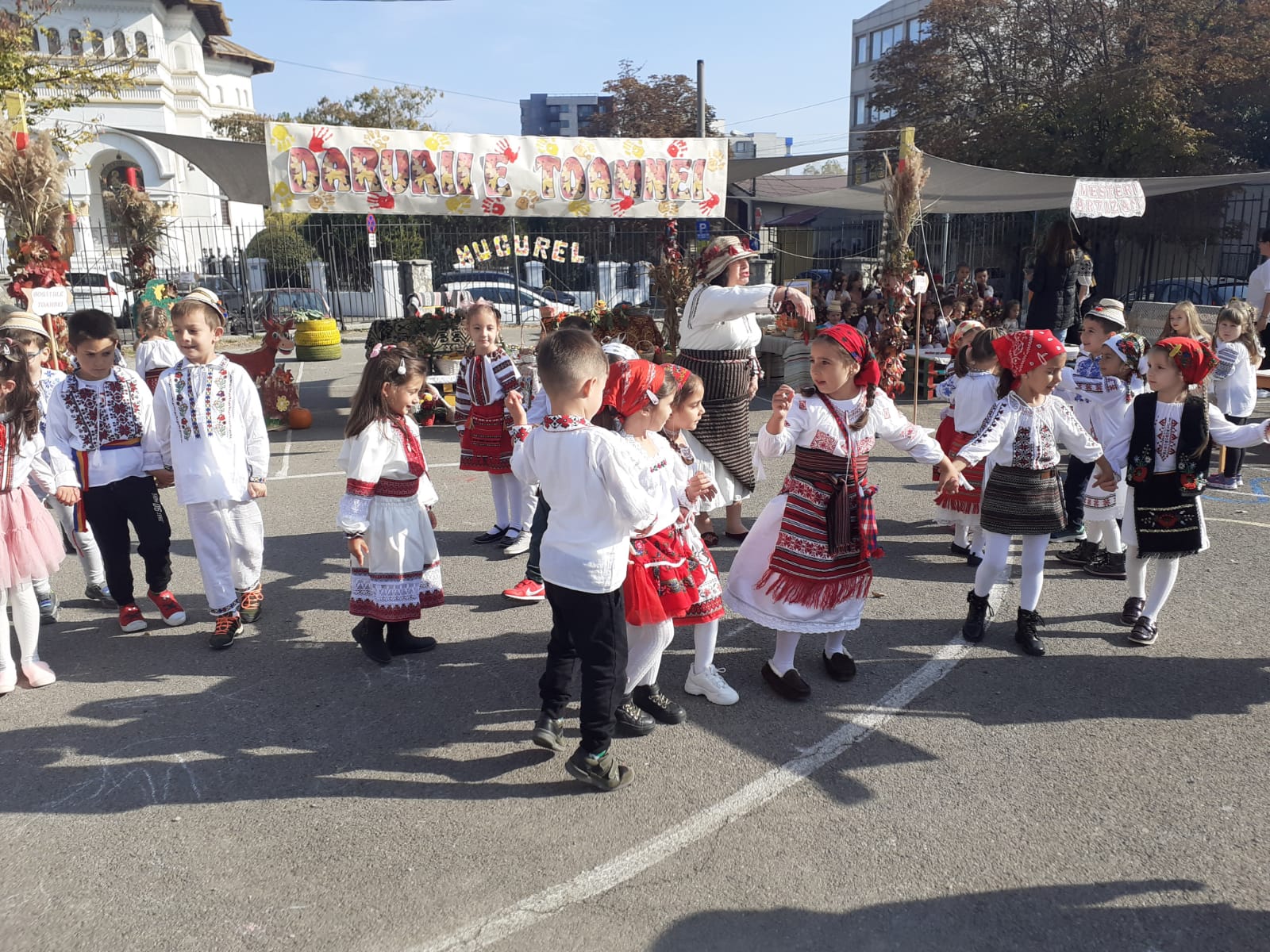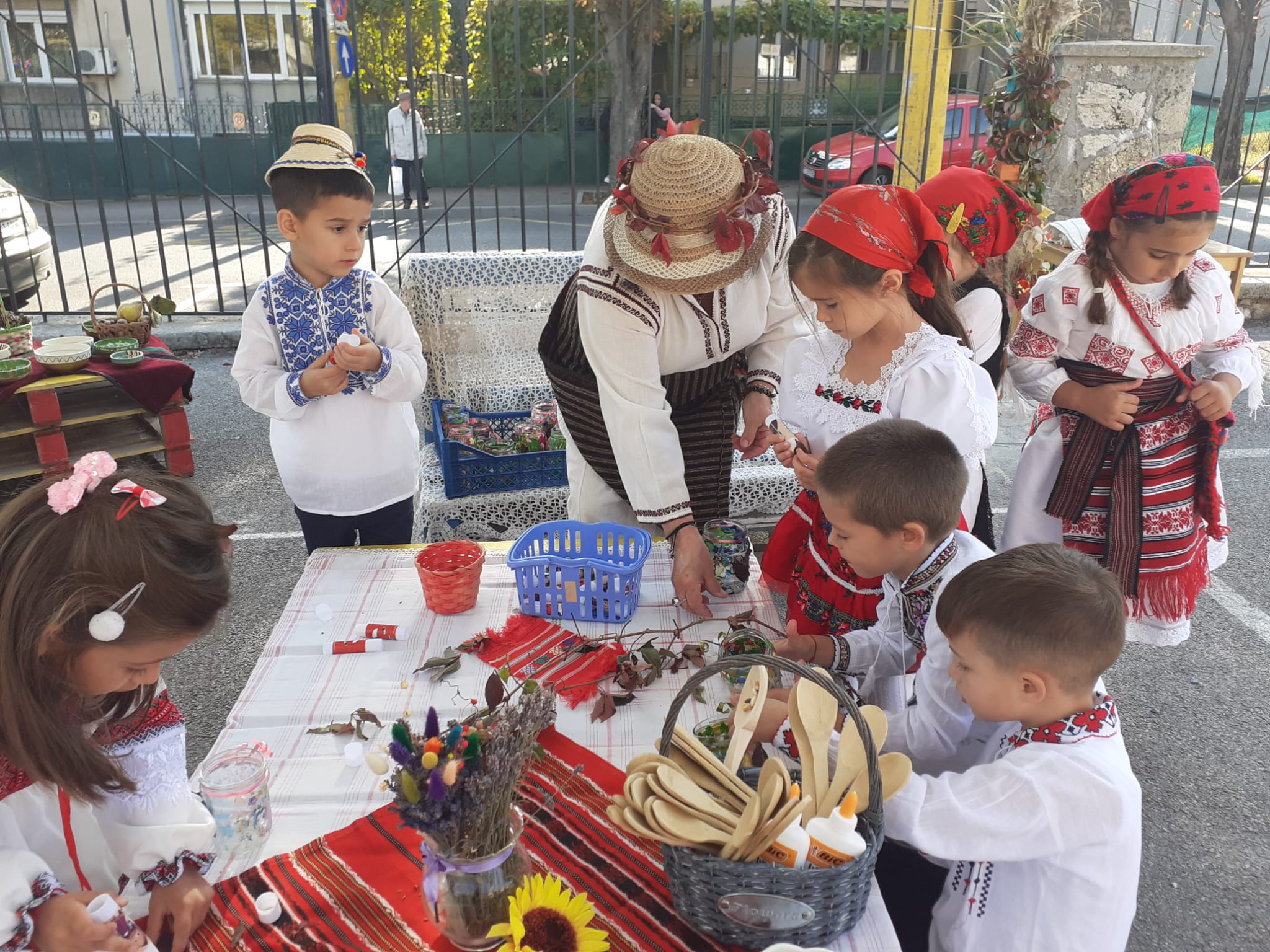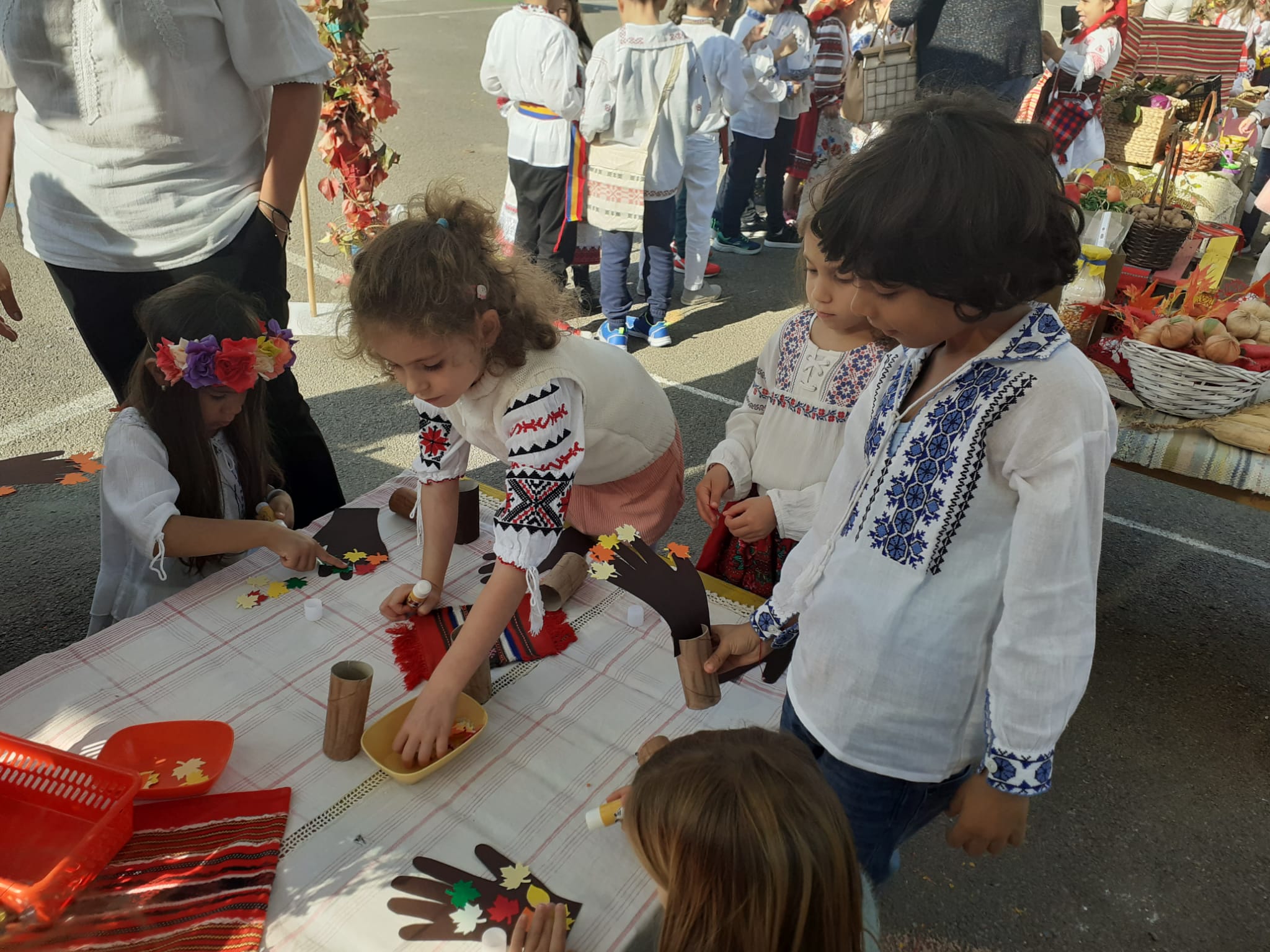 Îmbrăcați în costume populare care mai de care mai frumoase, copiii au ieșit în curtea decorată special pentru a sărbători toamna. Pentru cei din grupa Albinuțele, prima oprire a fost în zona meșterilor artizani. „Meșterii artizani fac haine, pălării, linguri din lemn, din lut fac străchini, fac și mărțișoare”, a spus o fetiță.
