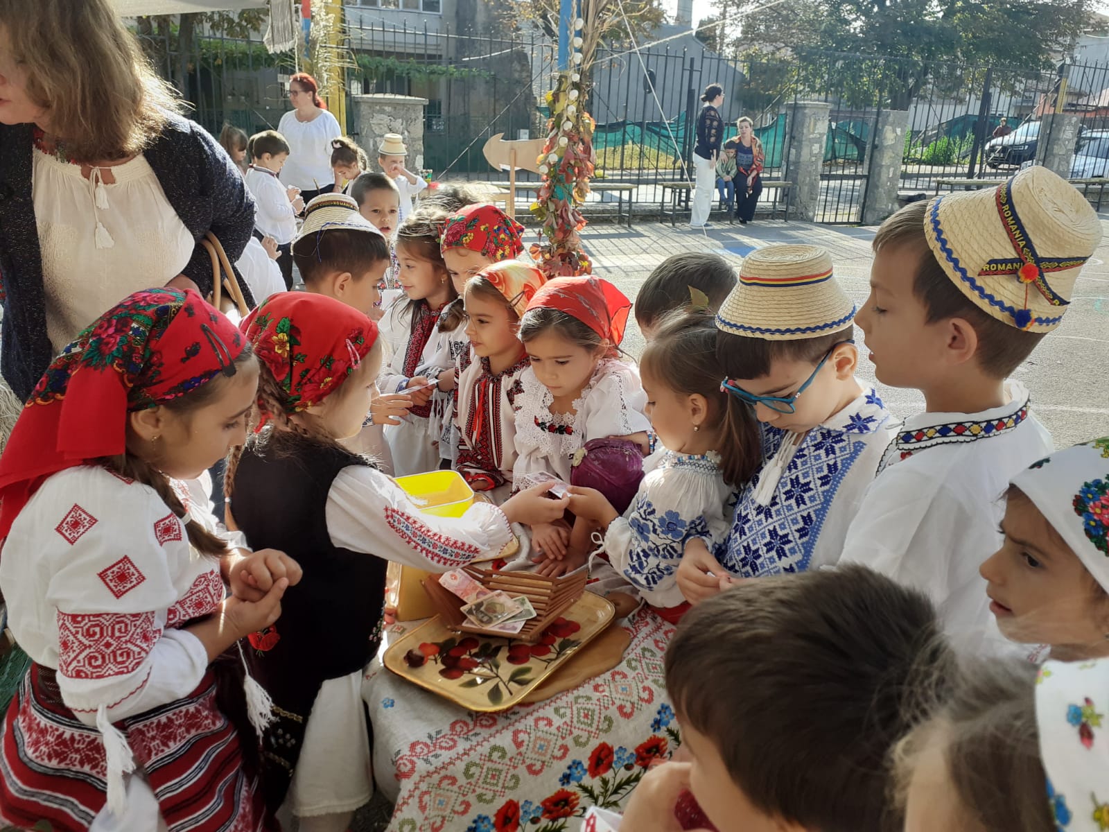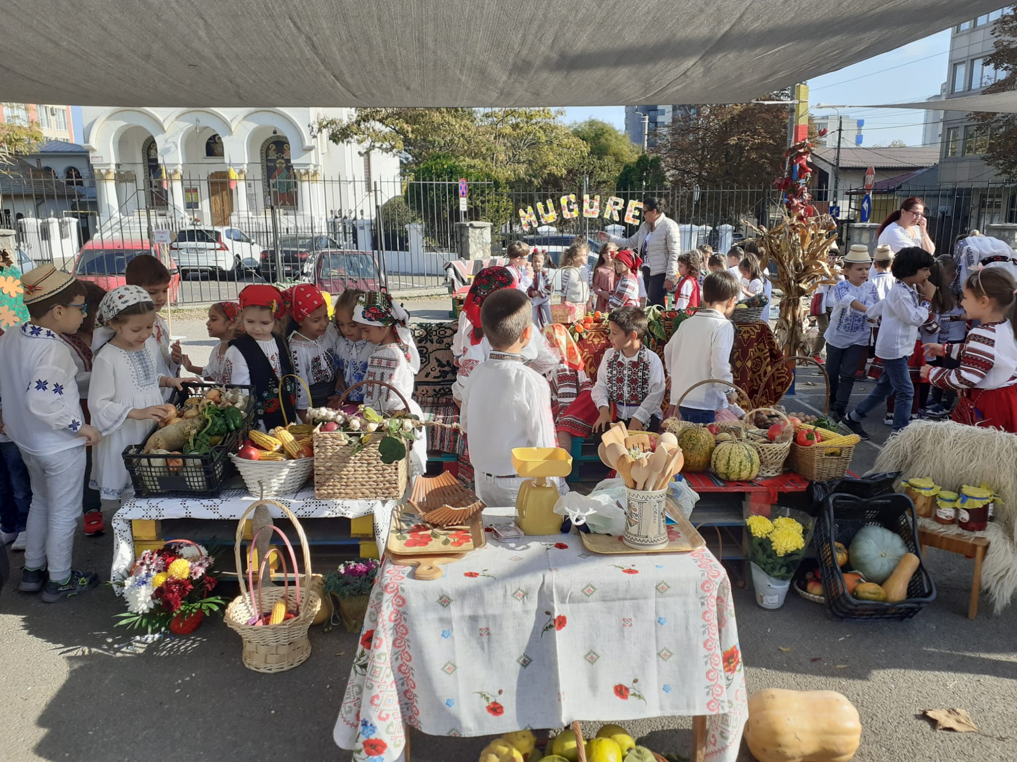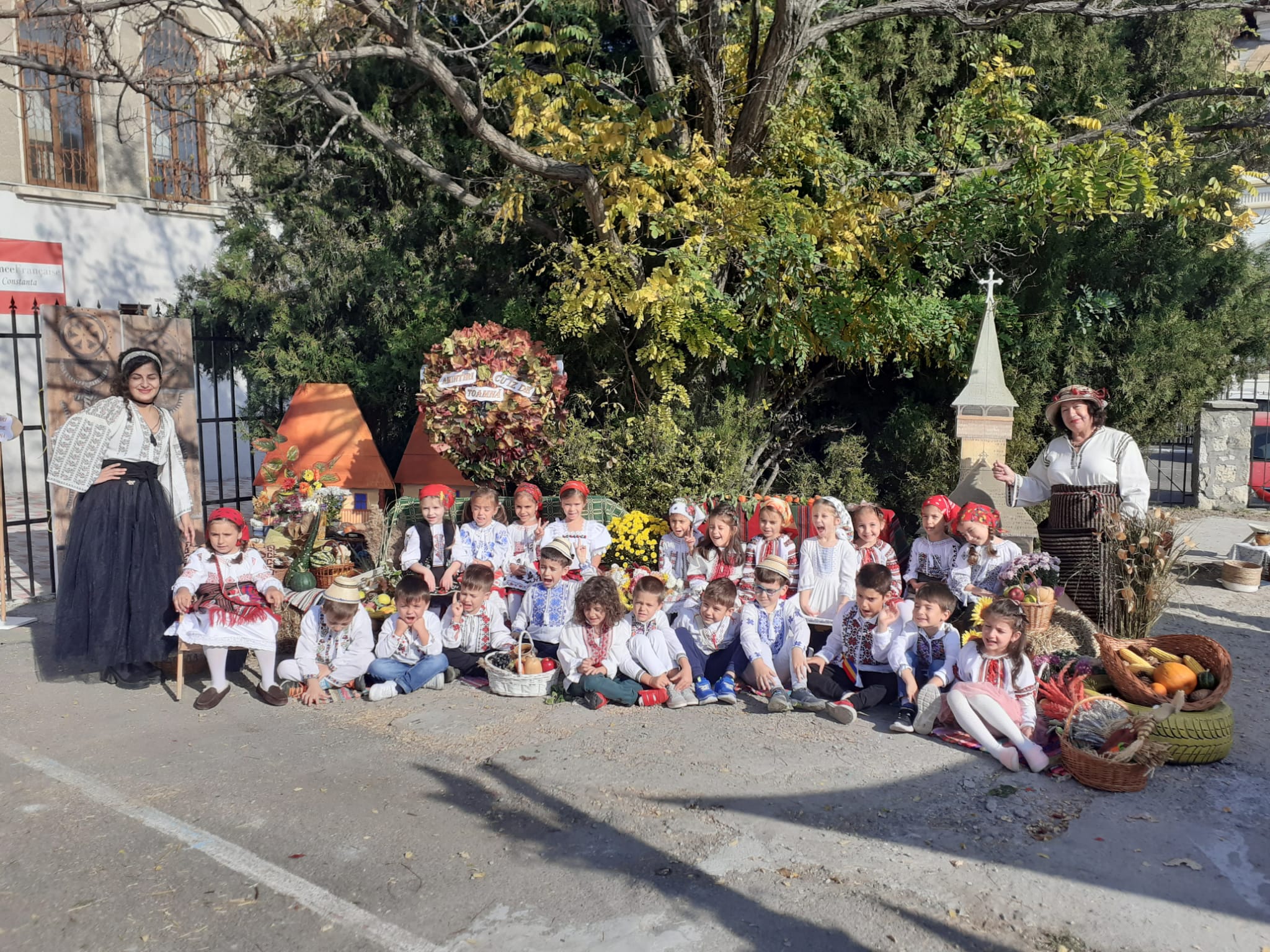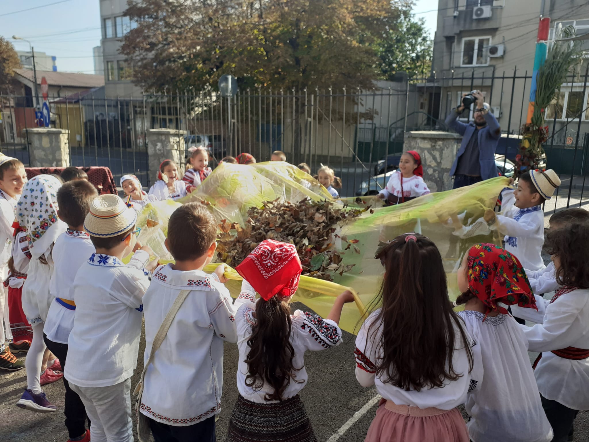 Îmbrăcați în costume populare care mai de care mai frumoase, copiii au ieșit în curtea decorată special pentru a sărbători toamna. Pentru cei din grupa Albinuțele, prima oprire a fost în zona meșterilor artizani. „Meșterii artizani fac haine, pălării, linguri din lemn, din lut fac străchini, fac și mărțișoare”, a spus o fetiță.