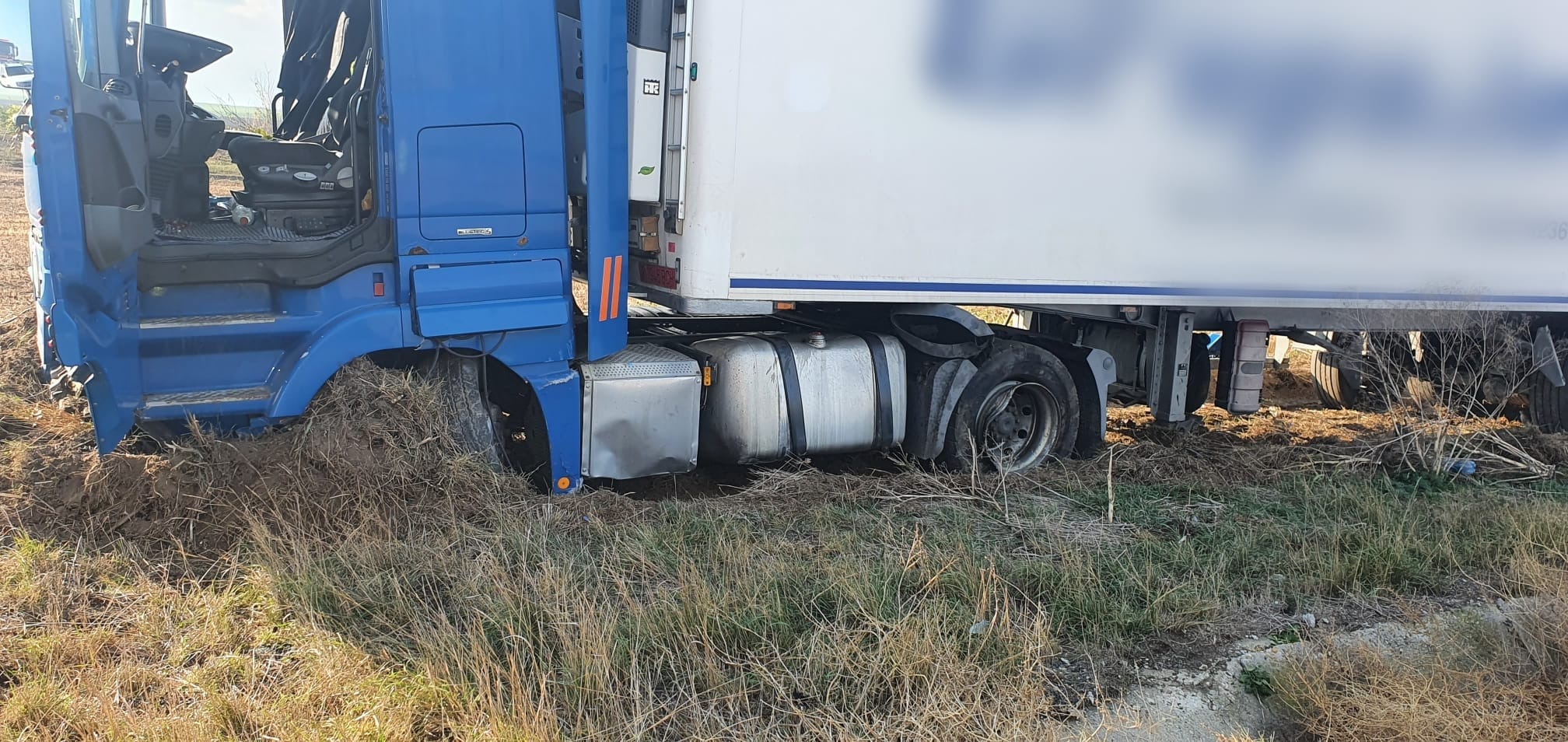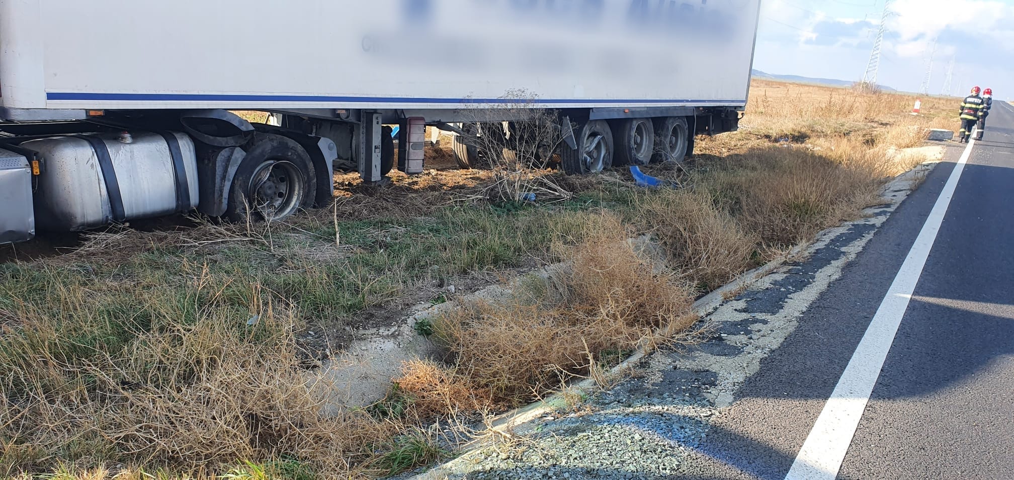 Potrivit primelor informații, un autocamion încaărcat cu suc de mere, a ieșit în afara părții carosabile după ce a lovit un cap de pod.