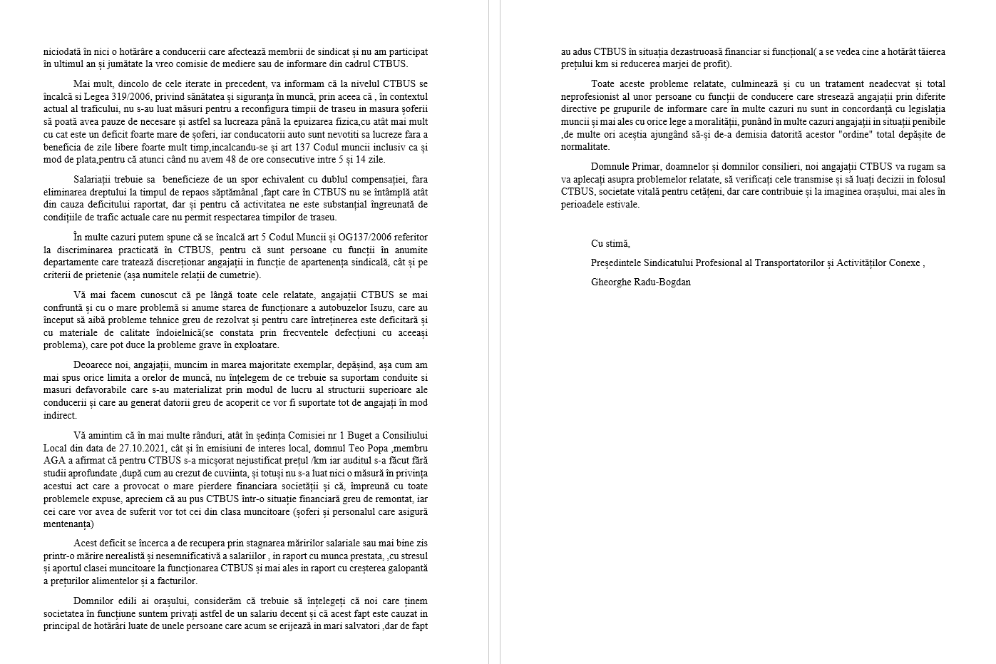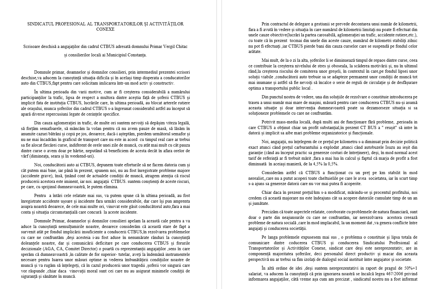 O scrisoare a mai multor sindicaliști de la CT Bus va fi transmisă Primăriei Constanța. În documentul adresat edilului Vergil Chiţac, precum şi consilierilor locali, angajații își exprimă nemulțumirea legată de condițiile de lucru și de faptul că nu au fost invitați la negocierile sindicale.