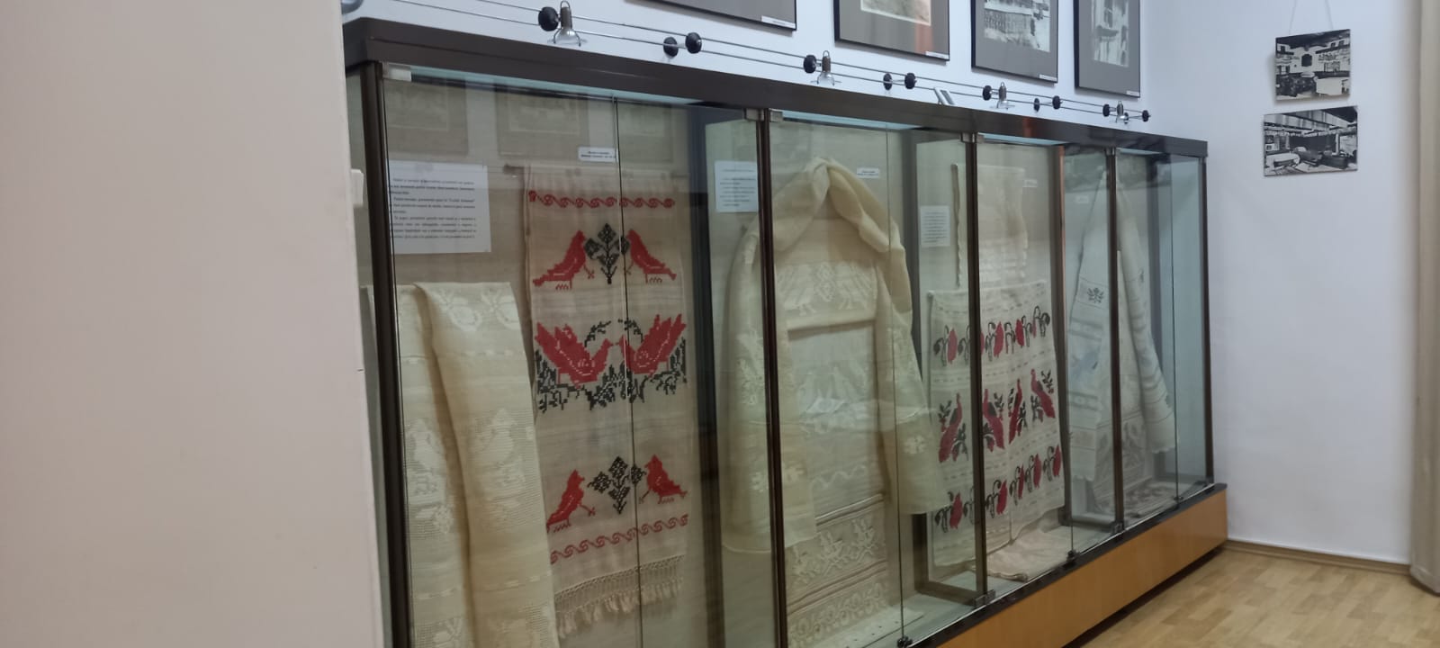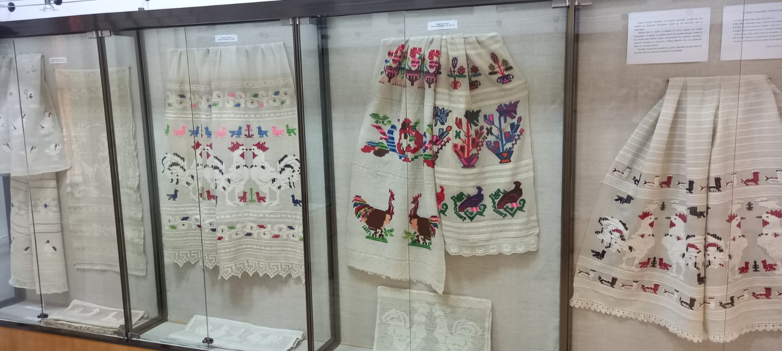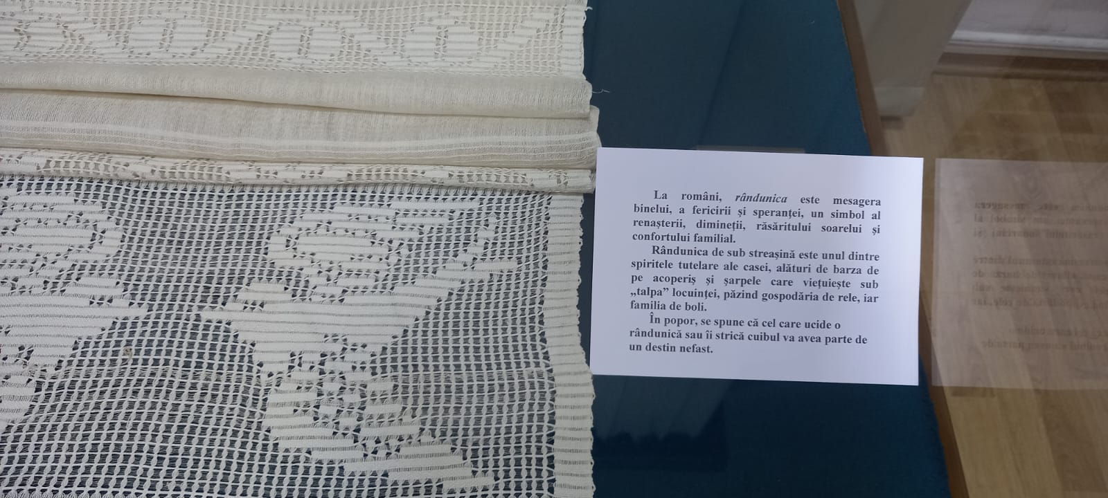 „Avem expus un ștergar cu porumbeii afrontați, simbol al celor doi tineri îndrăgostiți, un ștergar foarte valoros, provenind de la Băneasa, și lucrat în primii ani ai secolului XX. Avem, acolo, în față, un ștergar de Oltina, de la 1900, ștergarul cu cocoș. Noi am numărat 14 tipuri de păsări. Se pot vedea de la păsări călătoare, păsări de curte, păsări de baltă sau exotice. Avem acolo porumbelul, care este cea mai importantă pasăre pentru creștini pentru că reprezintă o întruchiparea Sfântului Duh. Perechea de porumbei, așa cum o avem noi redată pe acest ștergar de la Băneasa, simbolizează perechea de îndrăgostiți. Avem păuni, un simbol al fertilității, o pasăre cu atribute solare, este întotdeauna legat de frumusețe, dar și de virilitate. Aici avem o vitrină cu păsări de curte, găina, rața, chiar și doi curcani. Cocoșul este o pasăre foarte importantă, un simbol apotropaic. Cocoșul la sat era foarte important pentru că era deșteptătorul casei”, ne-a mai spus muzeograful Cerasela Dobrinescu.