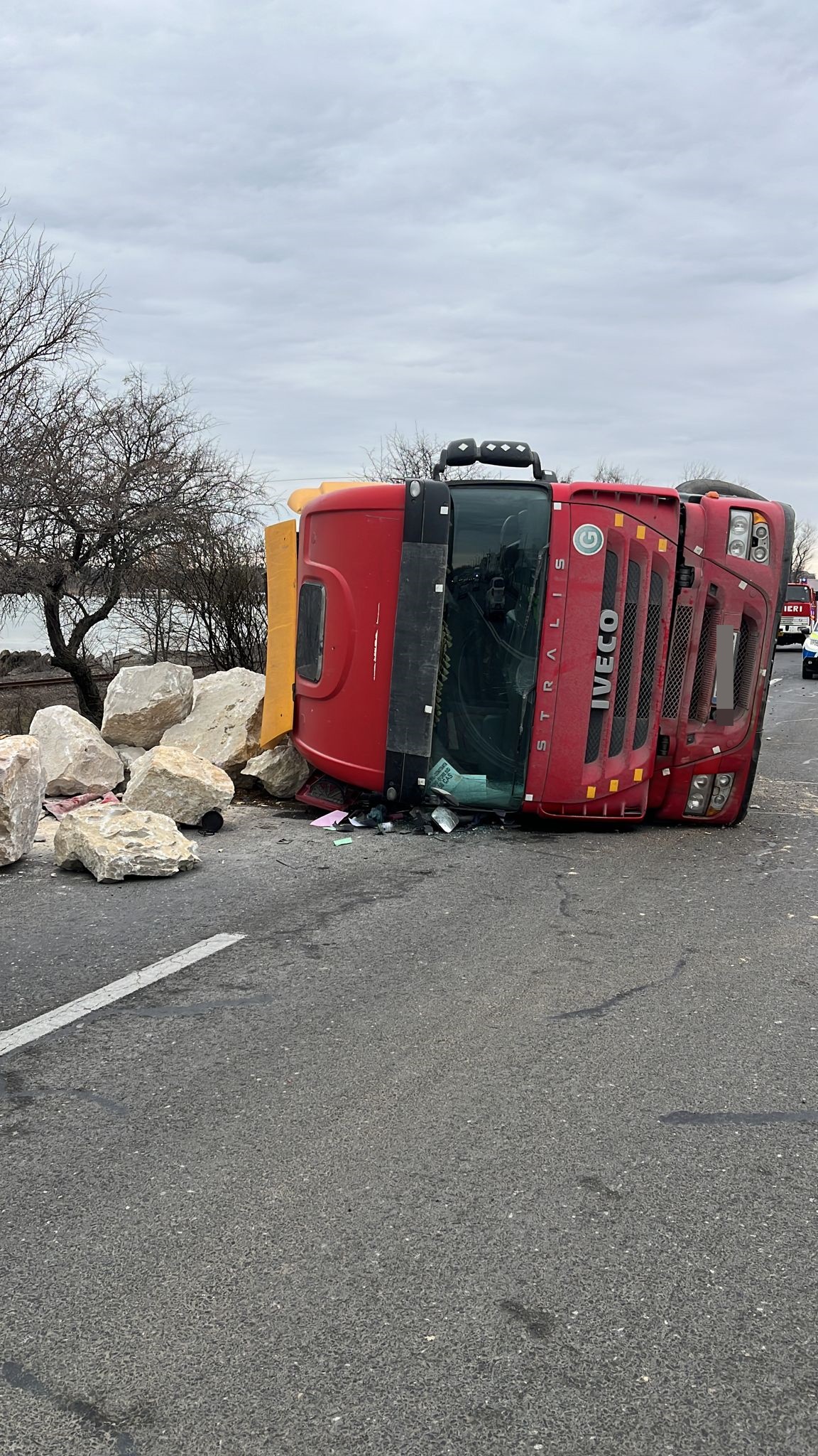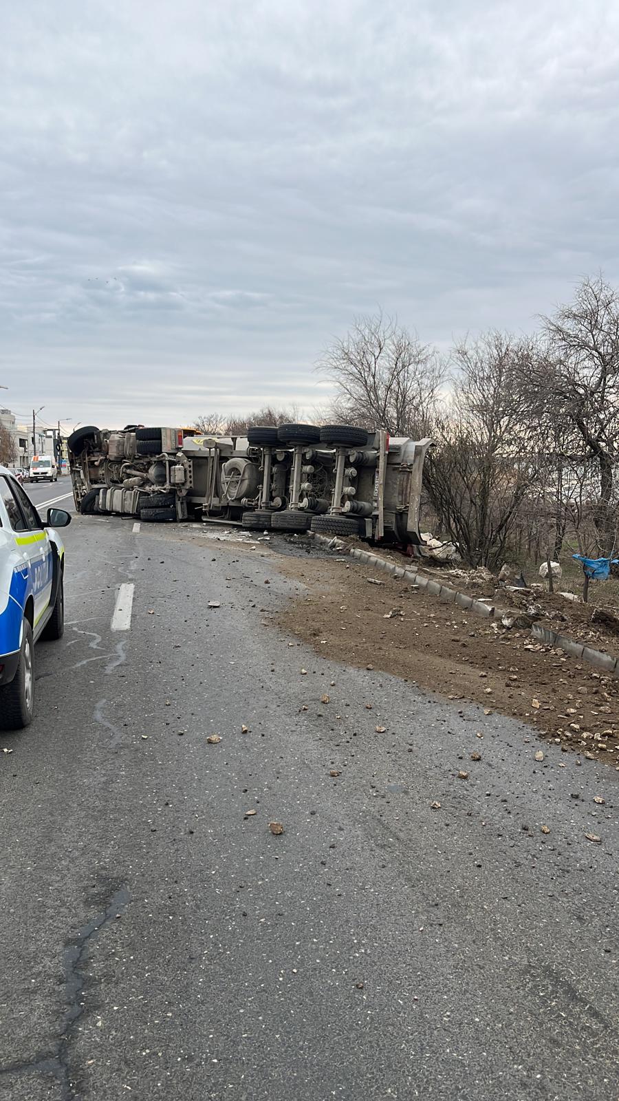 Potrivit autorităţilor, un autovehicul încărcat cu piatră s-a răsturnat pe carosabil. Din fericire nu sunt victime, iar şoferul, un bărbat în vârstă de 62 de ani, nu a suferit traumatisme şi a refuzat transportul la spital.