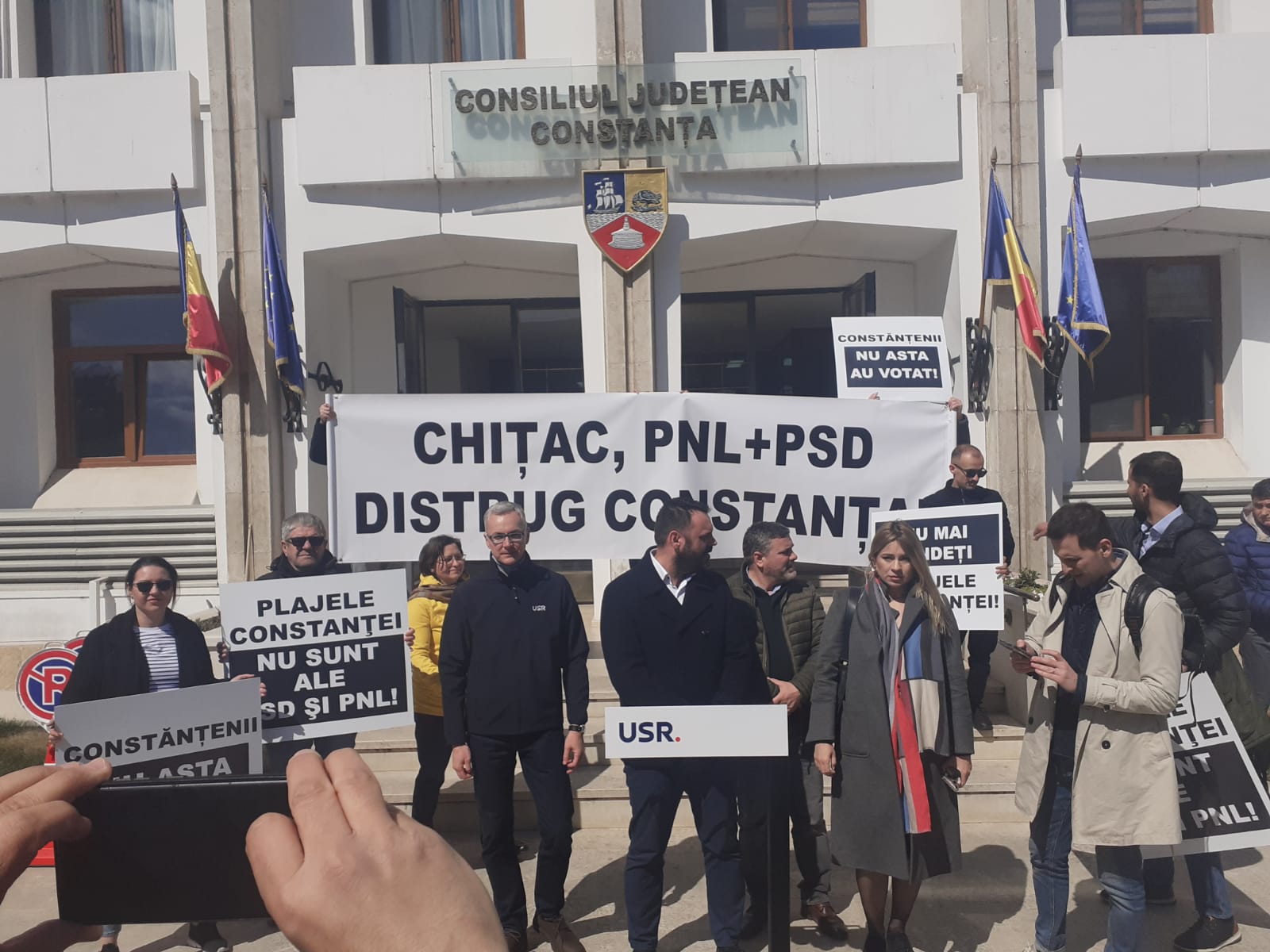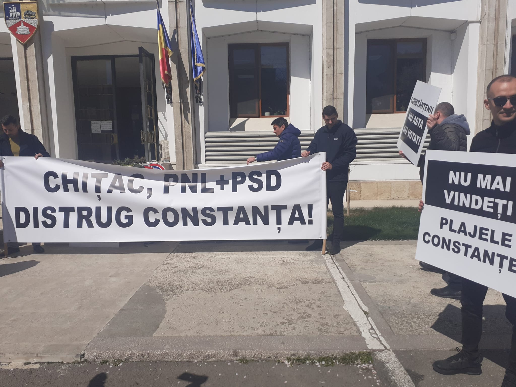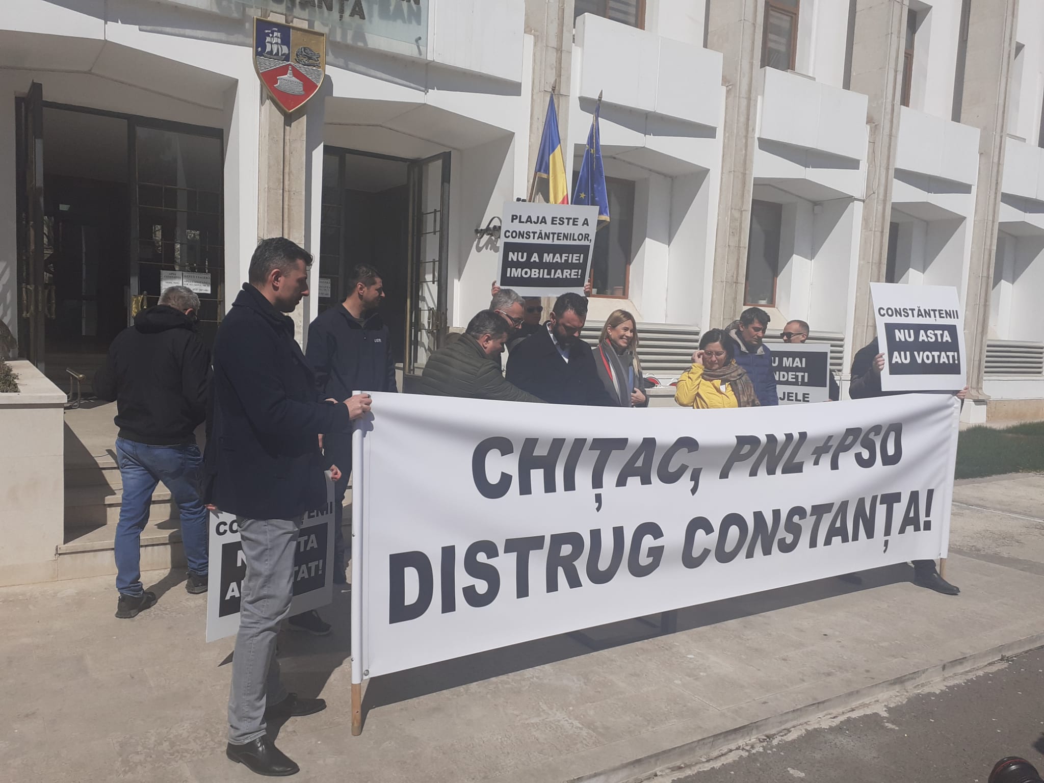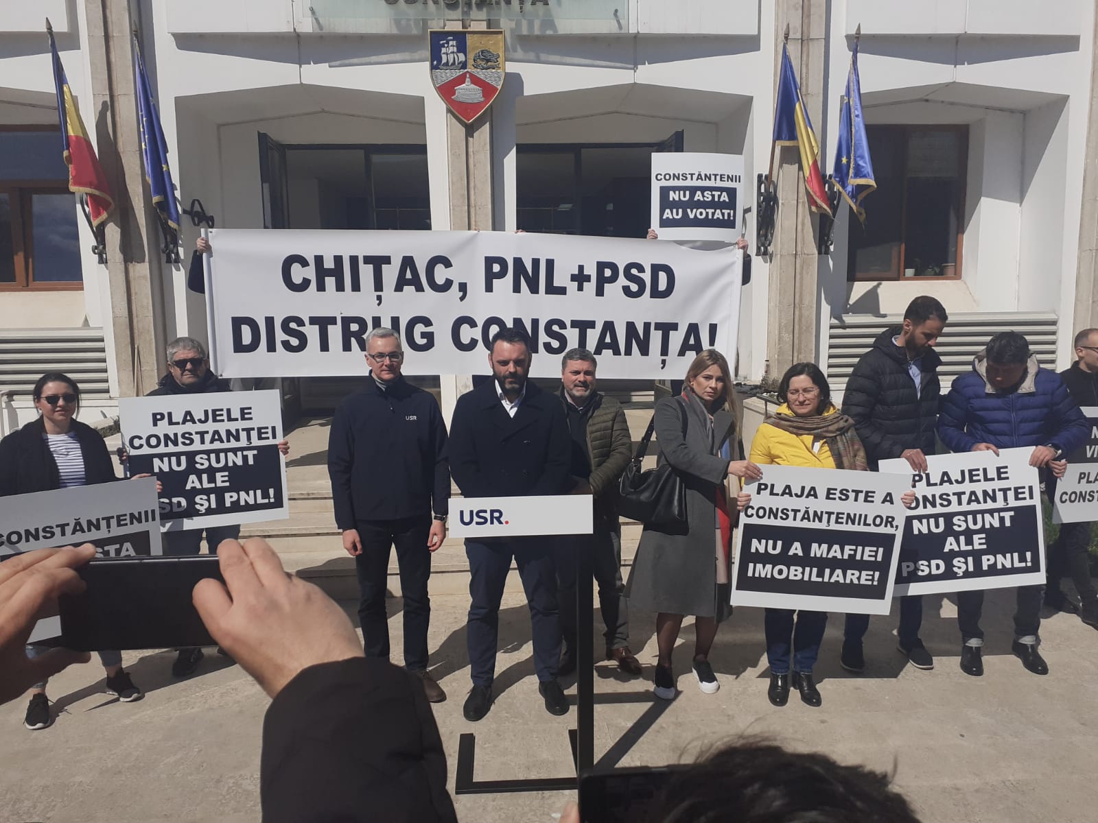 Membri ai USR Constanţa au organizat, joi, în faţa sediului administraţiei locale, un protest faţă de un proiect al primarului liberal Vergil Chiţac prin care, potrivit contestatarilor, peste 800 de metri pătraţi de plajă din Mamaia ar fi vânduţi unei firme conduse de liderul PSD Constanţa, Ion Dumitrache.
