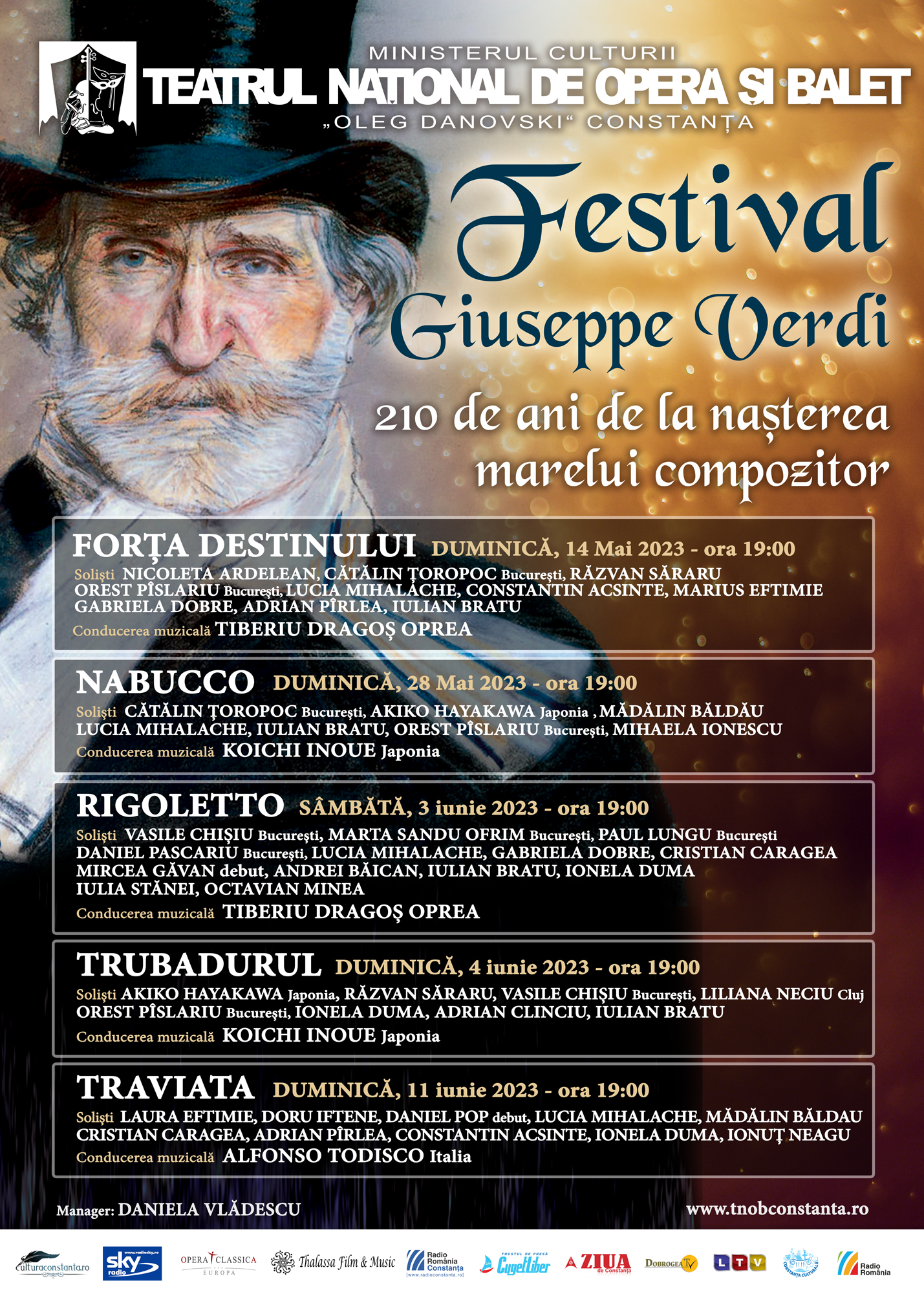 Teatrul Național de Operă și Balet „Oleg Danovski” anunță debutul „Festivalului Verdi”. Acesta se va desfășura în perioada 15 mai – 11 iunie 2023 și va cuprinde 5 spectacole la care vor participa artiști invitați de renume. Biletele pot fi achiziționate online pe www.tnobconstanta.ro/bilete și de la Agenția Teatrului. De asemenea, pentru acest eveniment, a fost pus la vânzare și un pachet promoțional (cu locuri preferențiale în limita locurilor disponibile în sală) care poate fi achiziționat de la Agenția Teatrului. Acesta este în valoare de 150 lei și cuprinde cele 5 spectacole. În această săptămână va avea loc în Sala Teatrului Național de Operă și Balet „Oleg Danovski” și evenimentul independent „Opera+”, pe data de 10 mai 2023, ora 19. Mai multe detalii despre acest eveniment pe website.