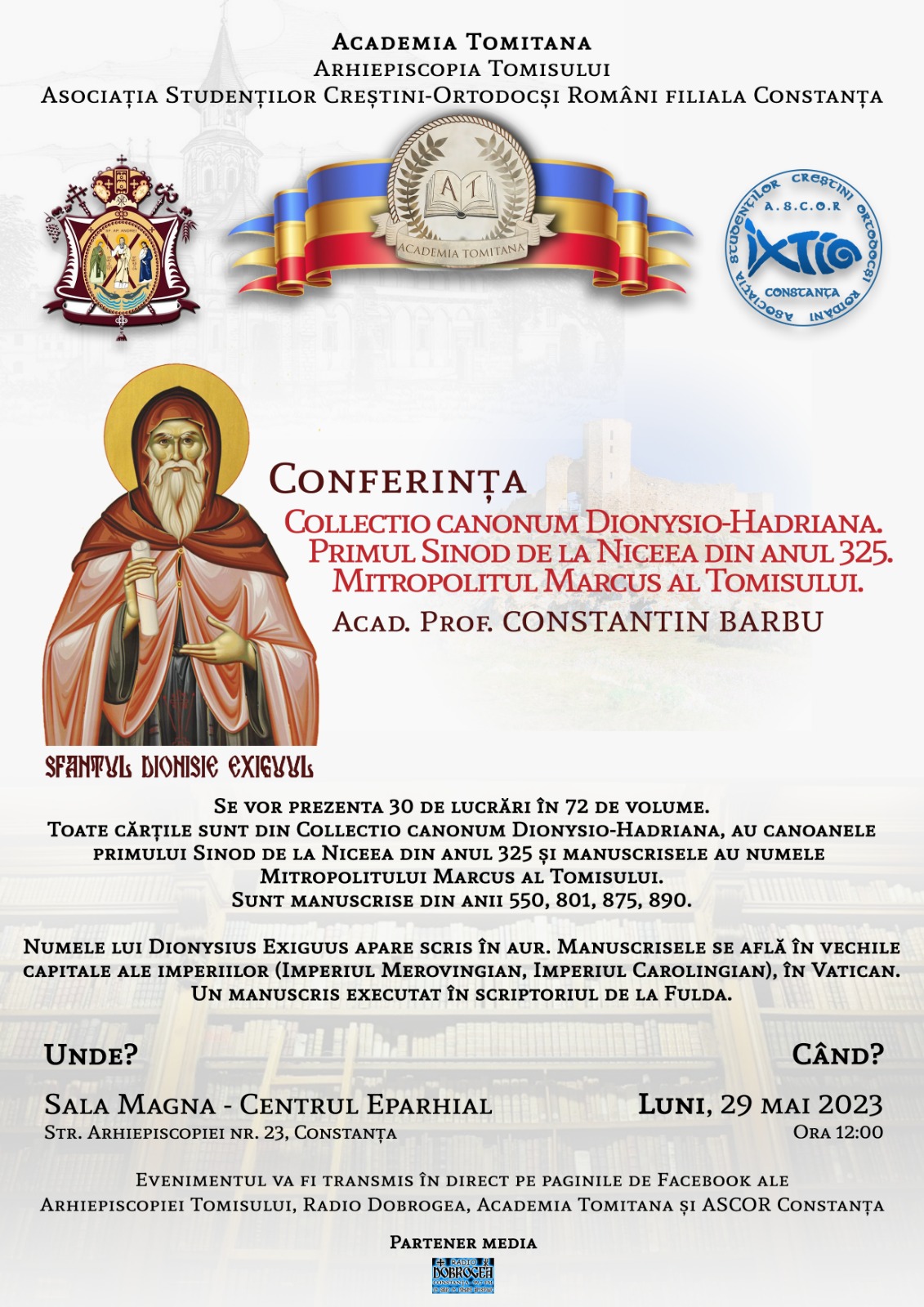 Luni, 29 mai 2023, de la ora 12.00, IPS Teodosie, Arhiepiscopul Tomisului, susține în sala Magna a Palatului Arhiepiscopal (str. Arhiepiscopiei, nr. 23), o conferință de presă și conferințele „Collectio canonum Dionysio-Hadriana”, „Primul Sinod de la Niceea din anul 325” și „Mitropolitul Marcus al Tomisului”, susținute de către Acad. Prof. Constantin Barbu, cu binecuvântarea și în prezența IPS Teodosie, Arhiepiscopul Tomisului.