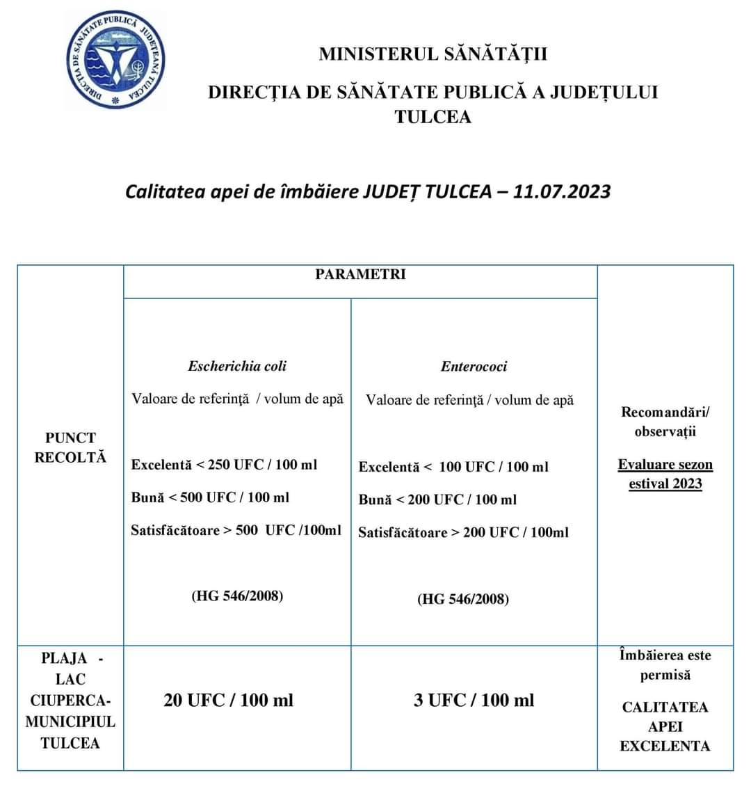 Autorităţile precizează că s-au realizat analize pentru determinarea valorilor E.coli și Enterococi.Parametri admiși vs. Valori înregistrate la Plaja Lac Ciuperca: