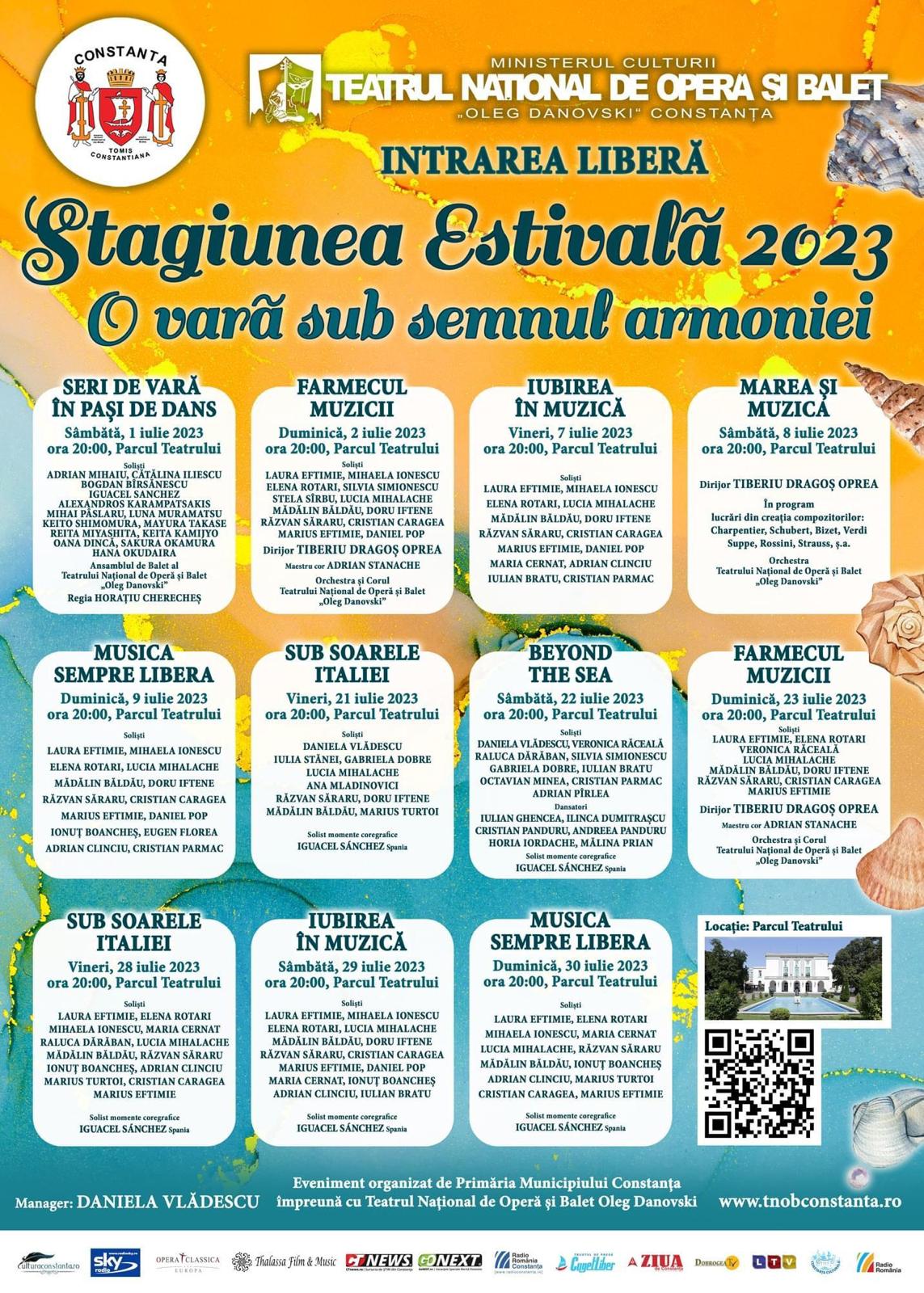 Duminică, 30 iulie 2023, ora 20:00, Parcul Teatrului – MUSICA SEMPRE LIBERA -o seară de arii, duet, ansambluri de opera, operetă, canţonete, chansonete, muzică de film și musical. Vor interpreta pentru dumneaoastră soliștii: LAURA EFTIMIE, ELENA ROTARI, MIHAELA IONESCU, MARIA CERNAT, LUCIA MIHALACHE, RĂZVAN SĂRARU, MĂDĂLIN BĂLDĂU, IONUȚ BOANCHEȘ, ADRIAN CLINCIU, MARIUS TURTOI, CRISTIAN CARAGEA, MARIUS EFTIMIE. Momente coregrafice vor fi asigurate de IGUACEL SÁNCHEZ.