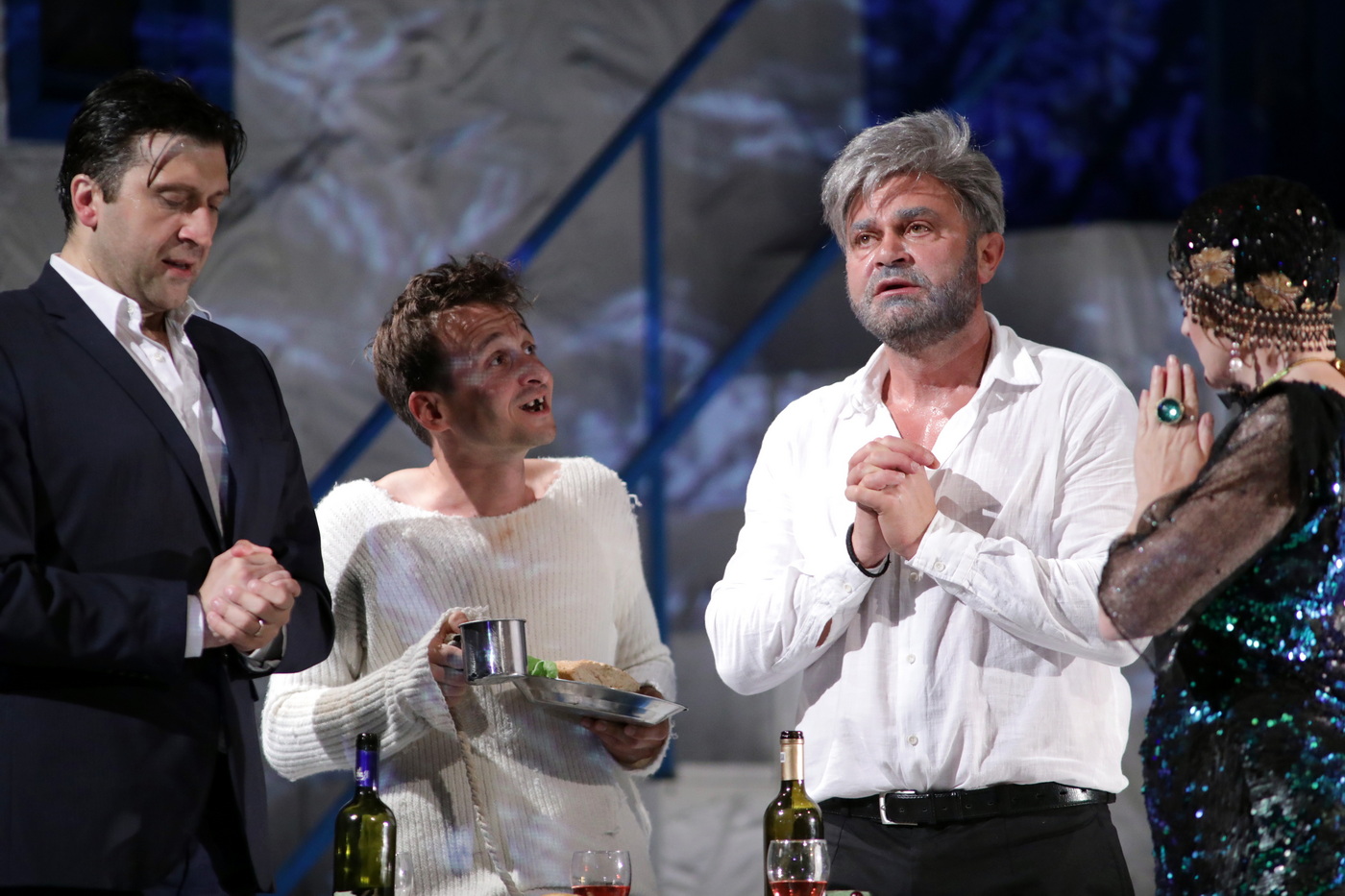 Pe scurt, Alioșa emigrează peste ocean, unde lucrează pentru un mare fabricant de lapte praf. Iar Andrei se întoarce acasă. În plus, mai apar în spectacol un inventator, un impresar, un purice, un iaz cu hipopotami, un sac maro, câțiva șoareci, o pisică de mare, un lăutar și Dumnezeu. Pisica, oricum îi dai drumul, tot în picioare cade.”
