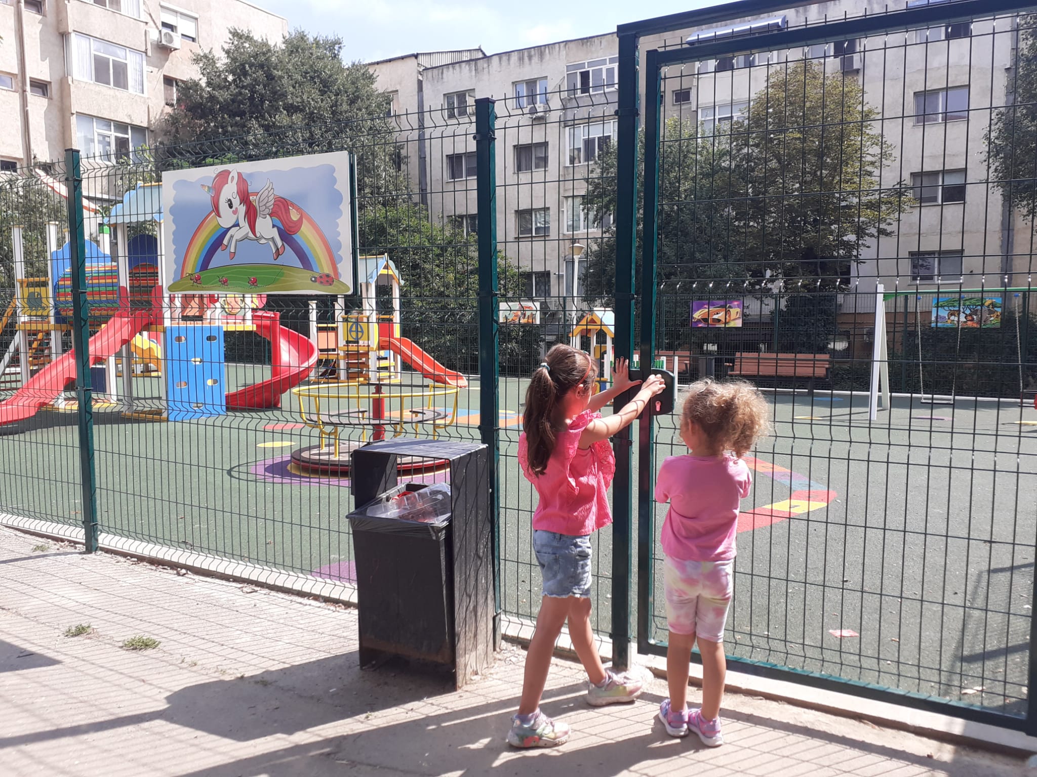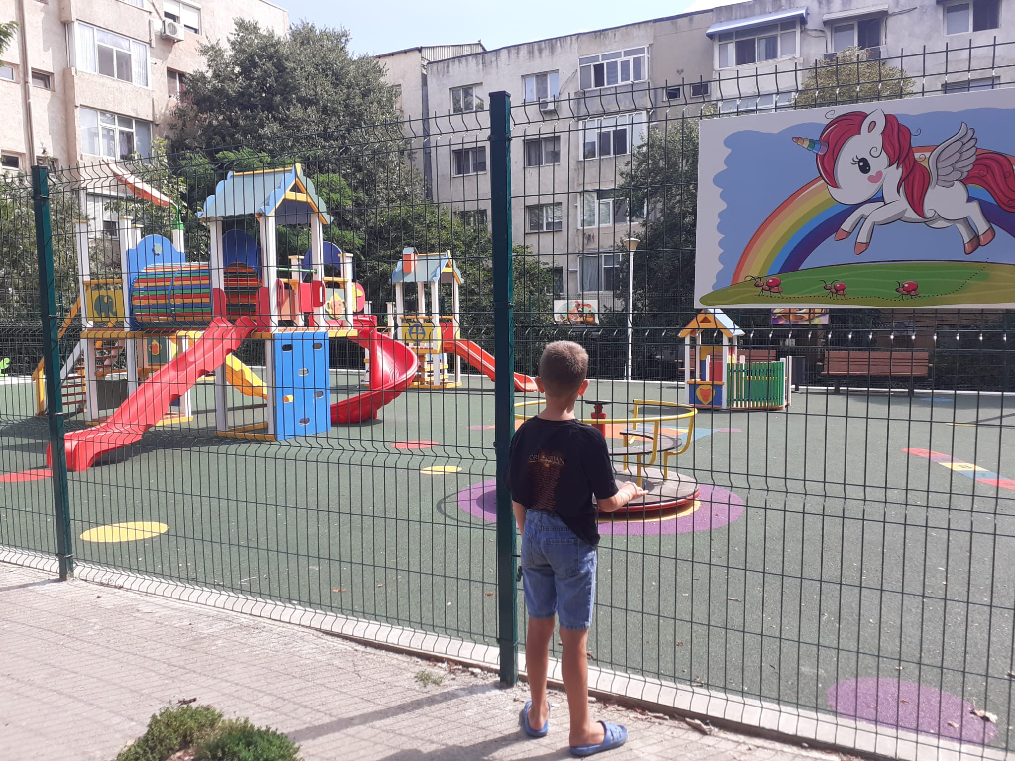 Dezamăgiți, copiii se uită cu jind la leagănele și toboganele de dincolo de gard și își imaginează cum s-ar distra.