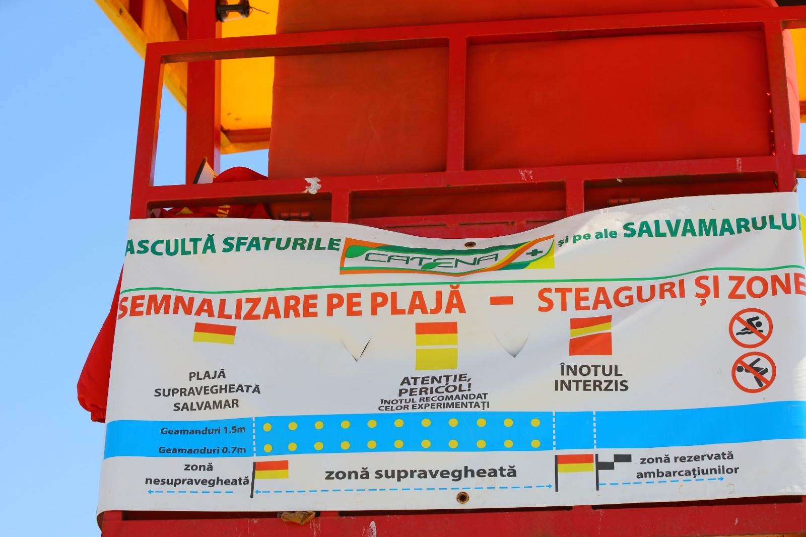 • Steagul roșu cu galben înseamnă că plaja este supravegheată de salvamari.