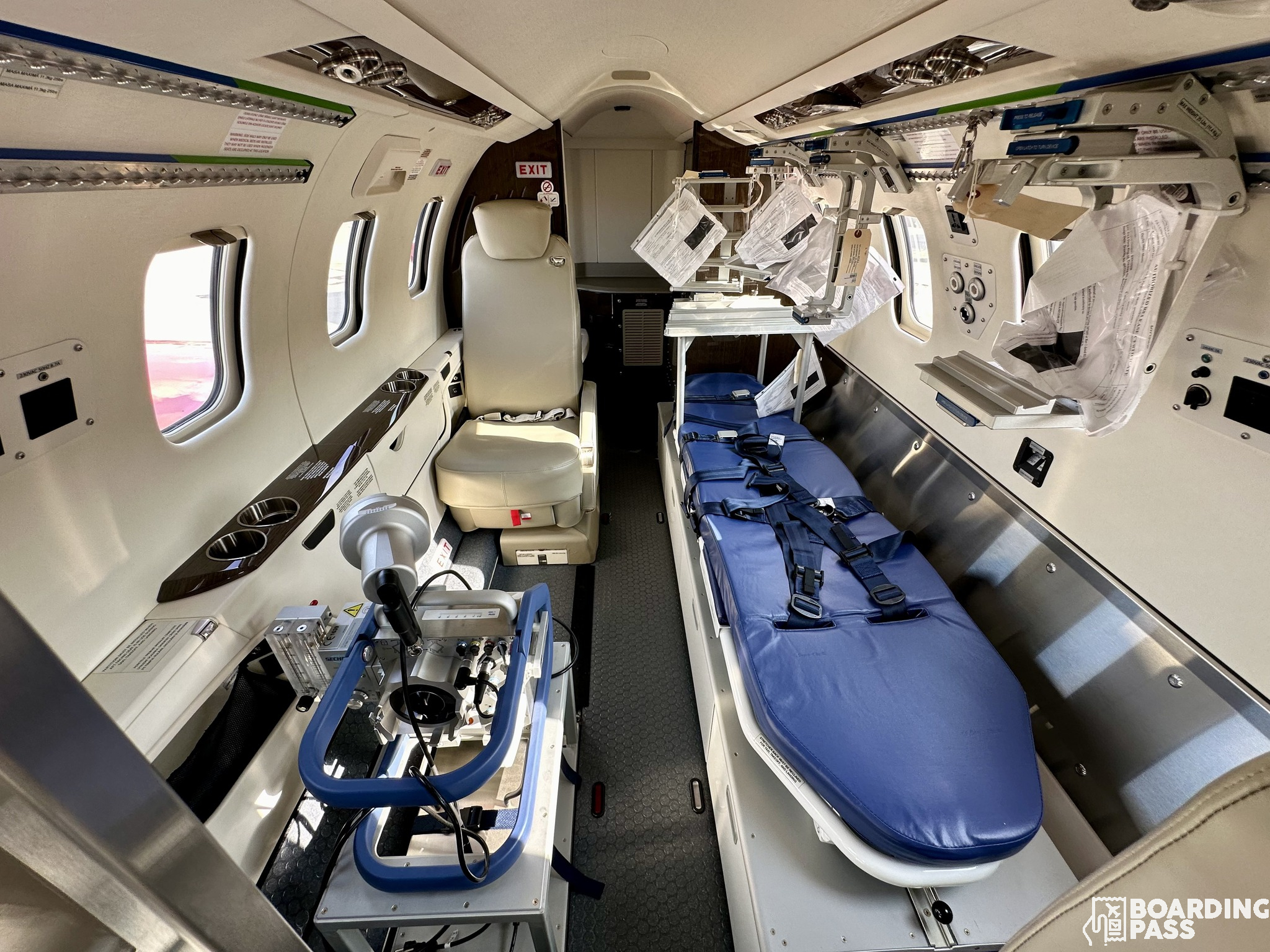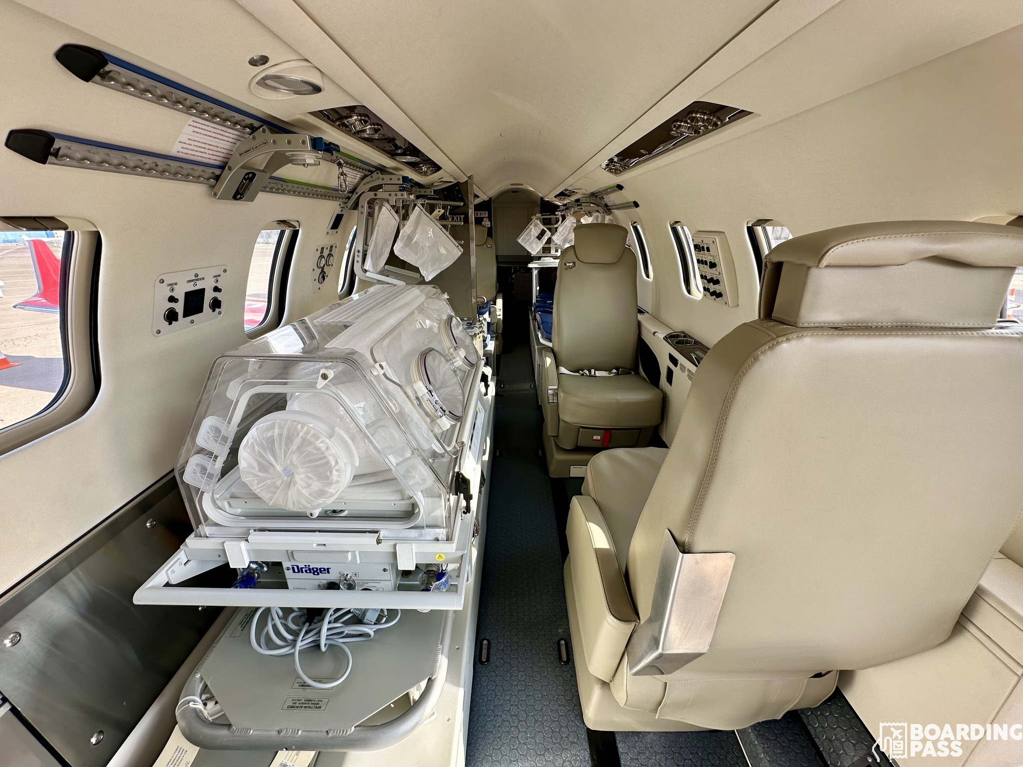 Fiecare avion poate transporta simultan doi pacienti critici sau trei pacienti, dintre care unul critic, și o echipă medicală. Totodată, fiecare avion este dotat cu incubator de transport nou-născuți sau pacienți care necesită suport ECMO (plămân artificial) pe durata transportului.
