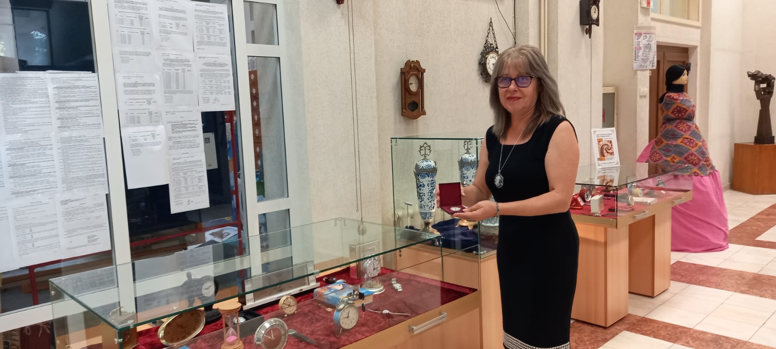 “Este pentru a treia oară când noi facem asemenea expoziții. Am început anul trecut, de Noaptea Bibliotecii, când am avut o expoziție foarte frumoasă, cu servicii de cafea și de ceai. Anul acesta, în luna martie, a fost o expoziție dedicată femeii. Am strâns accesorii din cufărul bunicii. Am pornit inițial de la a strânge niște poșete, dar apoi am extins, bineînțeles, și cu ce este în poșete. Și acum ne-am gândit să facem o expoziţie de ceasuri. Ideea, de fapt, a pornit de la colega mea Ruxandra Hondrea. Încă de anul trecut a spus ea ceva de ceasuri, dar am lăsat, am lăsat, am lăsat, și am zis, hai să vedem dacă reușim să adunăm ceva. Și spre surprinderea noastră, întotdeauna ne este teamă când facem asemenea expoziții pentru că nu știm dacă reușim să adunăm sau nu, dar spre surprinderea noastră și spre bucuria noastră, colegii au reacționat, și-au adus aminte că au în casă, la bunica, la mama, chiar și la ei în casă, ceasuri care sunt în familie de ani de zile și atunci am zis hai să facem această expoziție. Sunt convinsă că nu este modestie, falsă modestie, chiar a ieșit o expoziție foarte frumoasă. Lumea este mirată când vede asemenea exponate într-o bibliotecă, pentru că e ceva atipic pentru o instituție, care, de obicei, expune cărți sau periodice și sperăm ca lumea să vină să o vizioneze. Sunt ceasuri care au aparținut bunicilor, iar unii dintre ei au luptat în cel de-al II-lea Război Mondial. Avem un ceas de la un prieten de-al bibliotecii care este militar și a fost cu acest ceas în Afganistan în misiuni. Avem ceasuri de început de secol XX care au fost împrumutate de către un prieten drag de-al bibliotecii, și sunt niște piese care trezesc amintiri. Ce e frumos la această expoziție e că toți cei care le aduc, își aduc atunci aminte de momente dragi și le răscolesc în ei, cumva, aceste obiecte”, spune Doina Moșoiu.