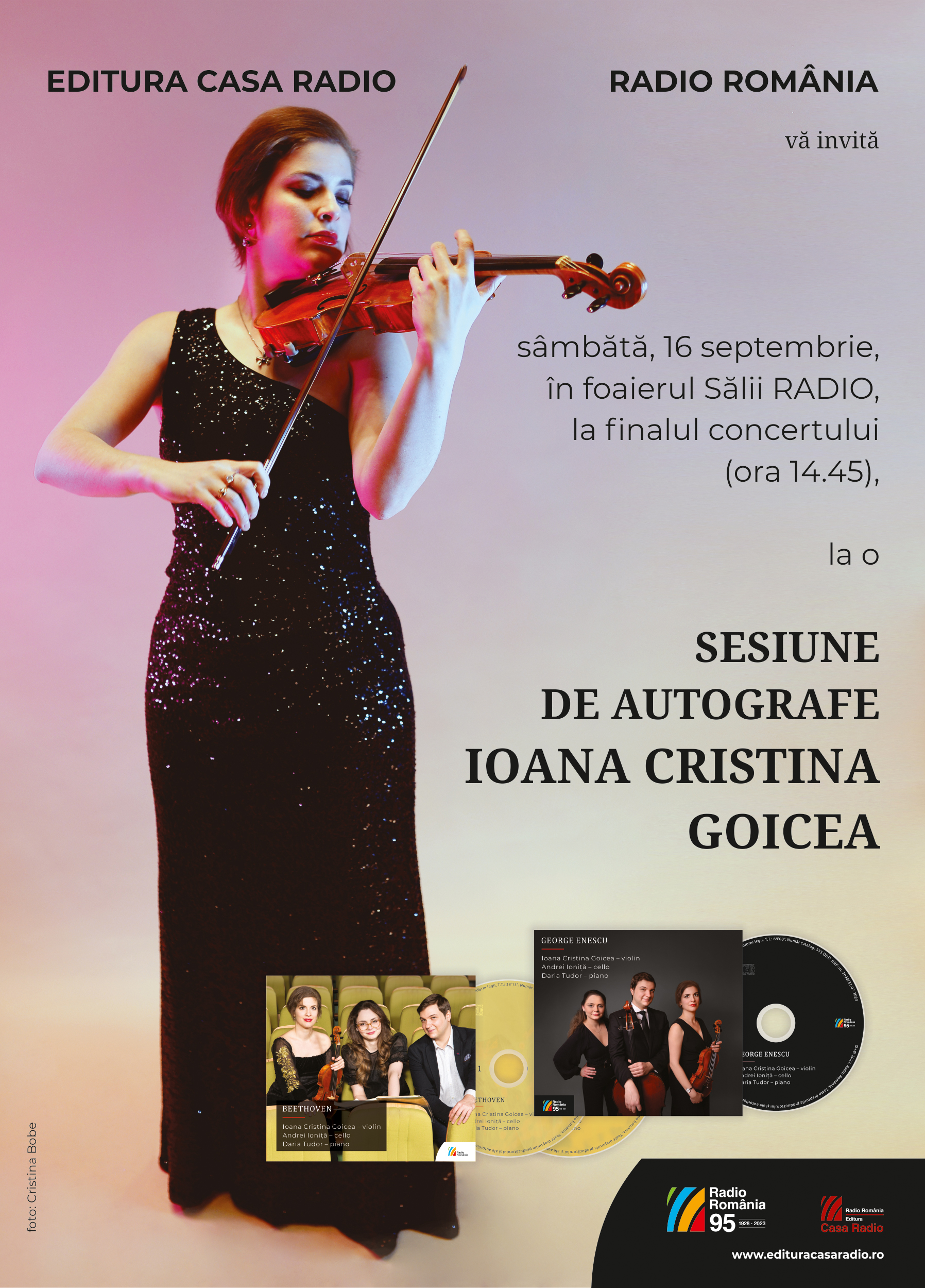Albumul recent apărut la Editura Casa Radio cu titlul George Enescu. Ioana Cristina Goicea – violin, Andrei Ioniță – cello, Daria Tudor – piano va avea cea de-a treia întâlnire cu publicul Festivalului Internațional „George Enescu”, sâmbătă, 16 septembrie, la Sala Radio din București. La finalul concertului de la ora 13:00, violonista – solistă a acestui spectacol – va oferi publicului o sesiune de autografe pe acest compact-disc, în Foaierul central al Sălii de concerte Radio.