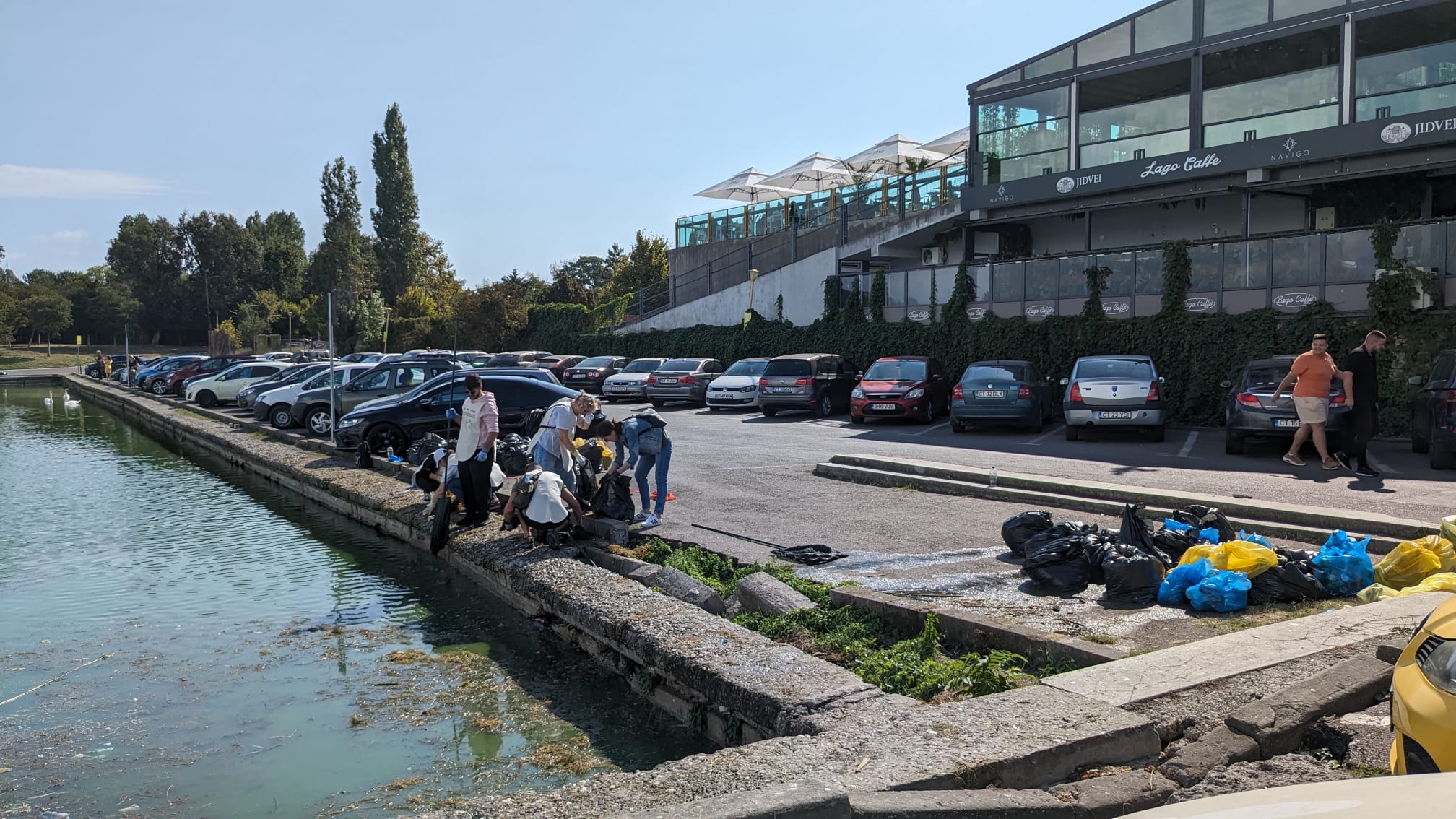 Domnule Coșuleanu, ne aflăm pe malul lacului Tăbăcărie din Parcul Tăbăcărie și mă uit că în fața noastră sunt câteva lebede de un alb imaculat, care înoată într-un lac în total contrast cu această imagine – plin de murdărie, plin de vegetație acvatică degradată. Și dumneavoastră, împreună cu voluntari și reprezentanți ai administrației locale, încercați să remediați puțin situația.