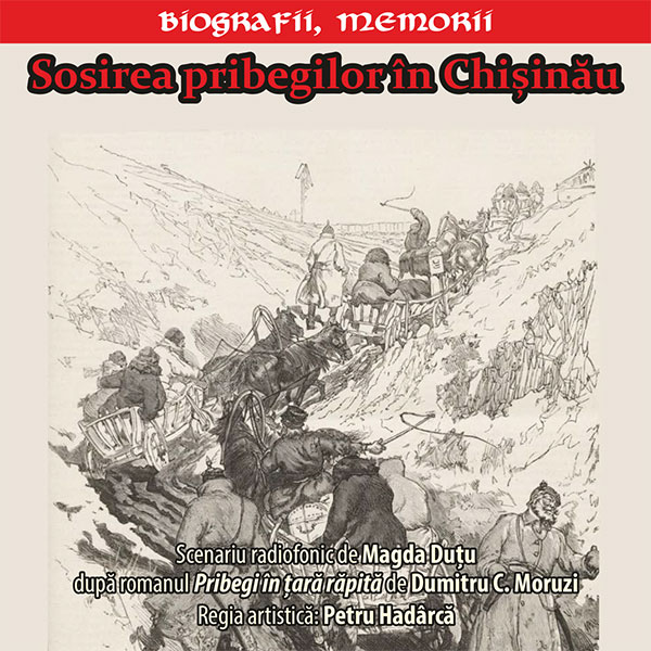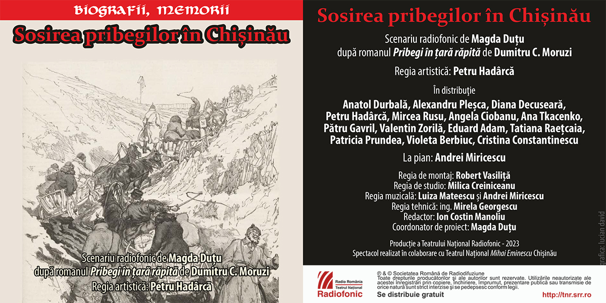 Marți, 26 septembrie 2023, de la ora 19:00, la Radio România Cultural, se va difuza: Sosirea pribegilor în Chișinău. Scenariu radiofonic de Magda Duțu, după romanul Pribegi în țară răpită de Dumitru C. Moruzi. Regia artistică: Petru Hadârcă. În distribuție: Anatol Durbală, Alexandru Pleșca, Diana Decuseară, Petru Hadârcă, Mircea Rusu, Angela Ciobanu, Orodel Olaru, Ana Tkacenko, Dan Melnic, Adrian Păduraru, Mircea Constantinescu, Pătru Gavril, Valentin Zorilă, Daniel Tudorică, Annemary Ziegler, Tatiana Raețcaia, Eduard Adam, Marcelo Cobzariu, Patricia Prundea, Violeta Berbiuc, Cristina Constantinescu. La pian: Andrei Miricescu. La vioară: Marian Grigore. La acordeon: Niculae Gheorghe. Regia de montaj: Robert Vasiliță. Regia de studio: Milica Creiniceanu. Regia muzicală: Luiza Mateescu și Andrei Miricescu. Regia tehnică: ing. Mirela Georgescu. Redactor: Ion Costin Manoliu. Coordonator de proiect: Magda Duțu. Spectacol realizat în colaborare cu Teatrul Național „Mihai Eminescu” Chișinău.