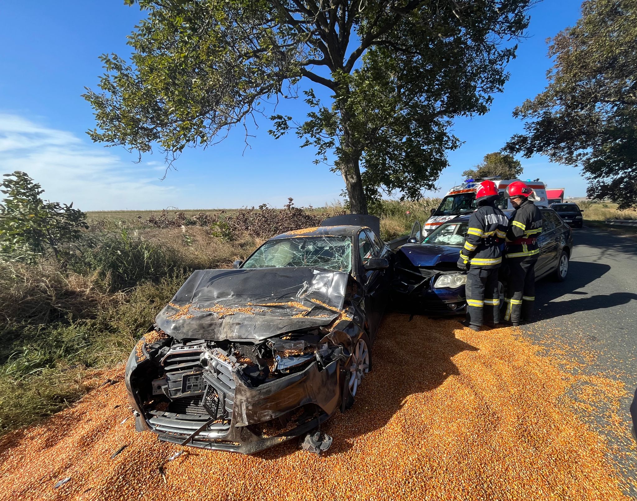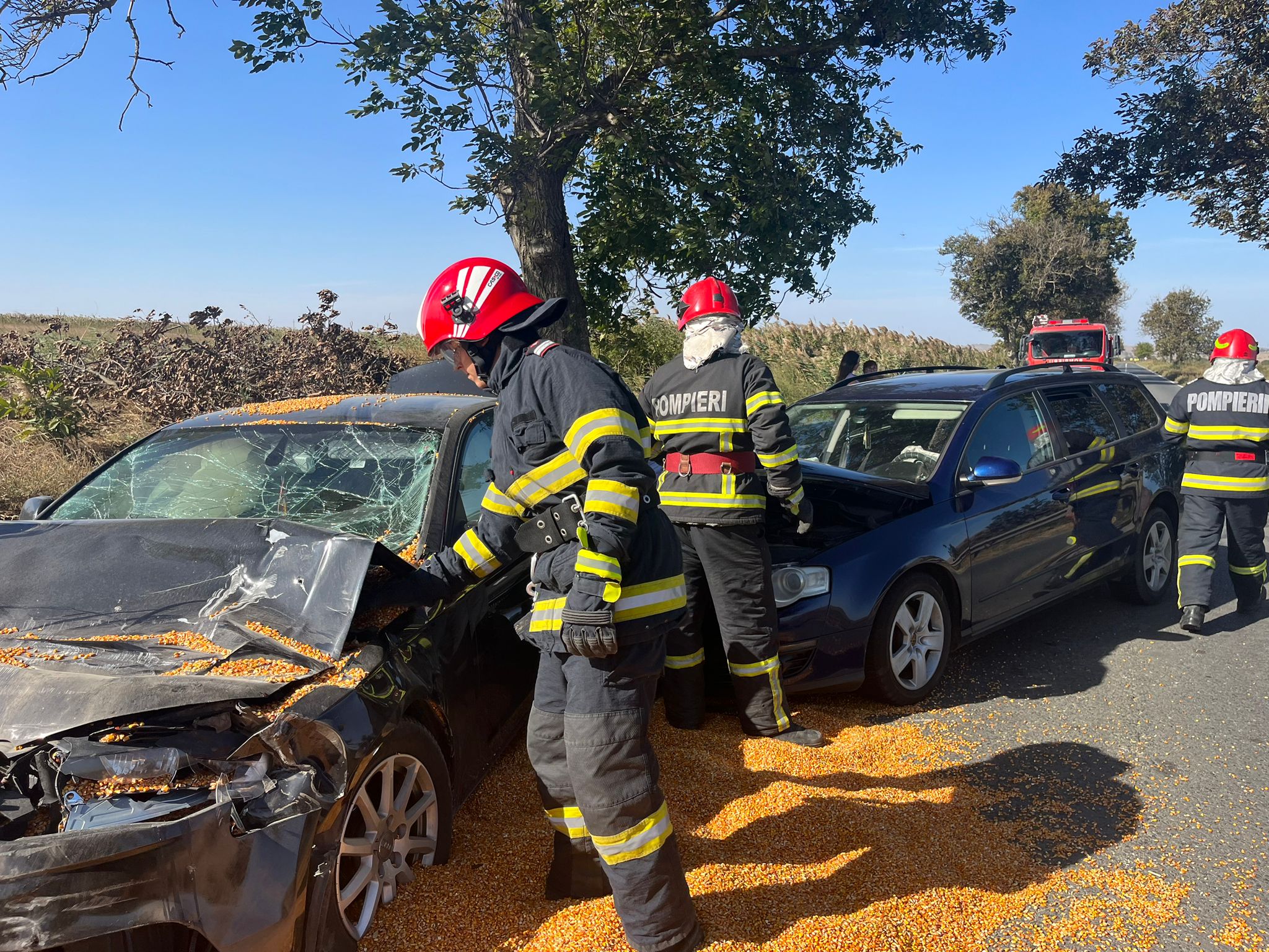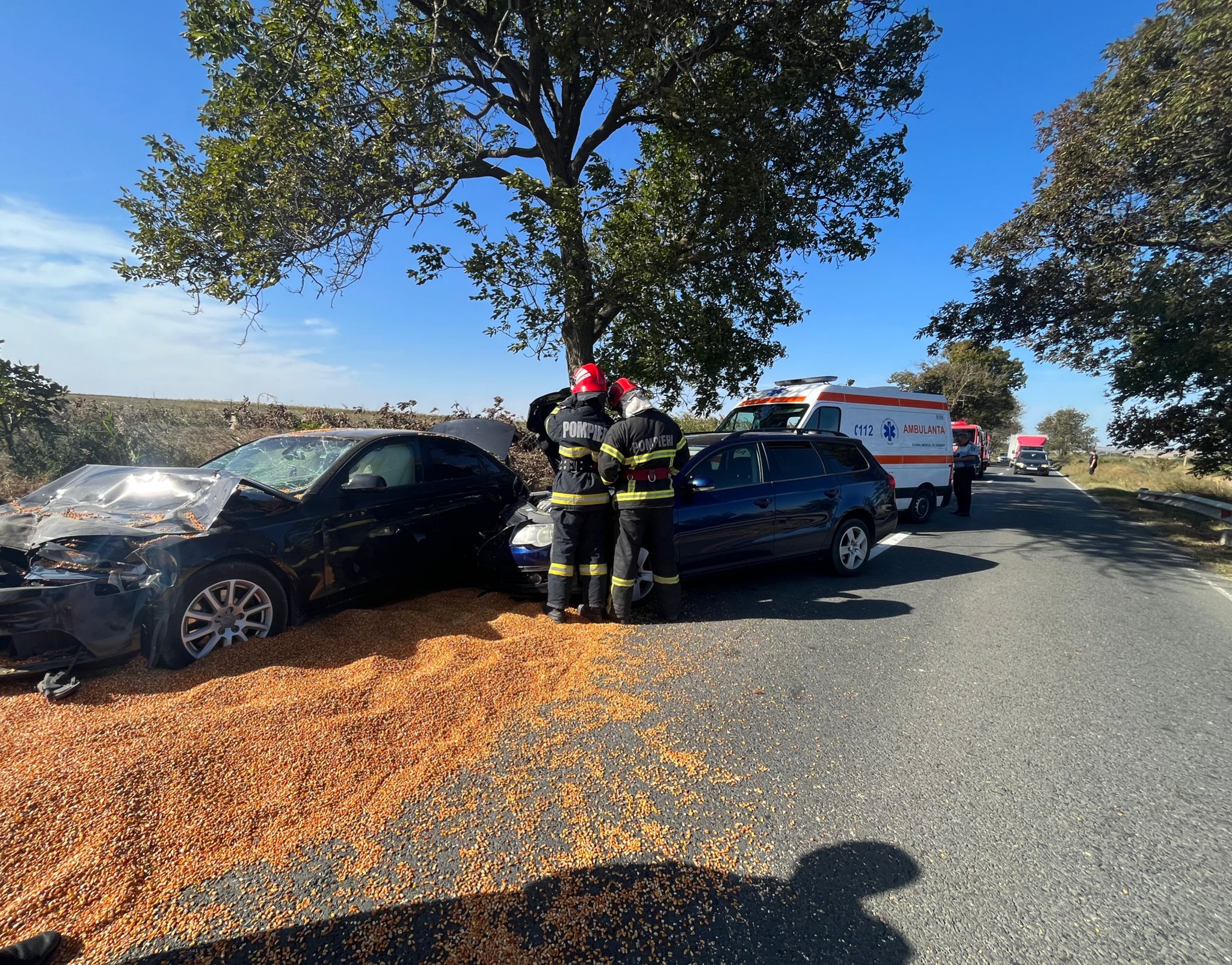 În urmă cu scurt timp, pompierii Detașamentului Tulcea au intervenit în apropiere de localitatea Mihail Kogălniceanu, pe DN 22, la un accident rutier în care au fost implicate două autoturisme și o autoutilitară încărcată cu porumb.