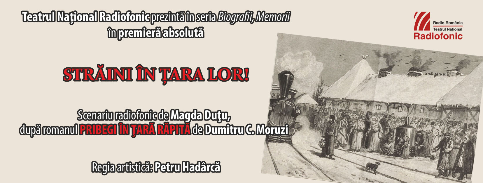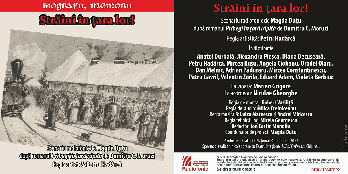 Marți, 3 octombrie 2023, de la ora 19:00, la Radio România Cultural, se va difuza: ”Străini în țara lor!” Scenariu radiofonic de Magda Duțu, după romanul ”Pribegi în țară răpită” de Dumitru C. Moruzi. Regia artistică: Petru Hadârcă. În distribuție: Anatol Durbală, Alexandru Pleșca, Diana Decuseară, Petru Hadârcă, Mircea Rusu, Angela Ciobanu, Orodel Olaru, Ana Tkacenko, Dan Melnic, Ioana Calotă, Adrian Păduraru, Mircea Constantinescu, Pătru Gavril, Valentin Zorilă, Annemary Ziegler, Tatiana Raețcaia, Eduard Adam, Marcelo Cobzariu, Patricia Prundea, Violeta Berbiuc, Cristina Constantinescu. La vioară: Marian Grigore. La acordeon: Niculae Gheorghe. Regia de montaj: Robert Vasiliță. Regia de studio: Milica Creiniceanu. Regia muzicală: Luiza Mateescu și Andrei Miricescu. Regia tehnică: ing. Mirela Georgescu. Redactor: Ion Costin Manoliu. Coordonator de proiect: Magda Duțu. Spectacol realizat în colaborare cu Teatrul Național „Mihai Eminescu” Chișinău.