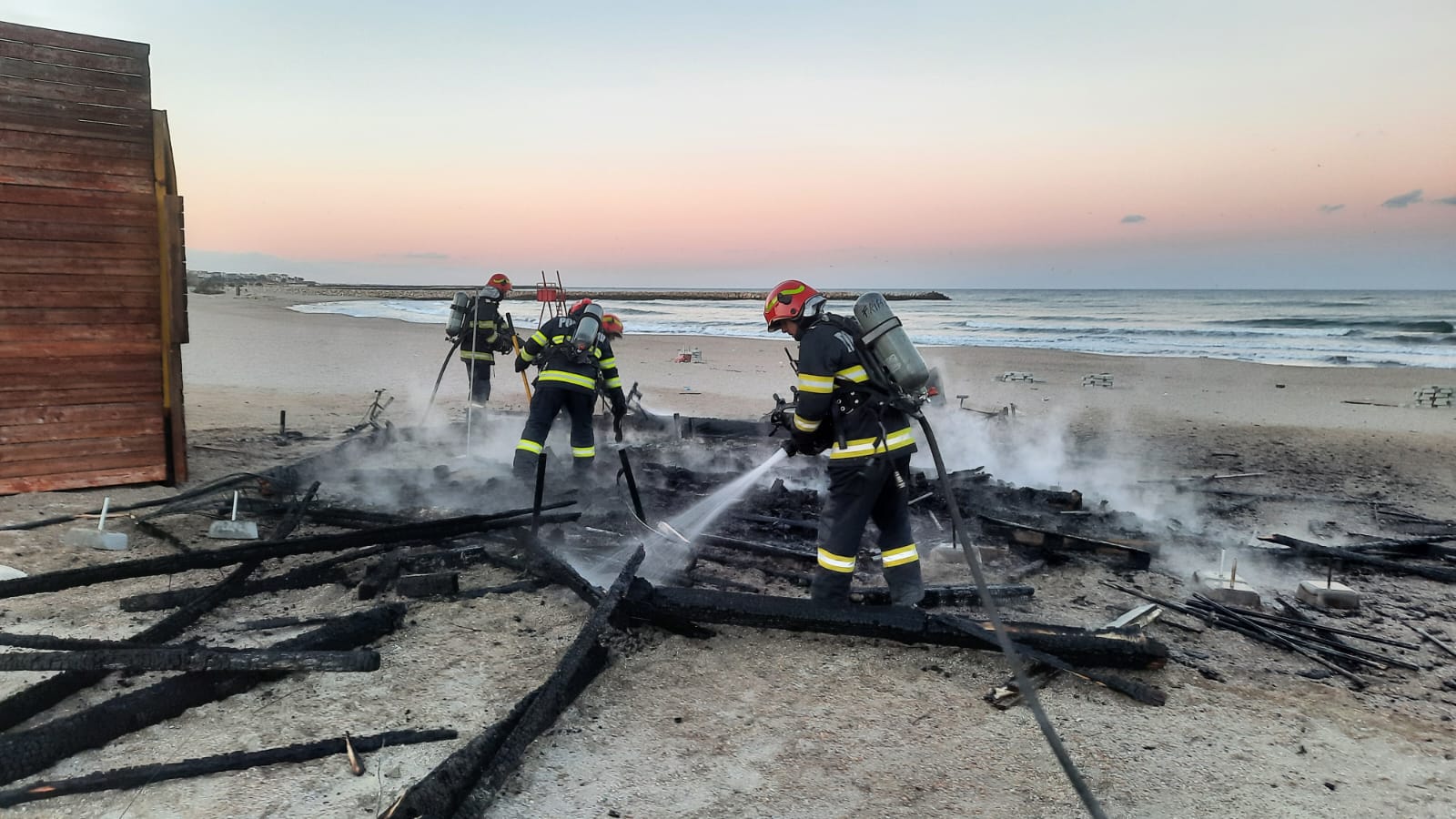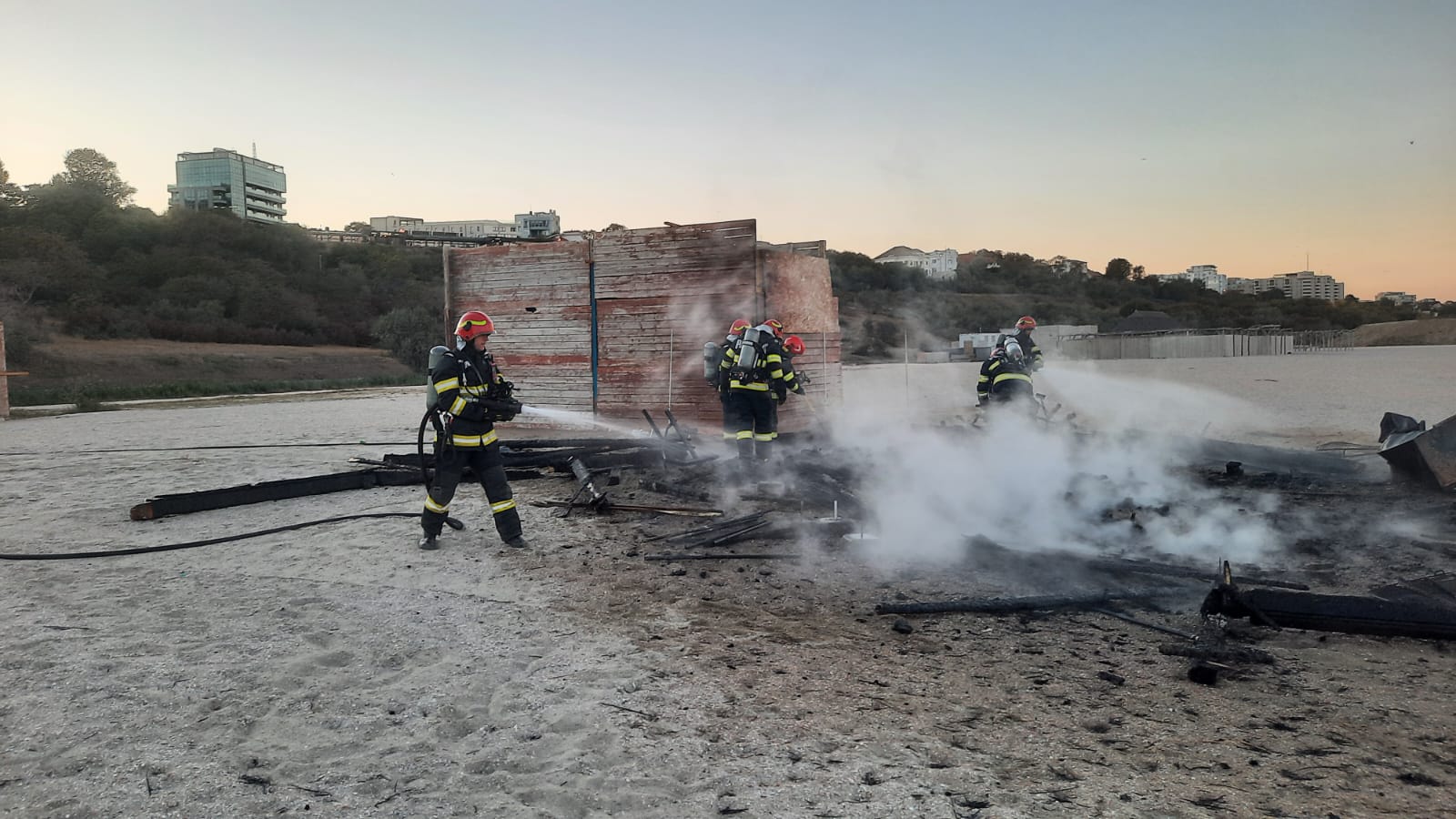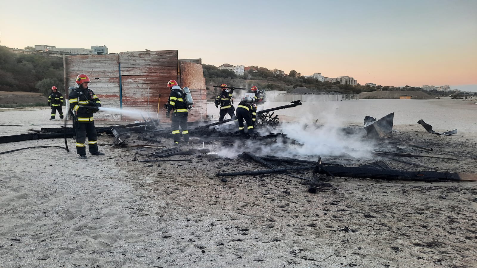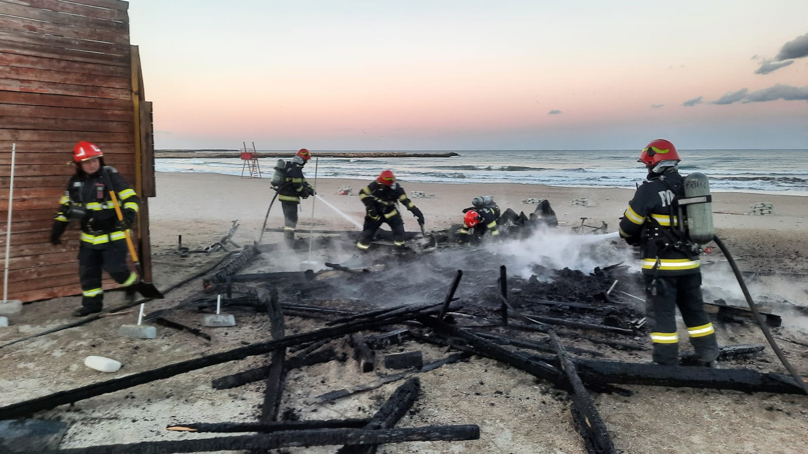 În această seară, în jurul orei 18.00, ISU Dobrogea a fost solicitat să intervină pe plaja Modern, unde o construcţie de lemn a fost cuprinsă de flăcări.