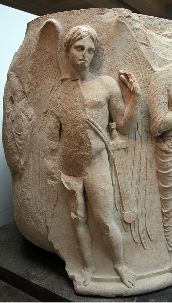 Statueta este din os și este o reprezentare a zeului Thanatos, care este personificarea Zeului Morții în mitologia greacă. Din păcate nu este întreagă. Lipsește mâna stângă și o parte din picioare și, de altfel, lipsesc aripile din spate, pentru că zeul apare tot timpul reprezentat cu două aripi desfăcute la spate, este înaripat.