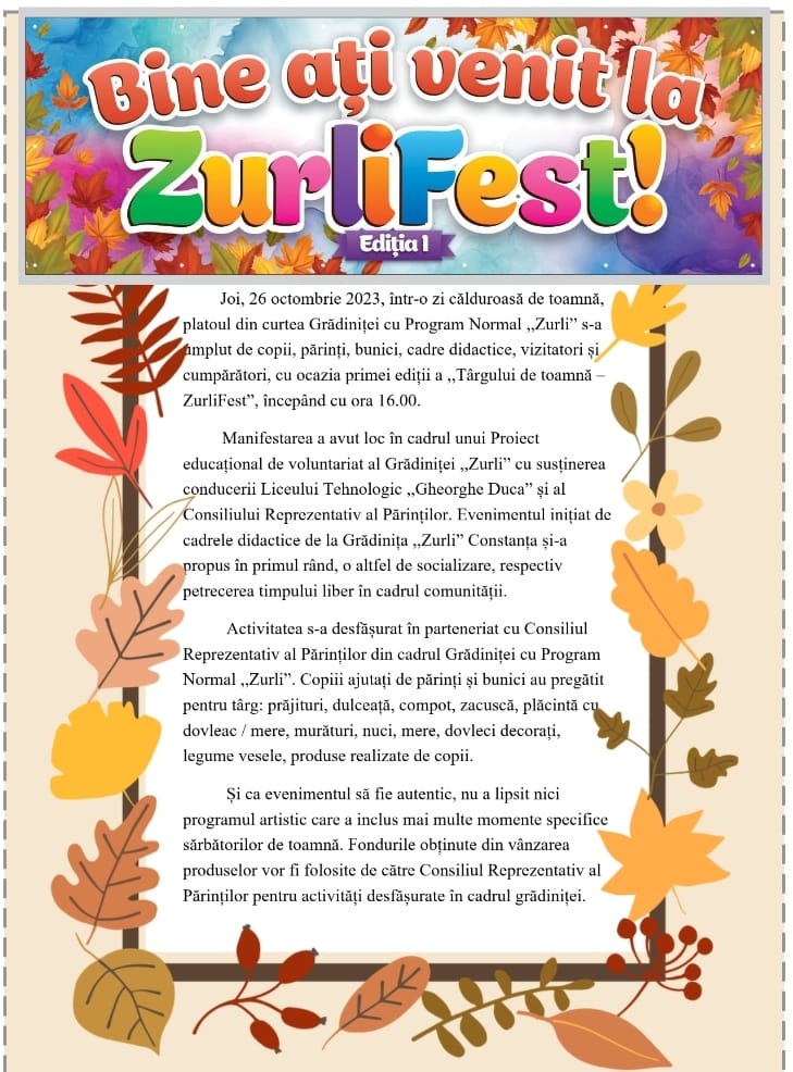 Într-o zi călduroasă de toamnă, platoul din curtea Grădiniței cu Program Normal ,,Zurli” s-a umplut, astăzi, începând cu ora 16.00, de copii, părinți, bunici, cadre didactice, vizitatori și cumpărători, cu ocazia primei ediții a ,,Târgului de toamnă – ZurliFest”.