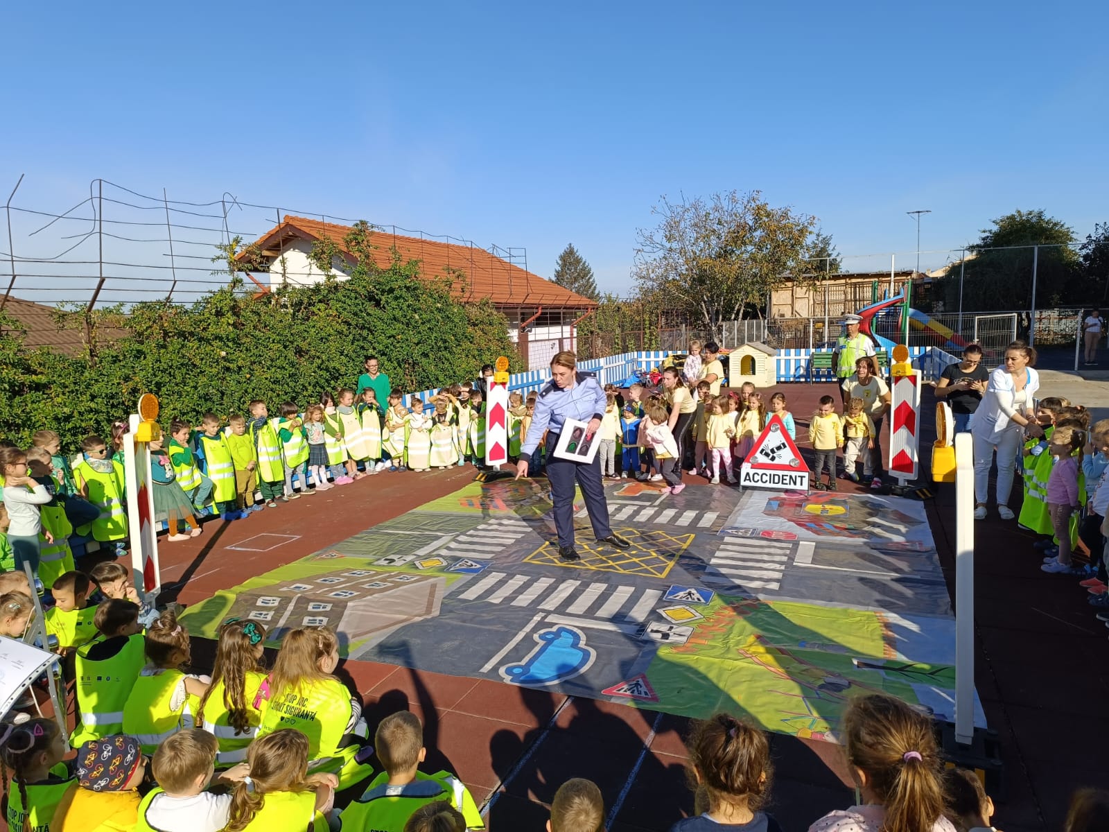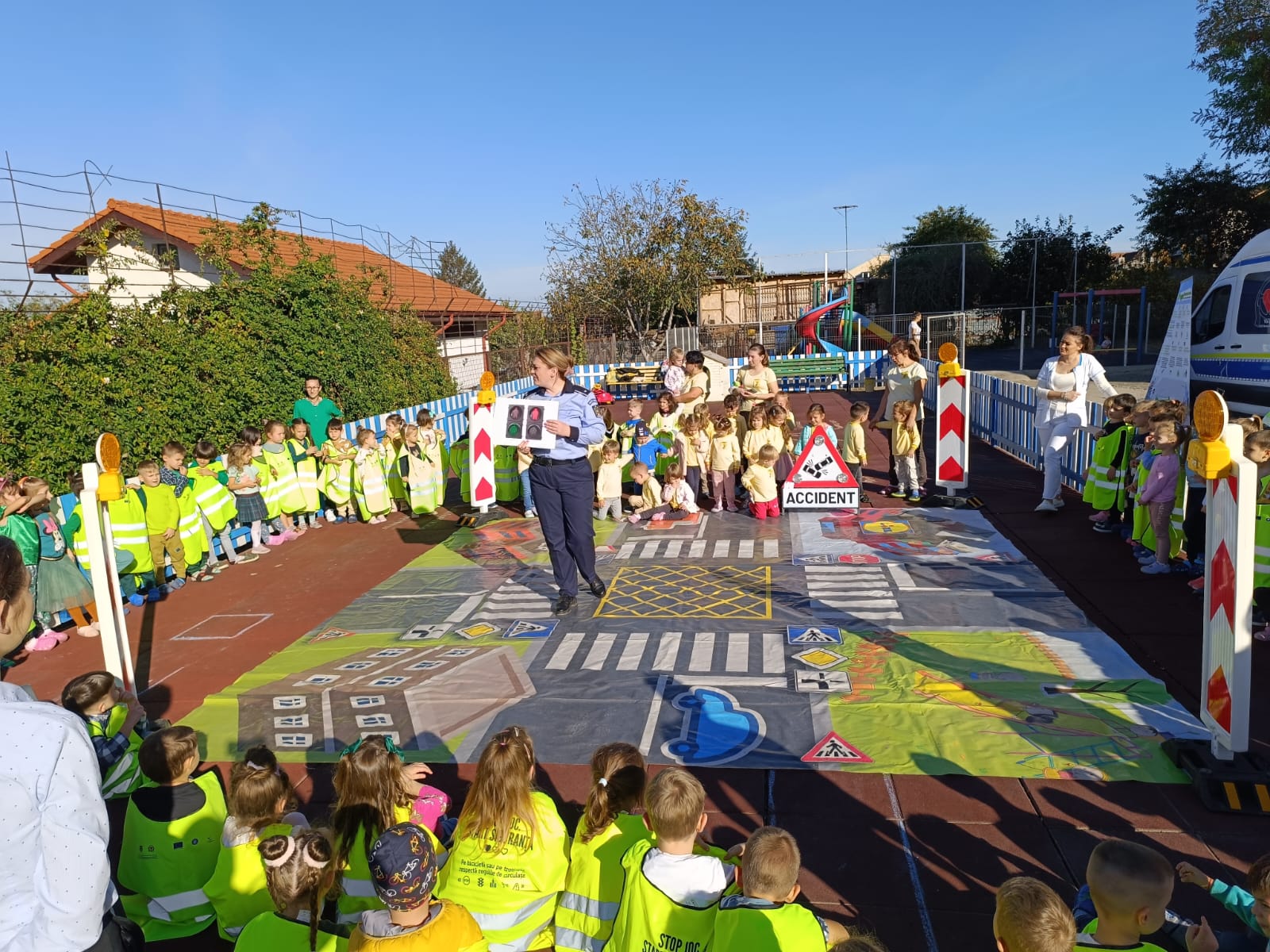 Polițiștii rutieri le-au prezentat celor mici principalele reguli de circulație și le-au pus la dispoziție covorul rutier, cu ajutorul căruia, copiii prezenți au învățat, prin exemple practice oferite de polițiști, cum să circule corect și care este semnificația principalelor indicatoare rutiere.