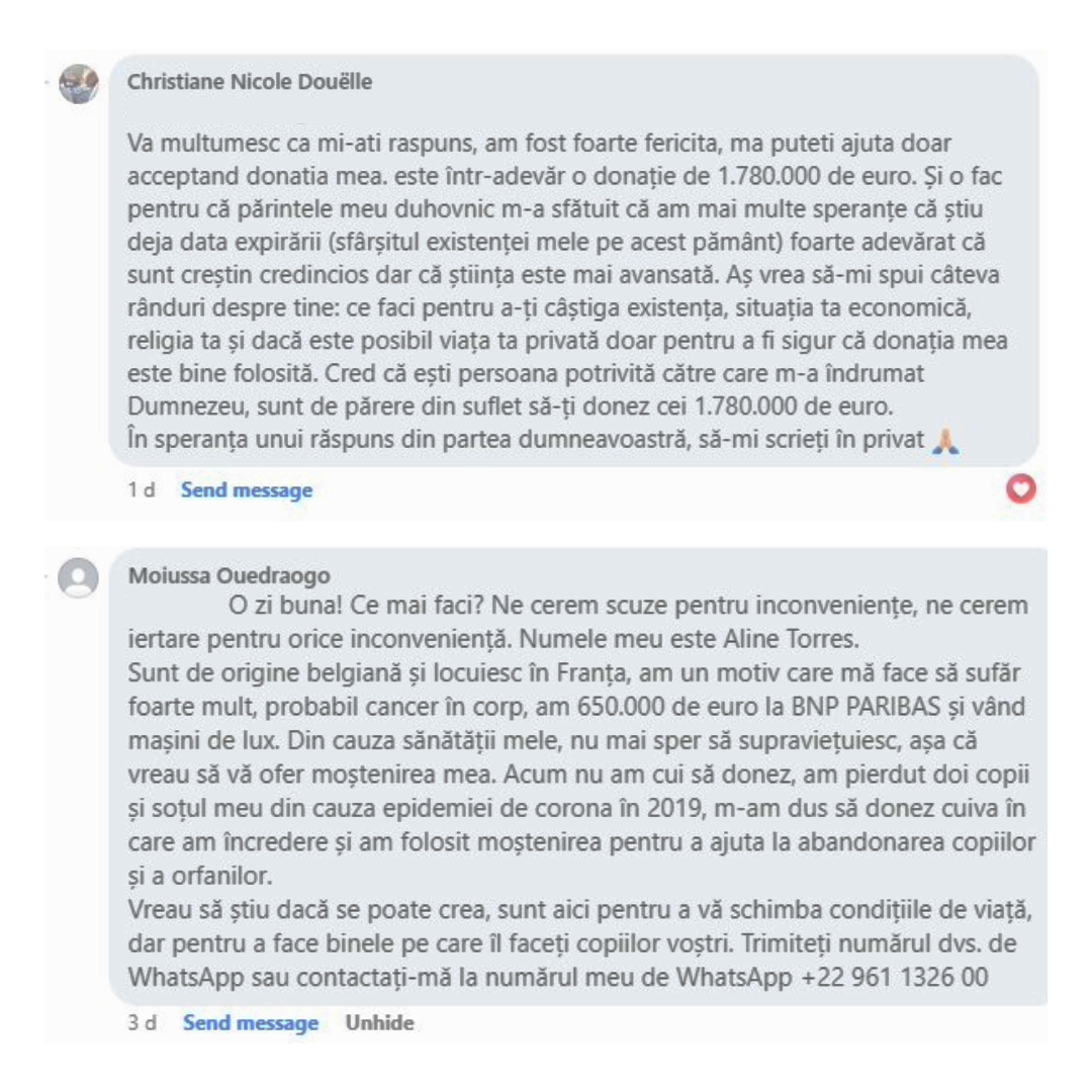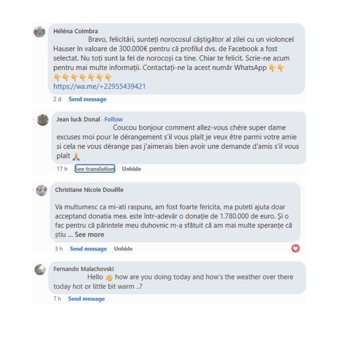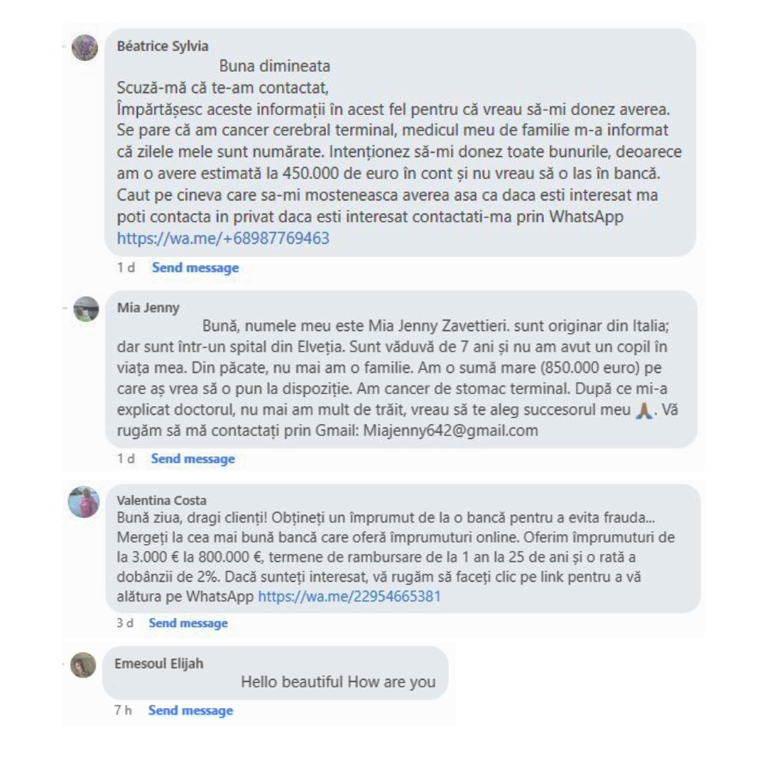 În imagini regăsiți câteva modele de astfel de comentarii și solicitări malițioase: