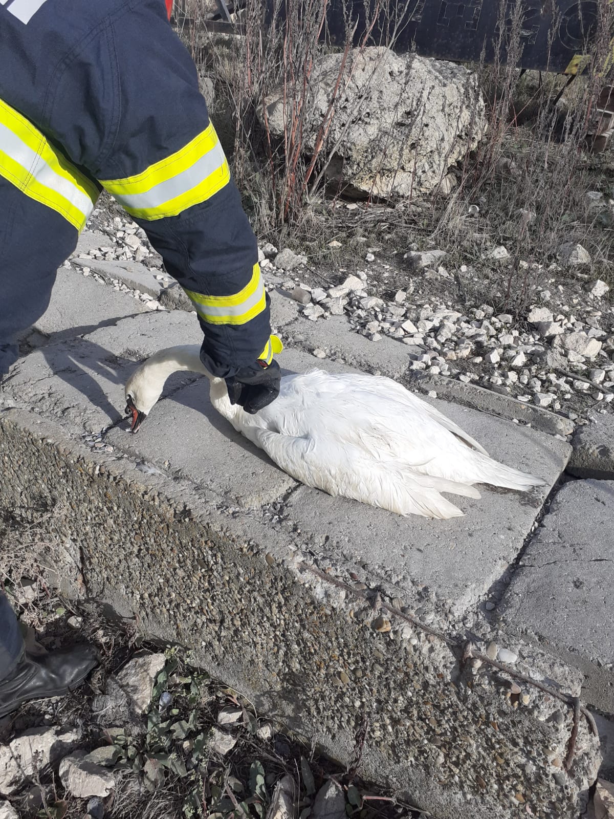 O lebădă care rămăsese blocată între stânci în Dana 2 a Portului Constanța, a fost salvată vineri dimineță de pompierii din cadrul Detașamentului Port.