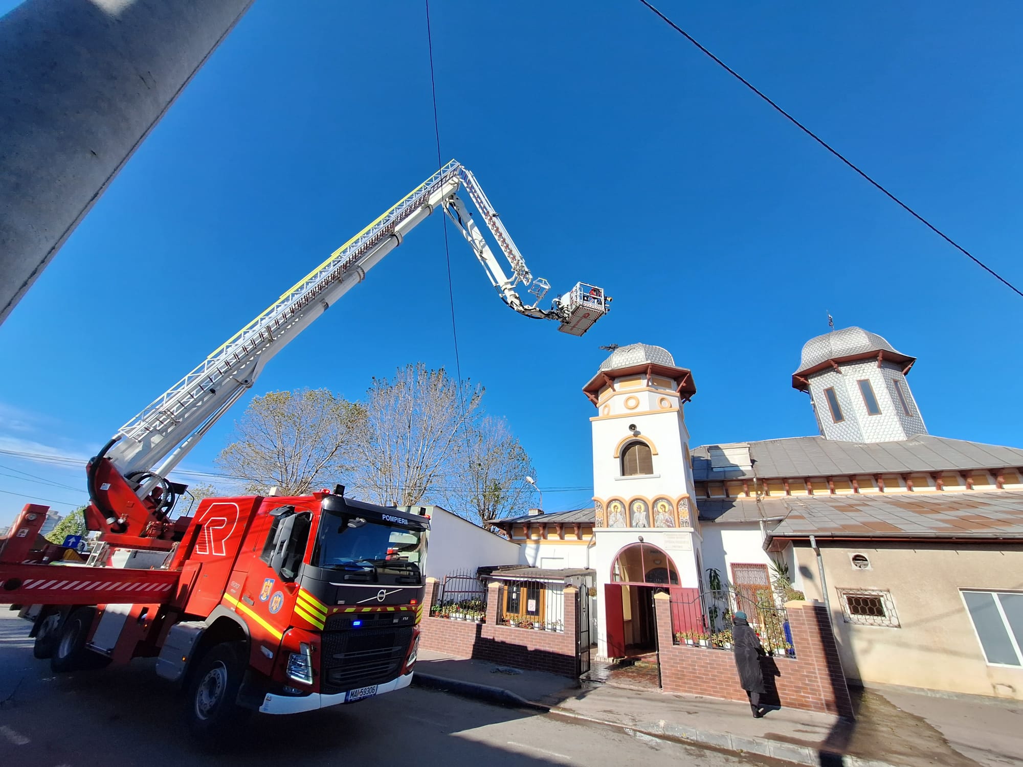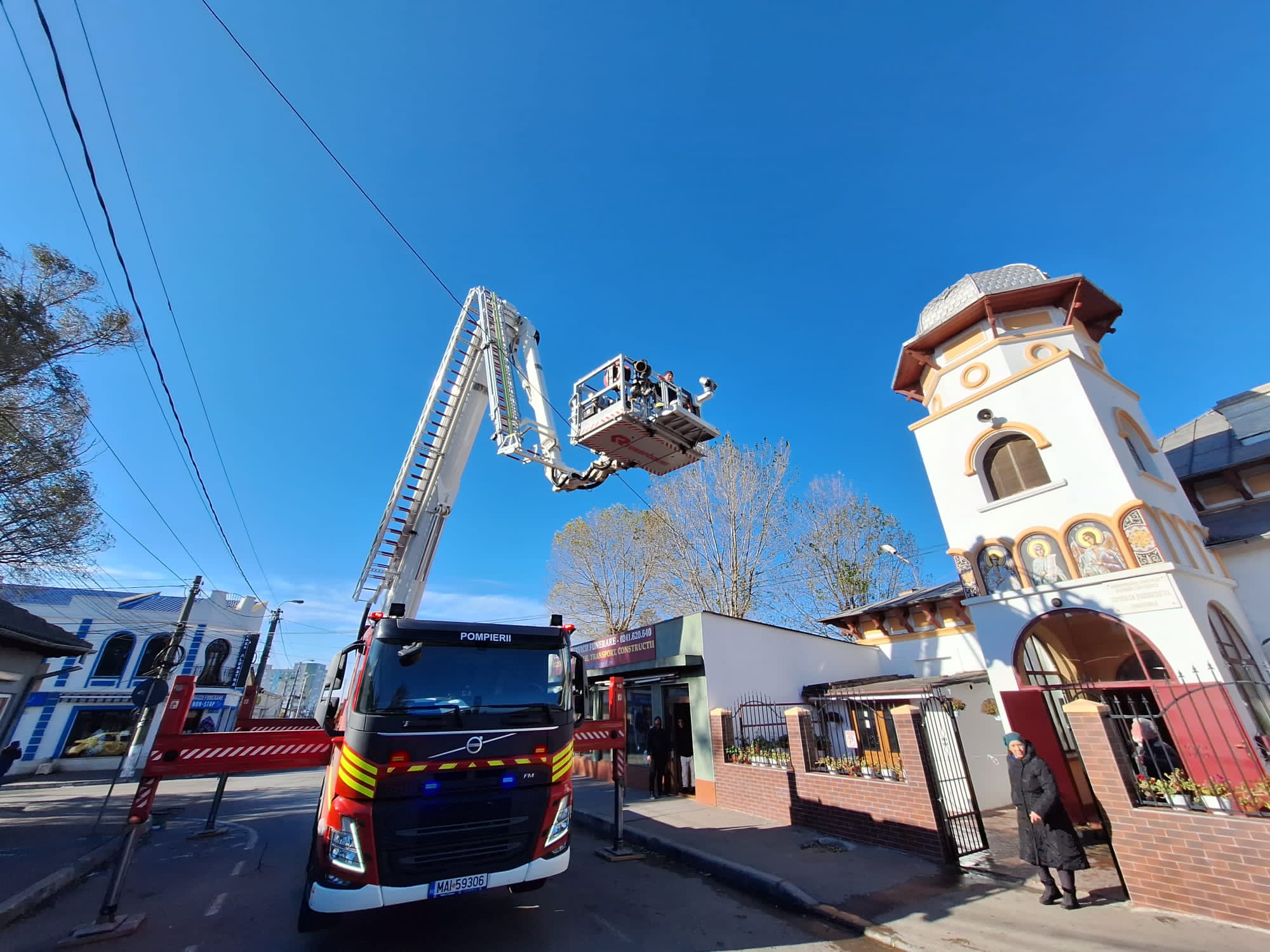 Pompierii militari ai ISU Dobrogea intervin la această oră pentru a împiedica să cadă crucea de pe turla Bisericii Sfânta Parascheva din Constanța.