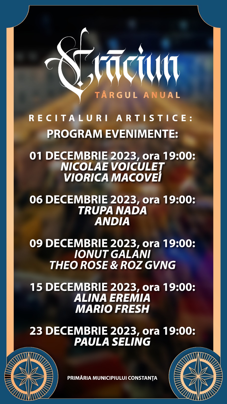 Municipalitatea vă invită să descoperiți atmosfera de sărbătoare și să vă bucurați de surprizele pregătite atât pentru cei mari, cât și pentru cei mici. Nu vor lipsi concertele, atelierele distractive, căsuța lui Moș Crăciun, colindele, trenulețele, dar și numeroasele standuri cu produse artizanale și cu idei de cadouri pentru toți cei dragi.