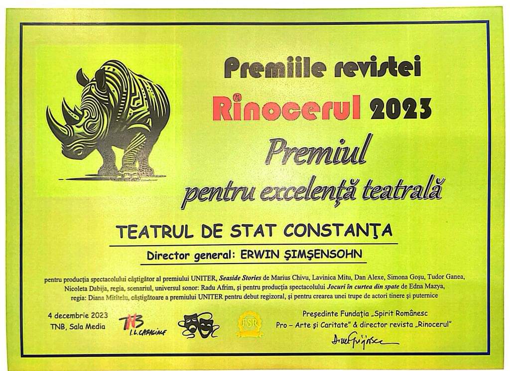Teatrul de Stat Constanța a primit Premiul pentru excelență teatrală, pentru producția spectacolului câștigător al premiului UNITER,  „Seaside Stories”, de Marius Chivu, Lavinica Mitu, Dan Alexe, Simona Goșu, Tudor Ganea, Nicoleta Dabija, regia, scenariul, universul sonor – Radu Afrim, și pentru producția spectacolului „Jocuri din curtea din spate” de Edna Mazyra, regia – Diana Mititelu, câștigătoare a premiului UNITER pentru debut regizoral, precum și pentru crearea unei trupe de actori tinere și puternice.