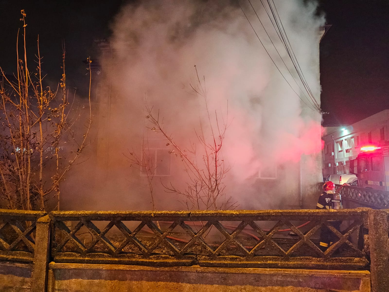 A ars o camera pe o suprafață de 20 mp, restul locuinței, P+1, fiind afectat de fum.