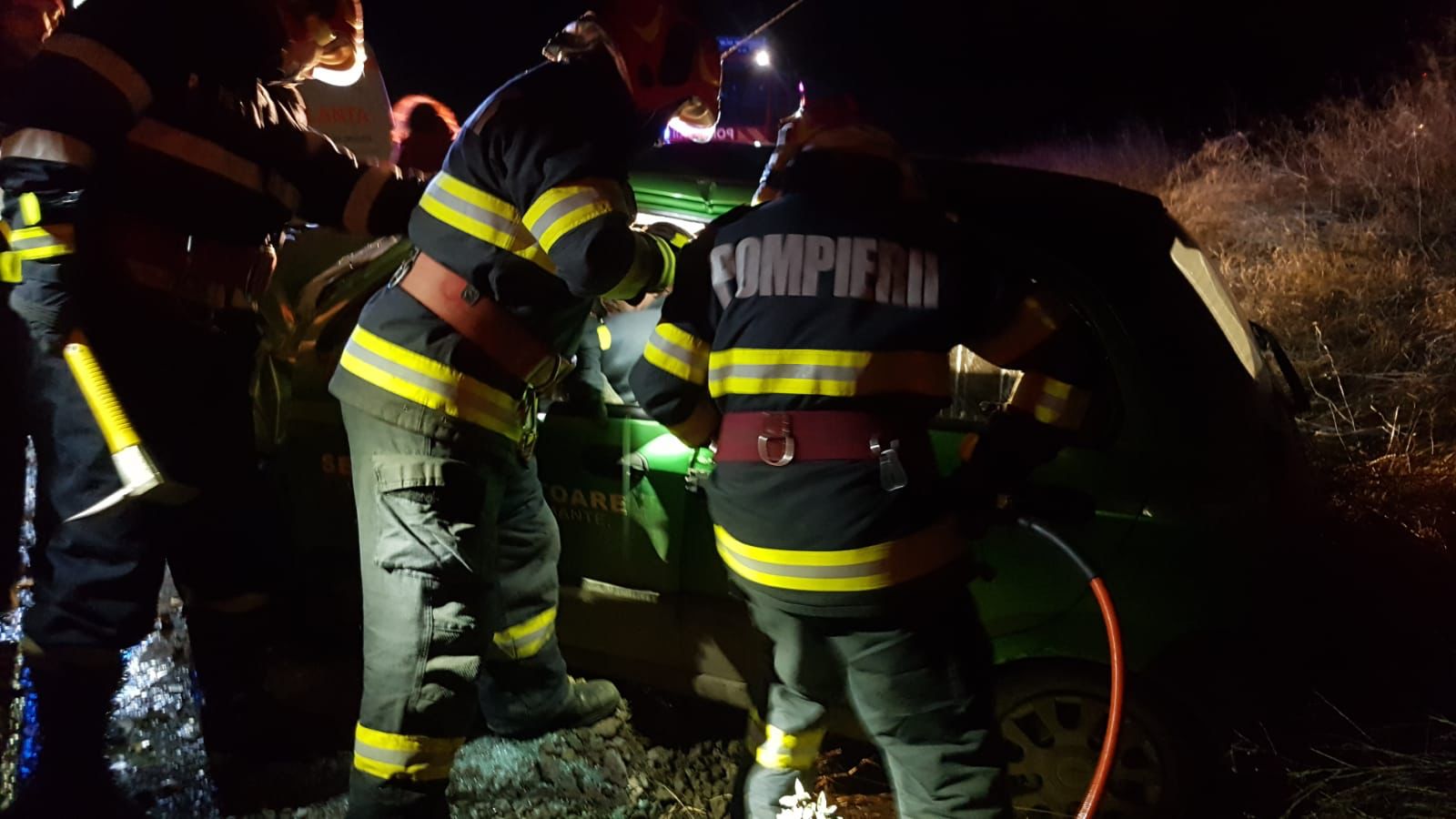 Pompierii militari au descarcerat și extras un bărbat de 64 de ani dintr-un autoturism, iar a doua persoană a reușit să se autoevacueze până la sosirea echipajelor de intervenție.
