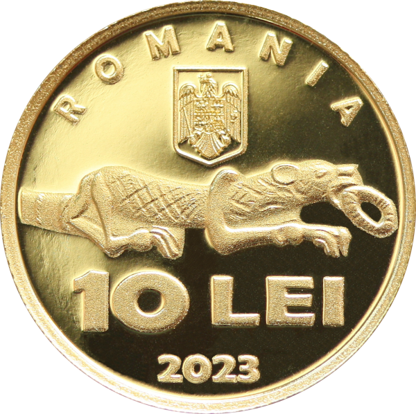 Aversul monedei prezintă una dintre extremitățile în formă de animal a diademei princiare de la Bunești-Averești, inscripția „ROMANIA” în arc de cerc, stema României, valoarea nominală          „10 LEI” și anul de emisiune „2023”.
