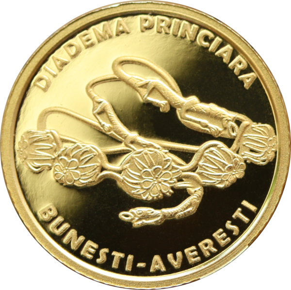 Reversul monedei redă reprezentarea și denumirea diademei princiare de la Bunești-Averești.