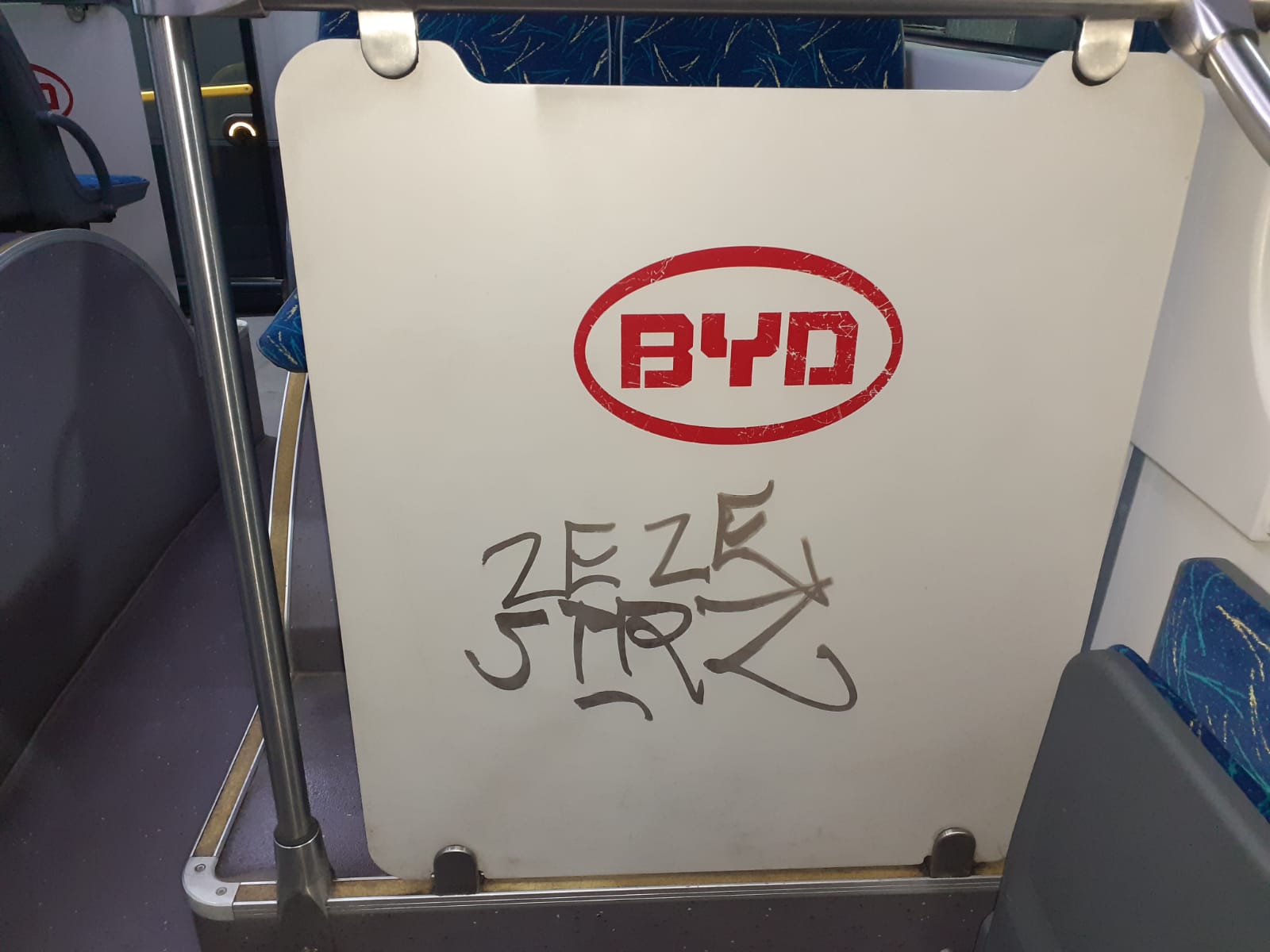 Un “artist plastic”, autointitulat ZEZE, a transformat panourile de la interiorul câtorva autobuze în spații pentru ceea ce el consideră aparent artă, dar care nu reprezintă altceva decât un mod condamnabil de a se face remarcat.