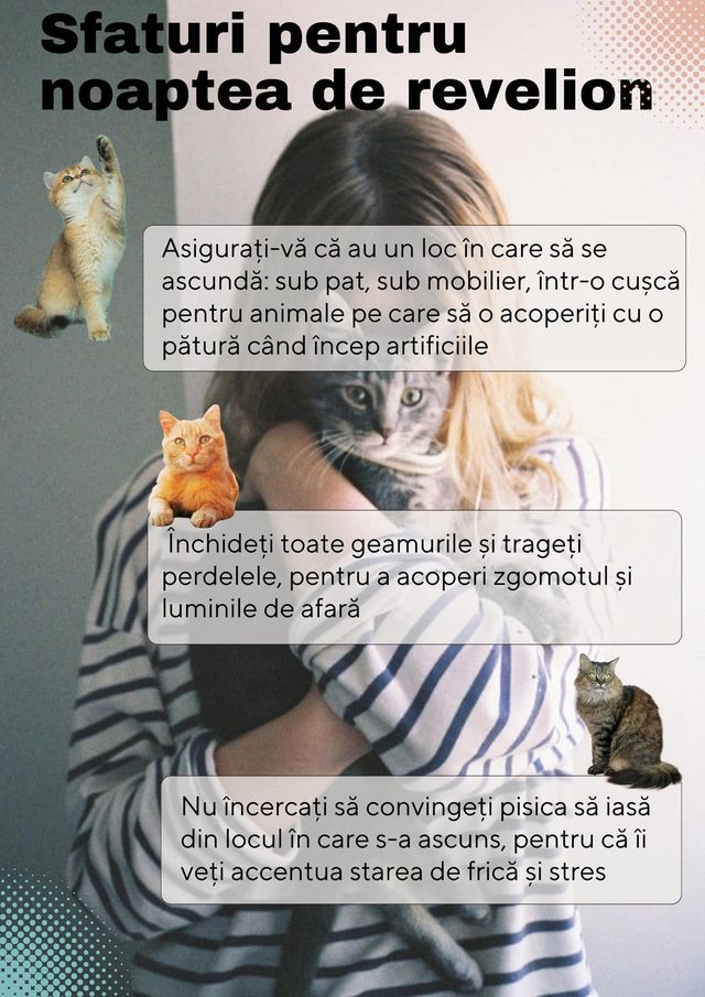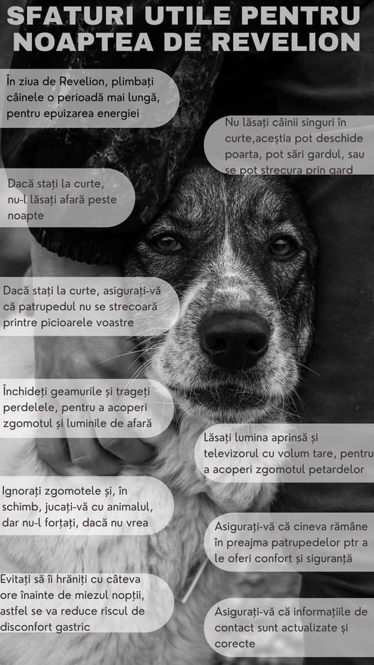 Asociațiile de protecție a animalelor, copleșite an de an de zecile de anunțuri privind dispariția animalelor speriate, vin cu sfaturi pentru noaptea de Revelion, astfel încât stresul animalelor de companie să fie diminuat: