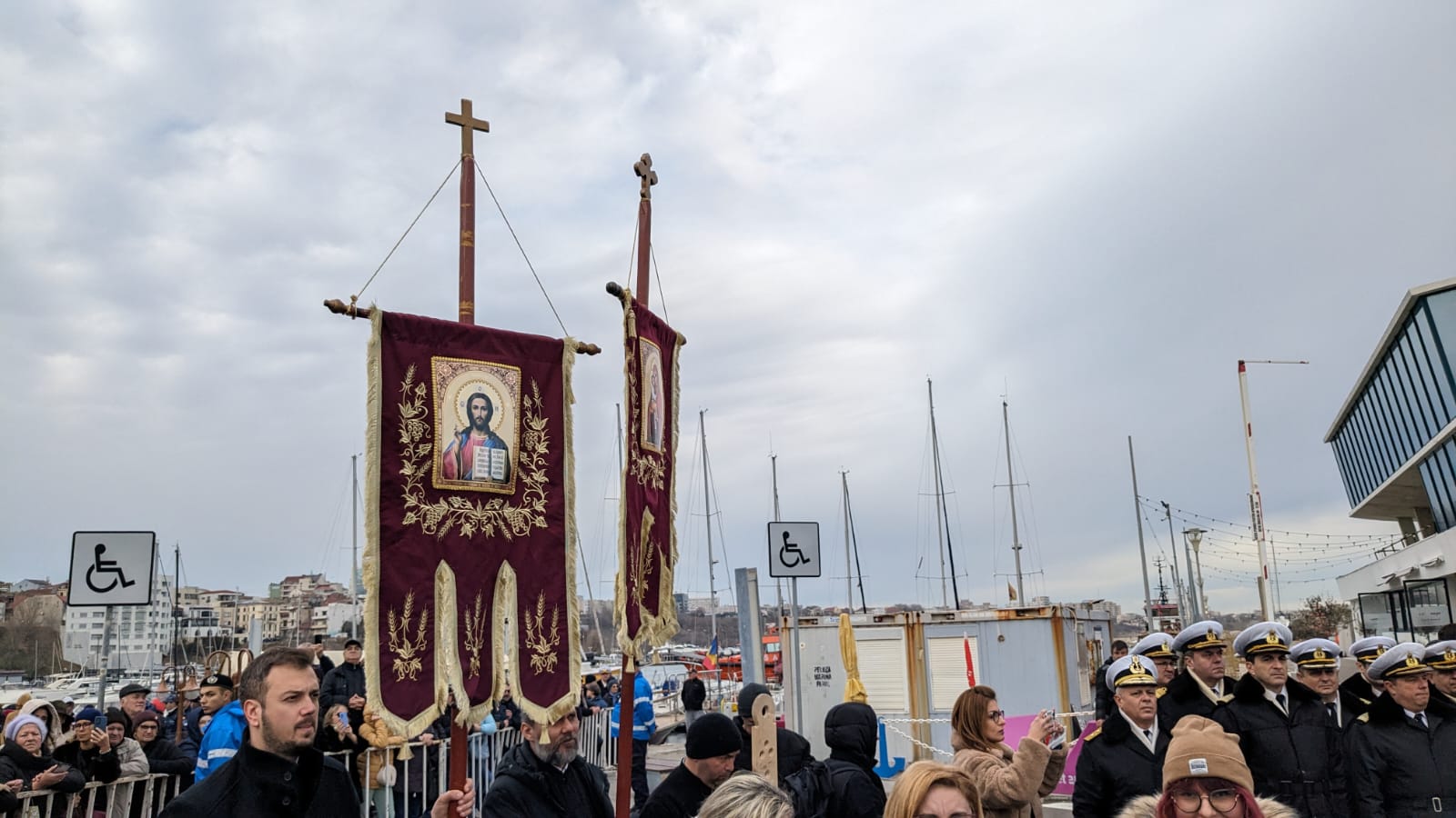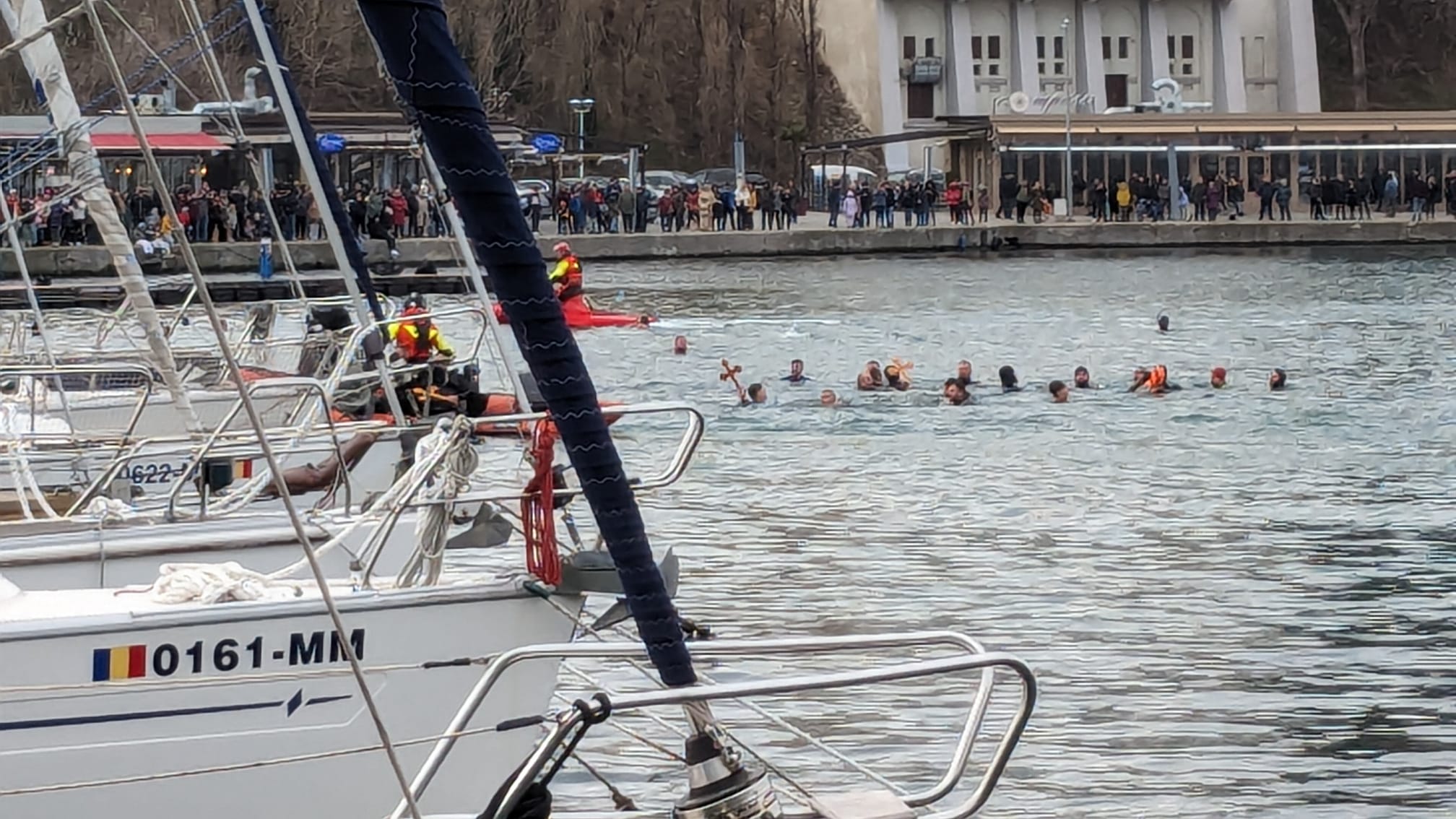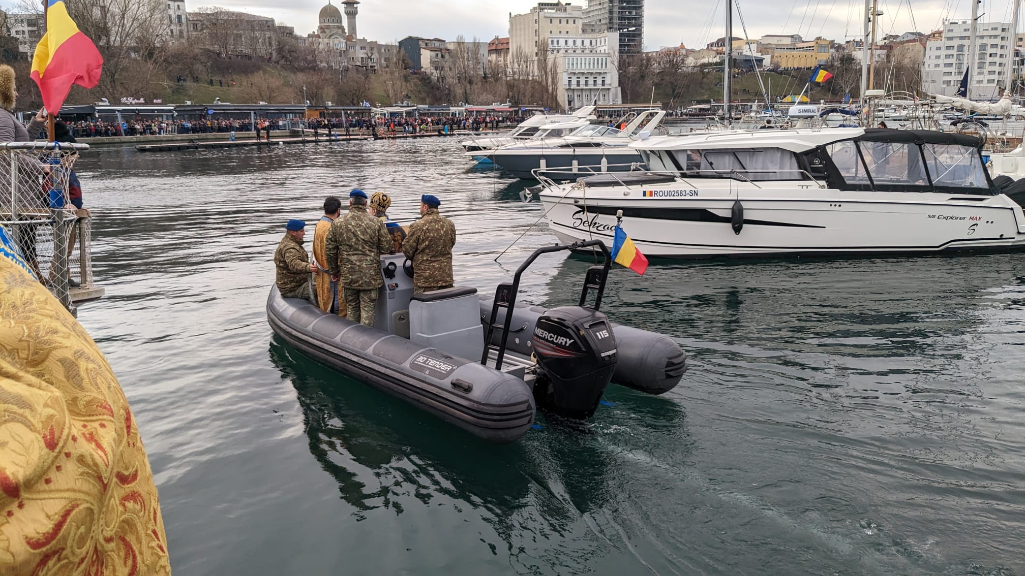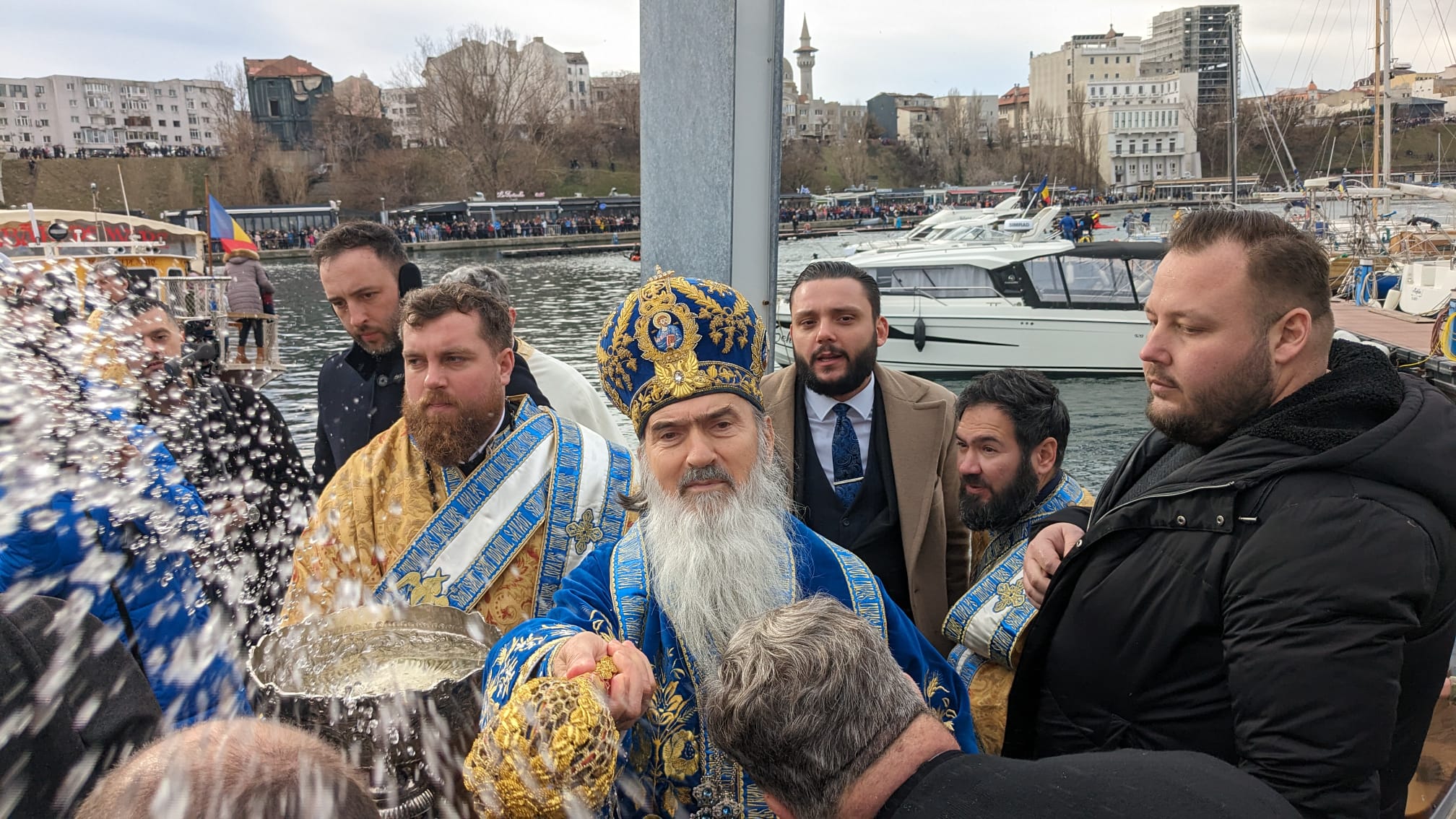 A urmat sfințirea apelor mării, pentru care Arhipiscopul Tomisului a urcat pe o șalupă militară, de unde a aruncat în apă, în bazinul portului turistic, trei cruci de lemn. Peste 30 de tineri au avut îndrăzneala să sară în mare după ele. Unul dintre câștigători, un scafandru militar din Constanța, în vârstă de 28 de ani, ne-a spus că îi va da crucea bunicii sale.