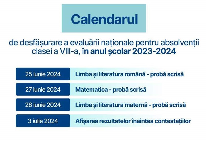 Ultimul Modul de studiu va fi în perioada 8 mai – 21 iunie, excepție făcând elevii claselor a XII-a zi, a XIII-a seral și cei cu frecvență redusă, pentru care anul școlar se încheie la data de 7 iunie, precum și cei din clasa a VIII-a, care termină cursurile la data de 14 iunie 2024.