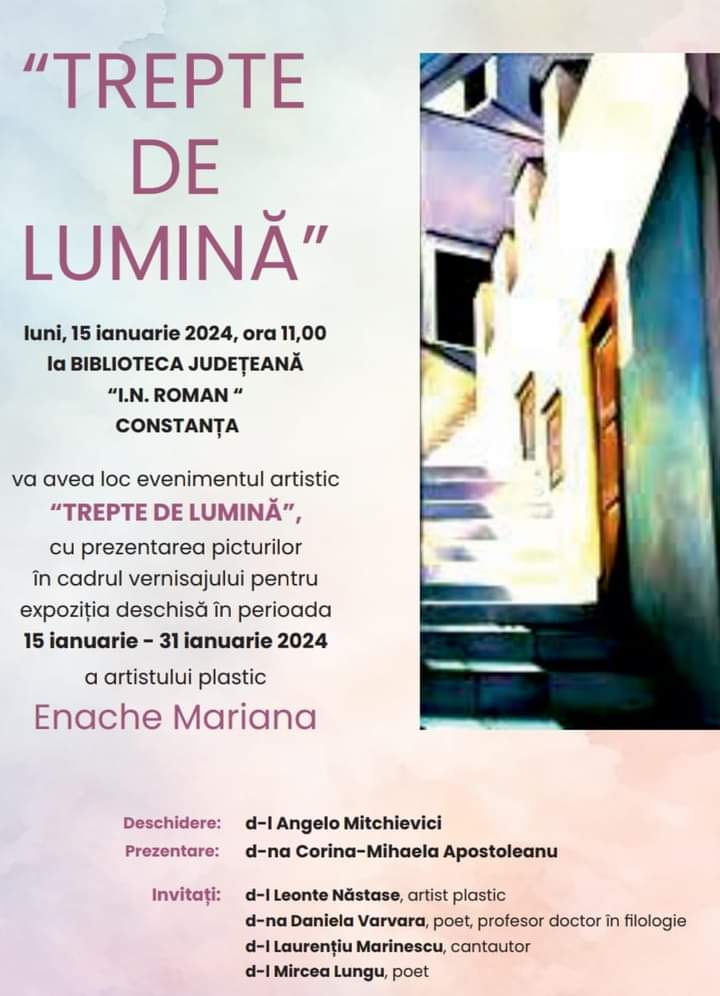 De Ziua Culturii Naționale și Biblioteca Judeteană “Ioan N. Roman” Constanța va fi în sărbătoare. De la ora 11:00, suntem invitati la vernisajul expozitiei de pictură “Trepte de lumină”, a artistului plastic Mariana Enache. În deschidere vor dialoga criticul literar Angelo Mitchievici, directorul acestei instituții de cultură și șeful de secție – Corina Apostoleanu. Expoziția va rămâne deschisă publicului toată luna ianuarie.