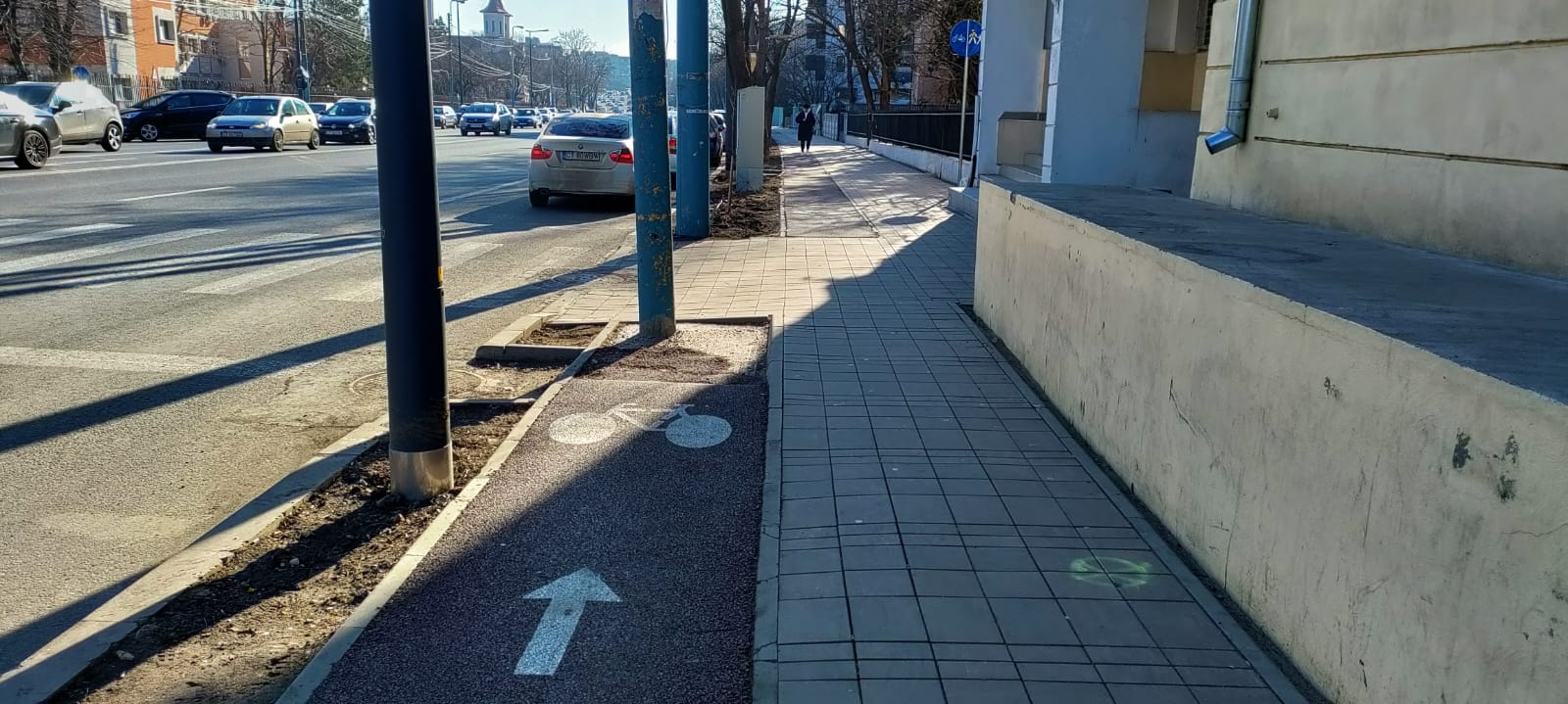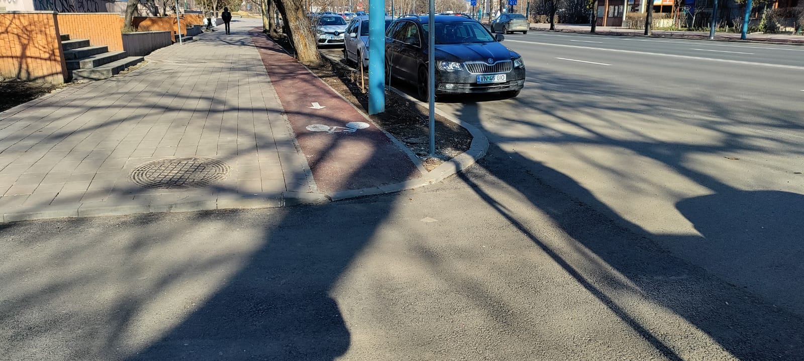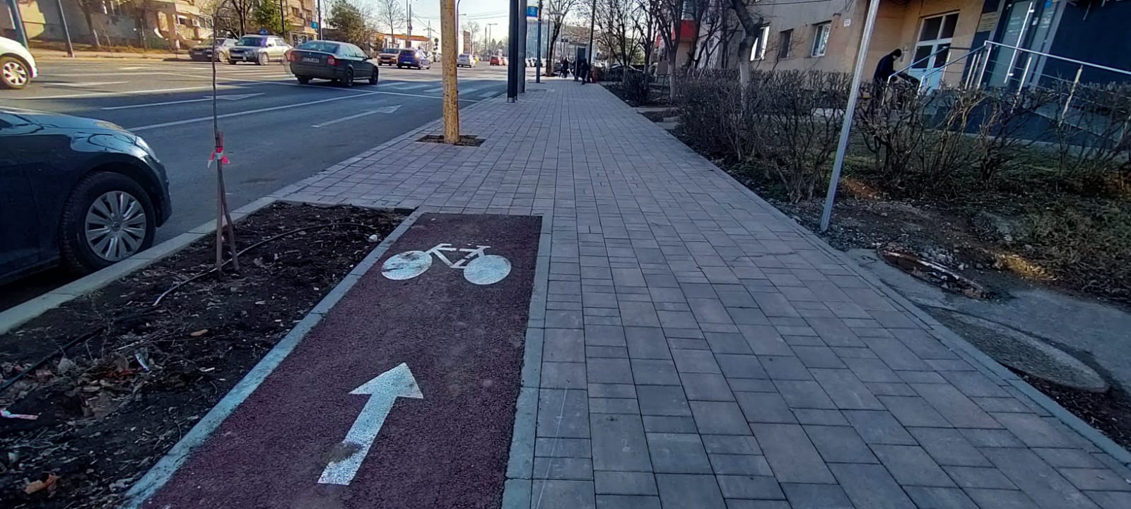 Conform proiectului, în zona respectivă pista de biciclete va fi întreruptă din cauza faptului că lățimea trotuarului nu permite o astfel de amenajare.