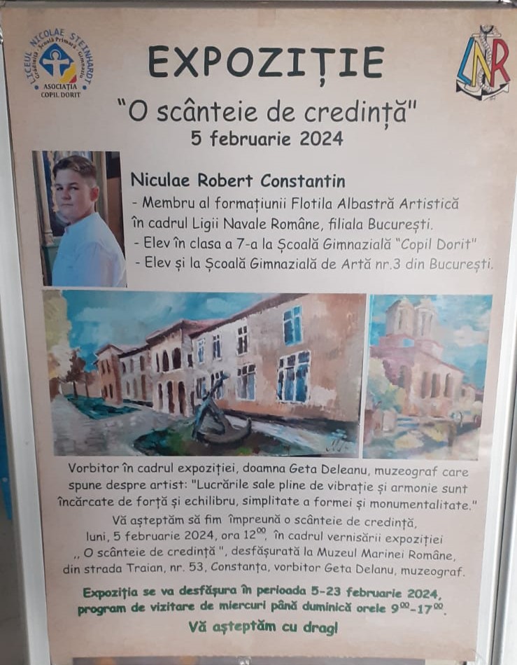 La Muzeul Marinei Române din Constanța, a avut loc vernisajul expoziției de pictură intitulată „O scânteie de credință”, semnată de tânărul artist Robert Niculae, elev al Liceului „Nicolae Steinhardt din București.