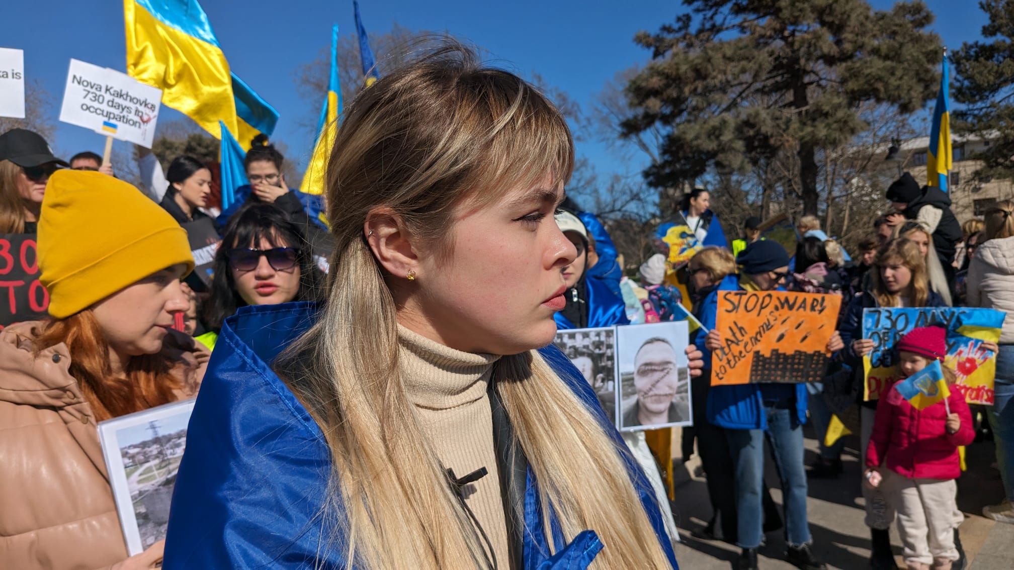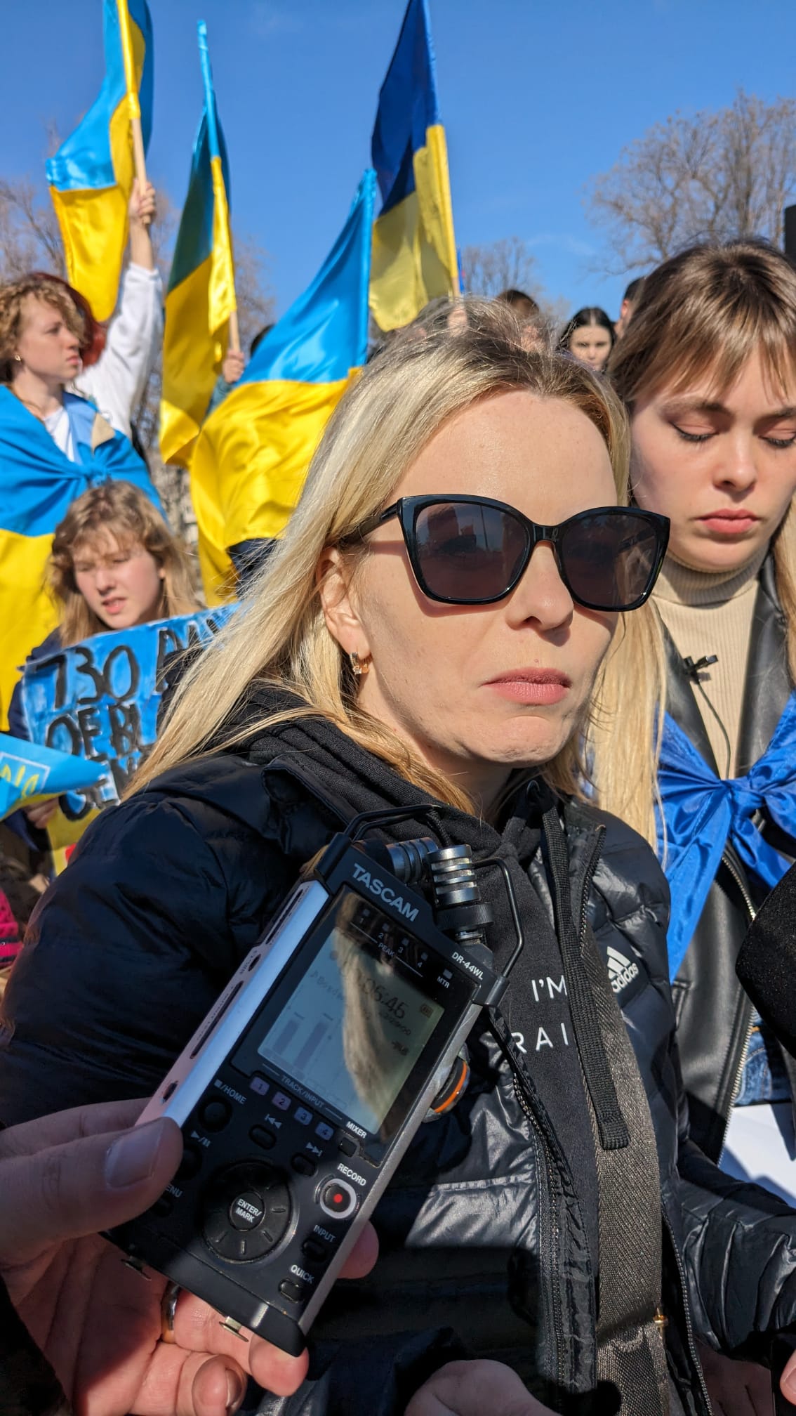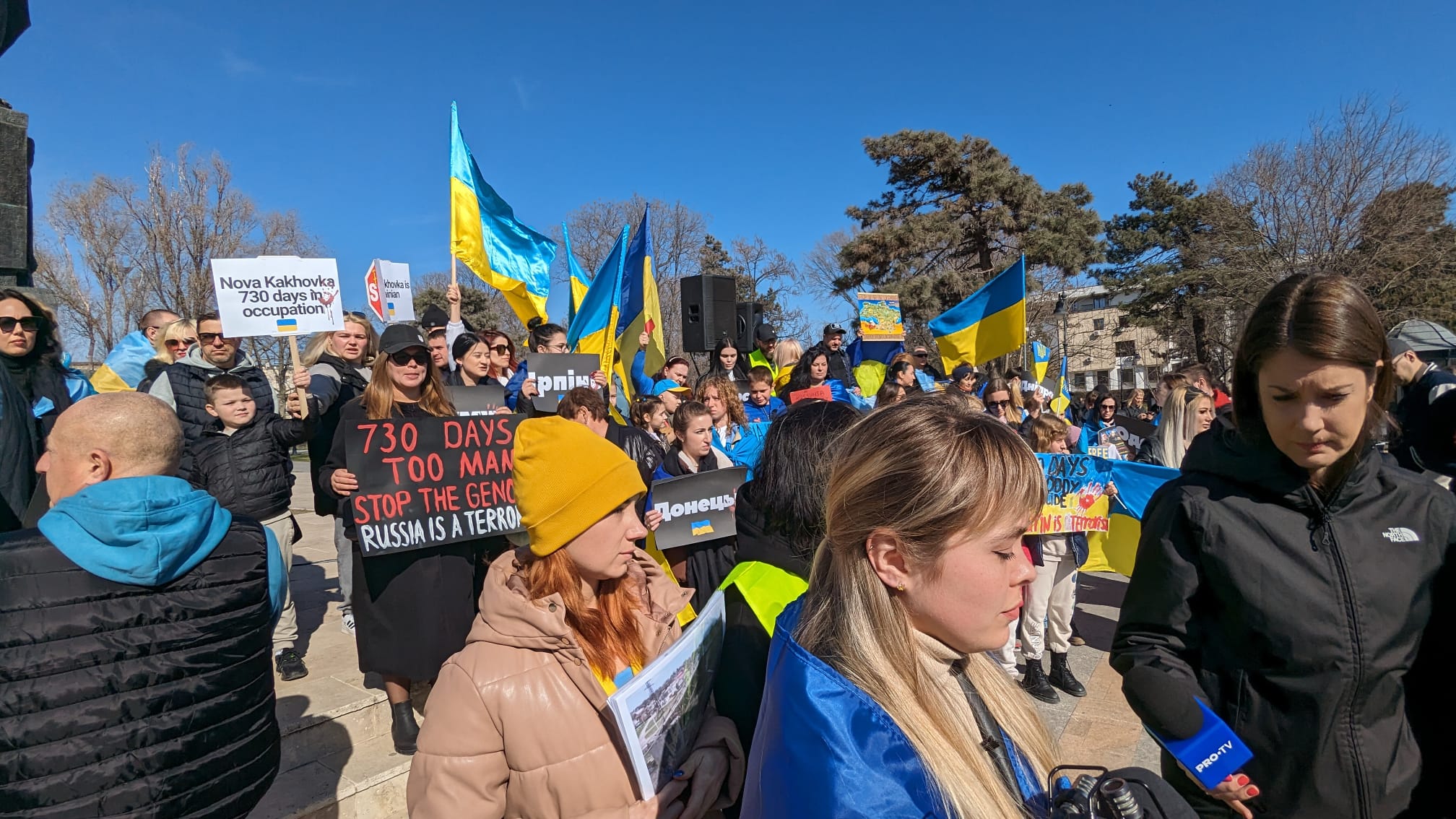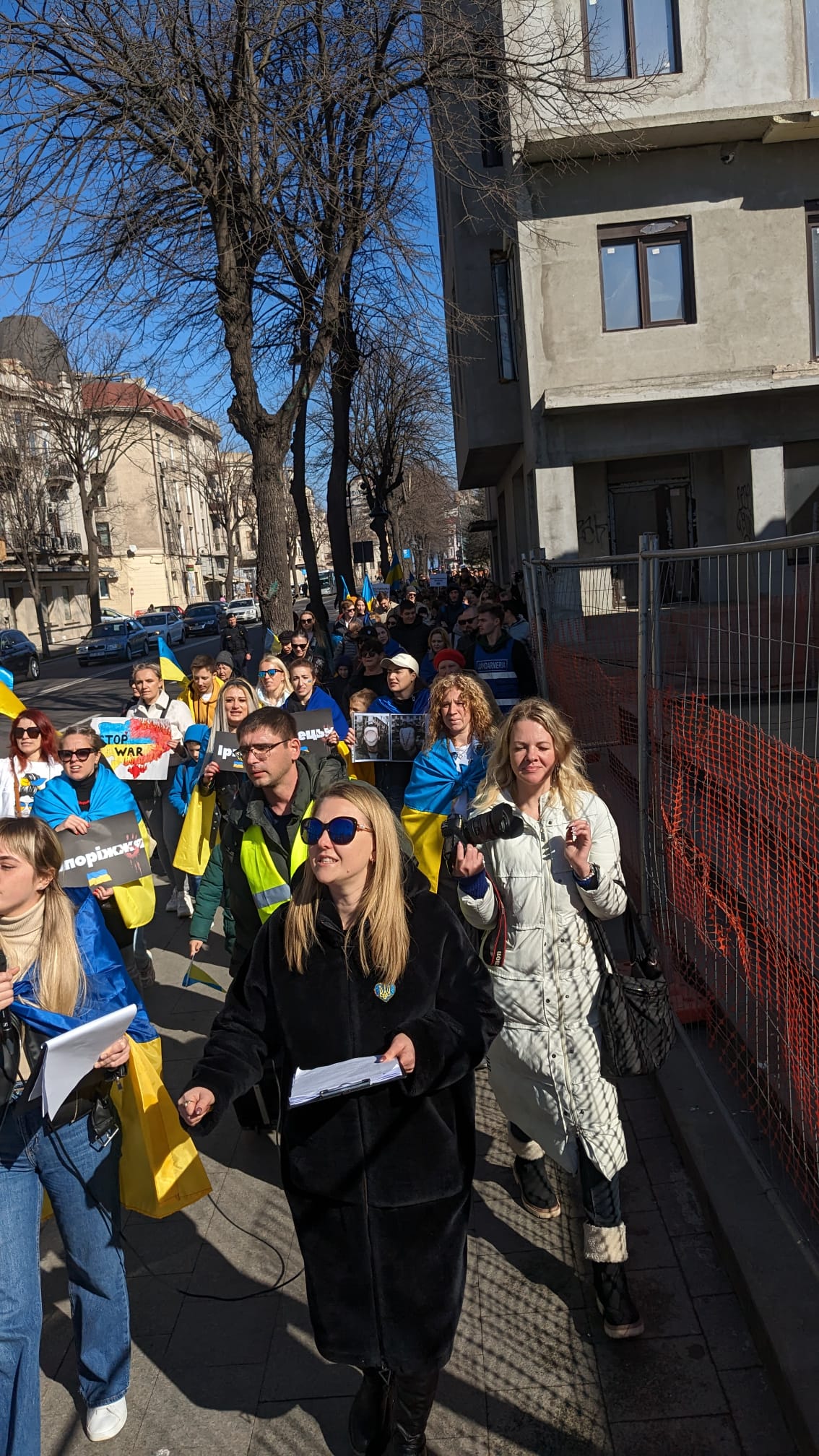 Ne-am adunat pentru a reaminti lumii de cei doi ani sângeroși de genocid al poporului ucrainean. Deja de doi ani Rusia comite crime împotriva populației civile, violează femei și copii, ucide oameni nevinovați, în fiecare zi pe front mor apărătorii noștri, printre ei mulți tineri băieți și fete care ar trebui să aibă toată viața înainte… Ucrainenii apără acum nu doar patria lor, ci și întreaga Europă. Imaginați-vă, războiul este doar la 150 de km de locul în care ne aflăm acum… Dacă nu oprim acum agresorul, rușii vor ocupa Ucraina, vor veni cu războiul în Moldova, țările baltice, alte țări vecine ale Uniunii Europene. Militarilor noștri le este necesar armament! Suntem recunoscători României pentru primirea călduroasă, pentru ajutorul acordat militarilor noștri, pentru ajutorul acordat refugiaților noștri, dar… toți vrem să ne întoarcem acasă!, este mesajul Irynei, participantă la miting. Orașul ei natal, Oleshky (regiunea Herson), a fost ocupat de la începutul invaziei și acum este inundat în proporție de 80% din cauza distrugerii Hidrocentralei Kahovka, iar tatăl ei este prizonier de mai mult de un an și jumătate.