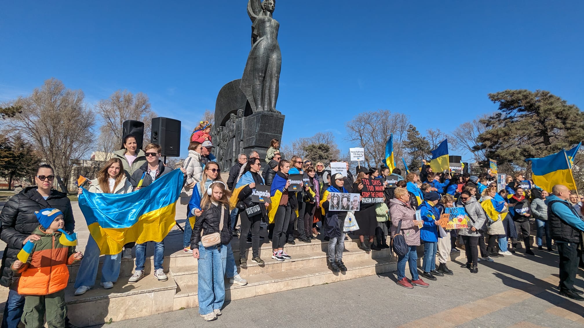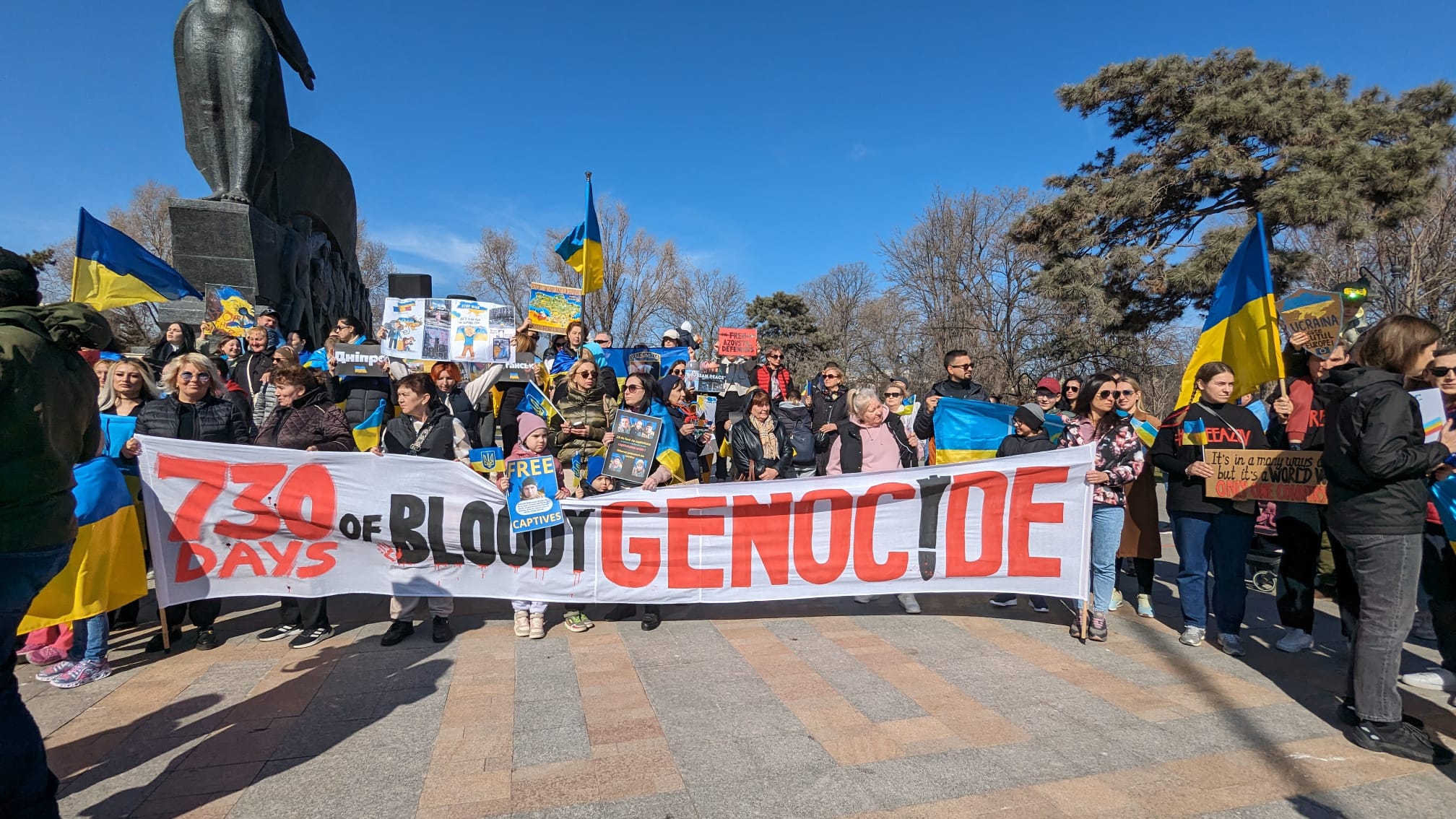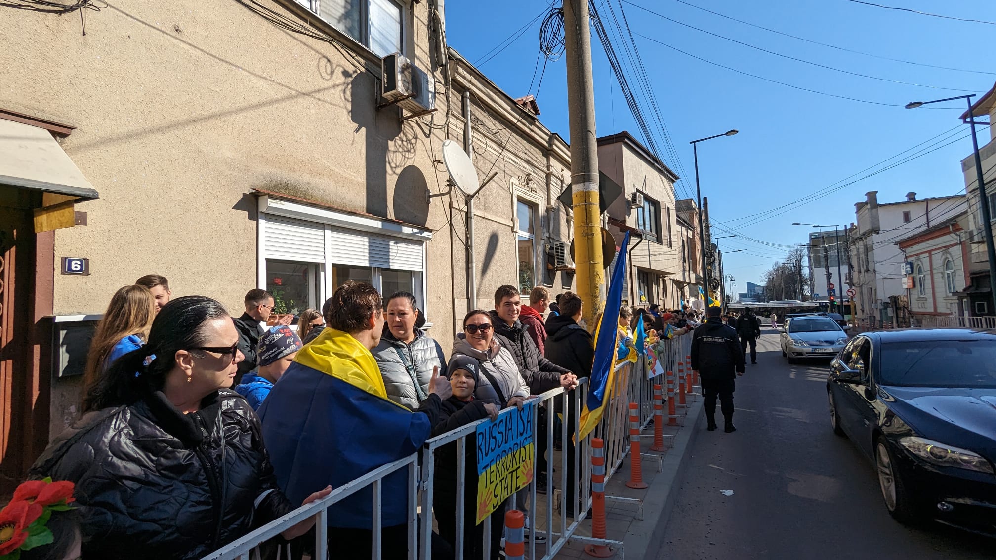 Ne-am adunat pentru a reaminti lumii de cei doi ani sângeroși de genocid al poporului ucrainean. Deja de doi ani Rusia comite crime împotriva populației civile, violează femei și copii, ucide oameni nevinovați, în fiecare zi pe front mor apărătorii noștri, printre ei mulți tineri băieți și fete care ar trebui să aibă toată viața înainte… Ucrainenii apără acum nu doar patria lor, ci și întreaga Europă. Imaginați-vă, războiul este doar la 150 de km de locul în care ne aflăm acum… Dacă nu oprim acum agresorul, rușii vor ocupa Ucraina, vor veni cu războiul în Moldova, țările baltice, alte țări vecine ale Uniunii Europene. Militarilor noștri le este necesar armament! Suntem recunoscători României pentru primirea călduroasă, pentru ajutorul acordat militarilor noștri, pentru ajutorul acordat refugiaților noștri, dar… toți vrem să ne întoarcem acasă!, este mesajul Irynei, participantă la miting. Orașul ei natal, Oleshky (regiunea Herson), a fost ocupat de la începutul invaziei și acum este inundat în proporție de 80% din cauza distrugerii Hidrocentralei Kahovka, iar tatăl ei este prizonier de mai mult de un an și jumătate.